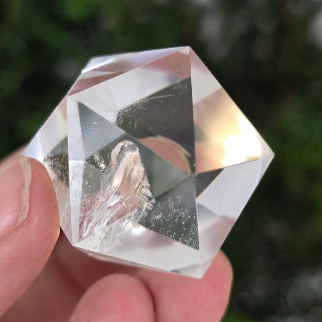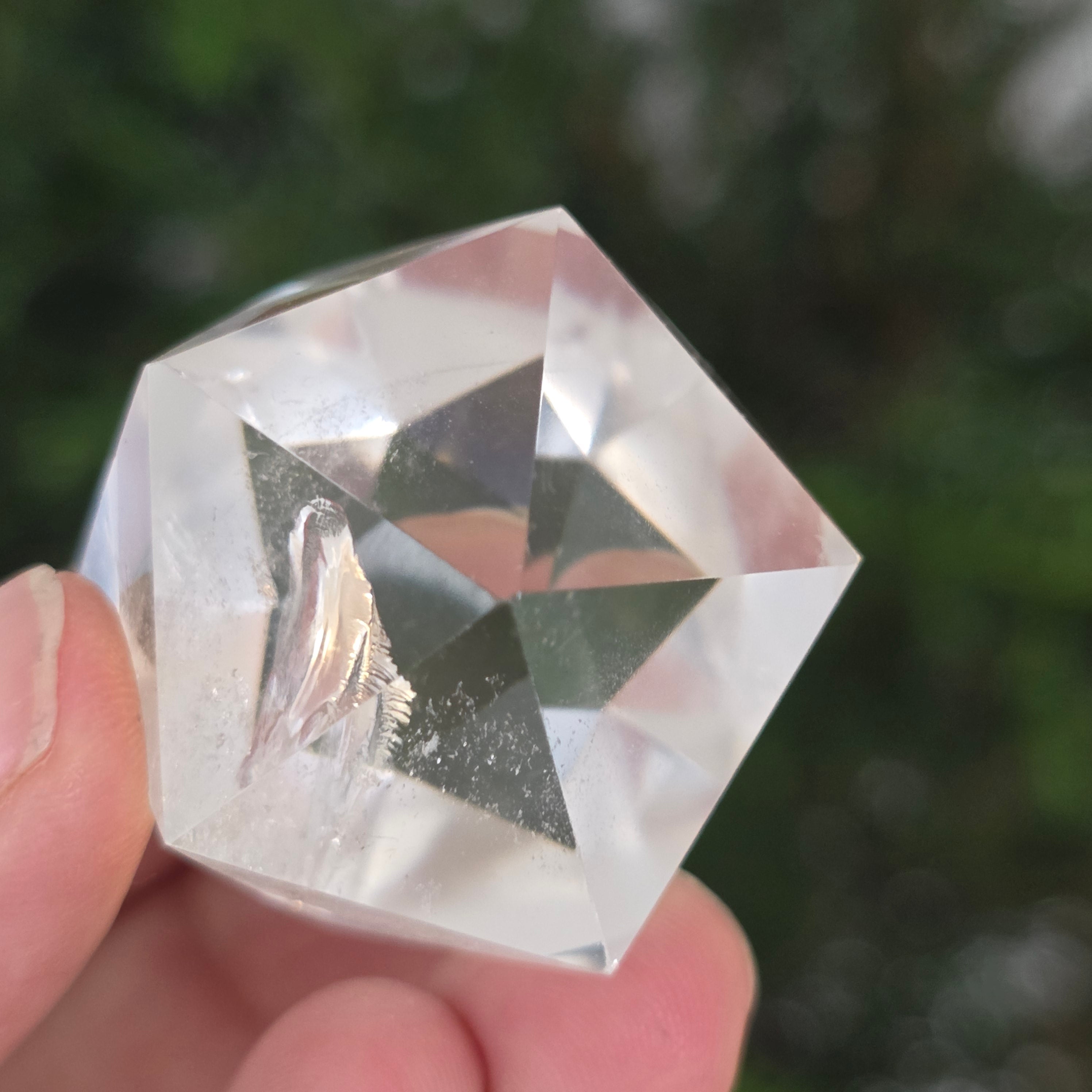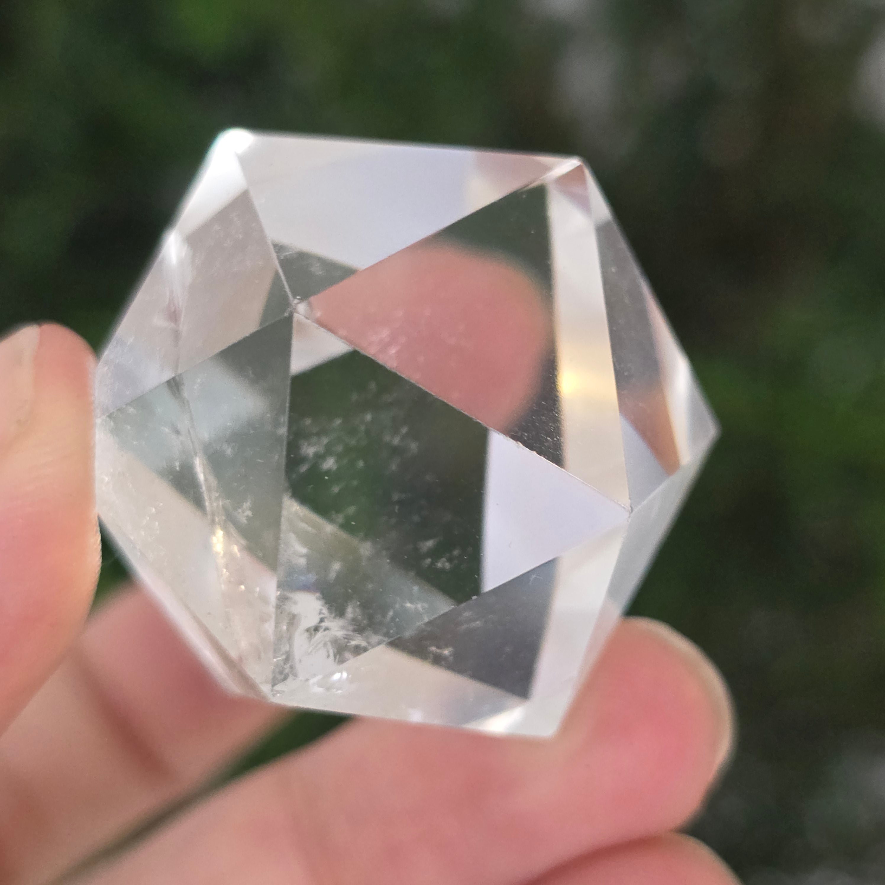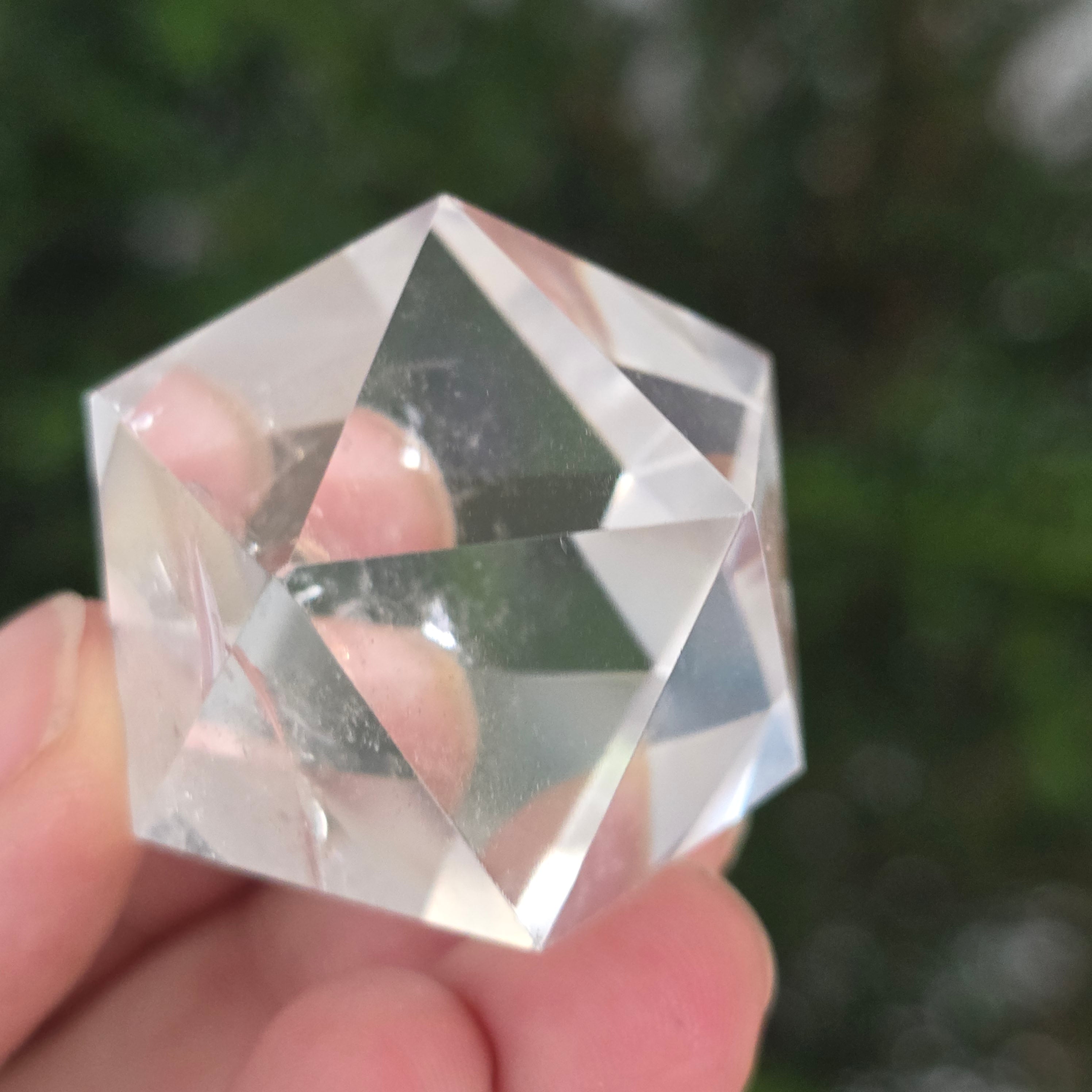 Άχρωμο εικοσάεδρο χαλαζία (κρύσταλλος βράχου), στιλβωμένο με ακρίβεια σε σχήμα πλατωνικού σώματος με 20 ισόπλευρες τριγωνικές όψεις.