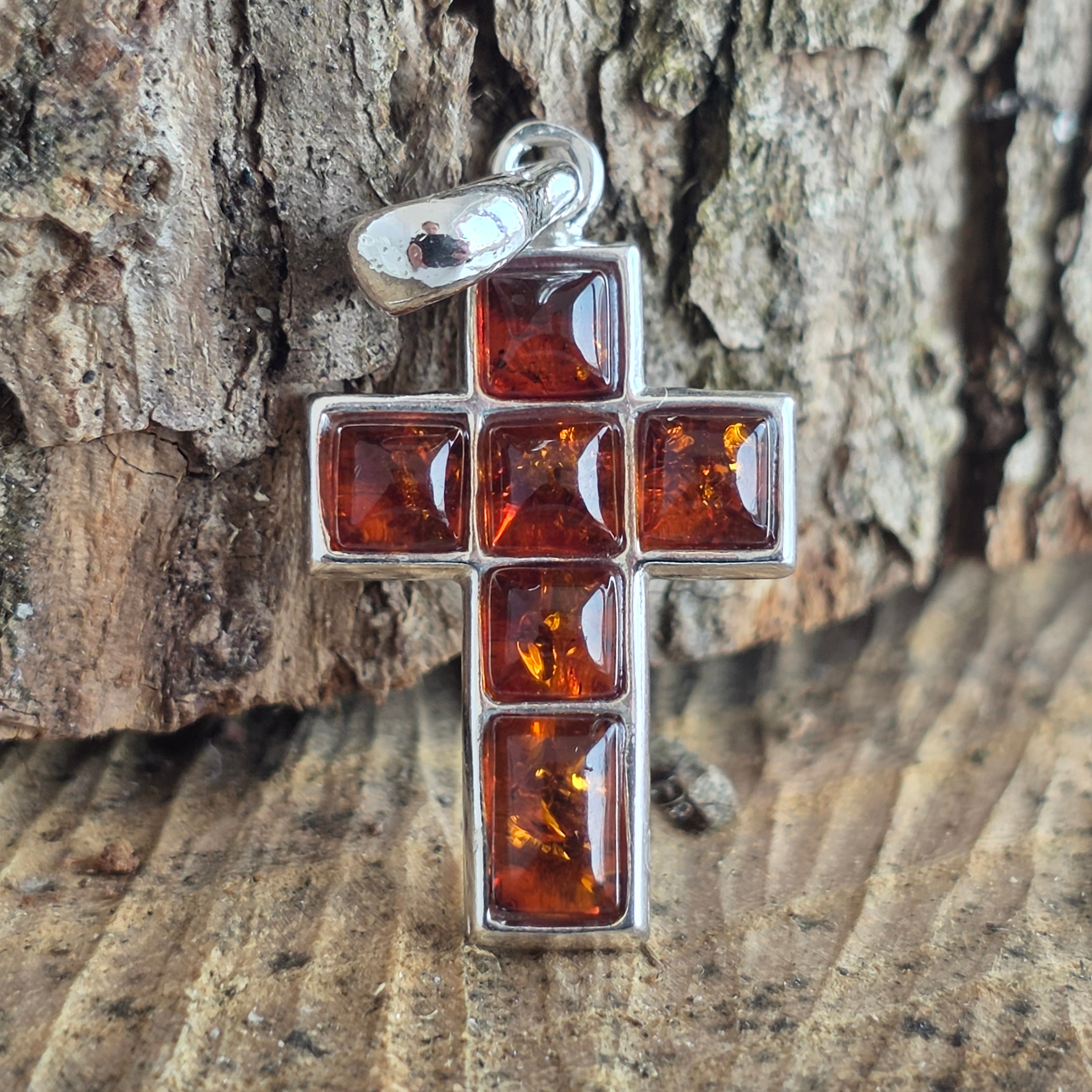 Περιγραφή - Κρεμαστό ασημένιο με κεχριμπάρι σε σχήμα σταυρού Amber30