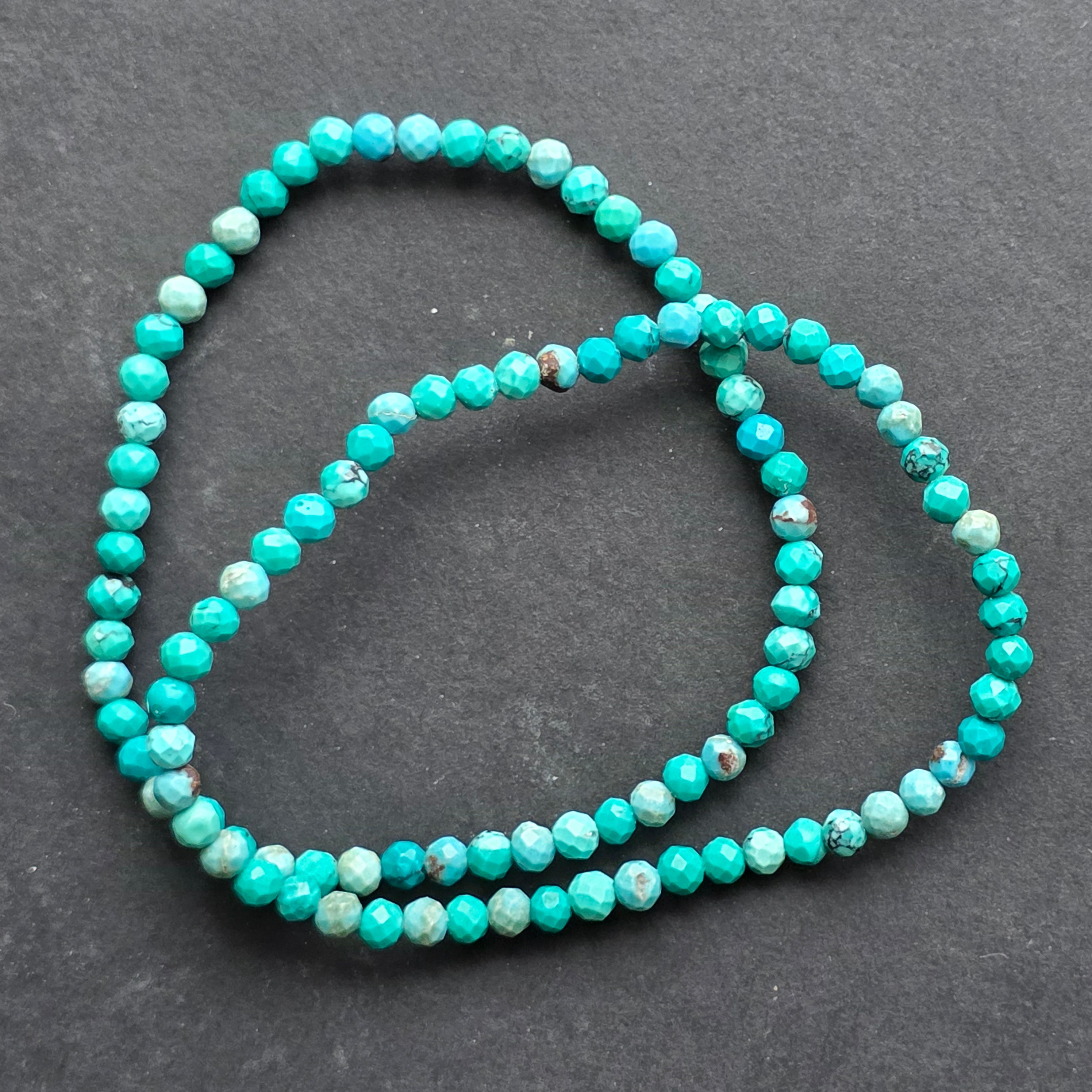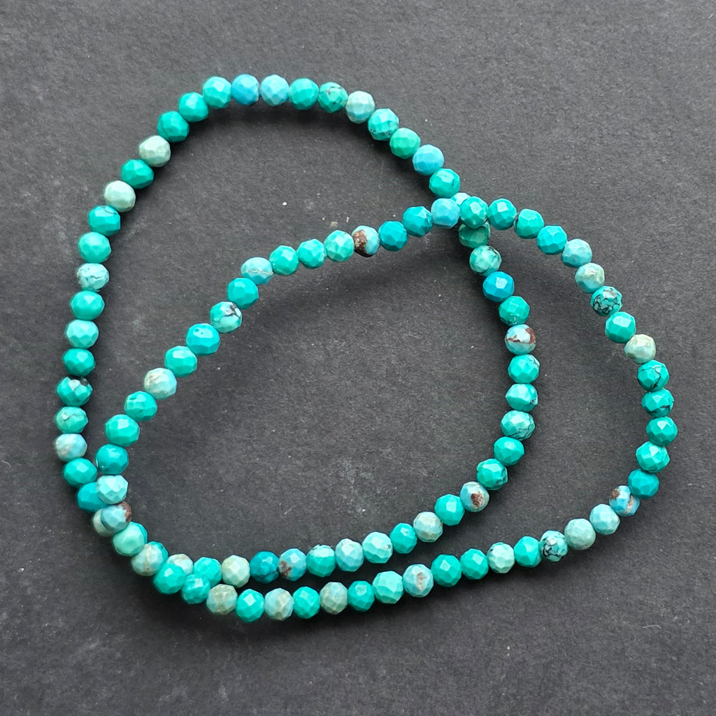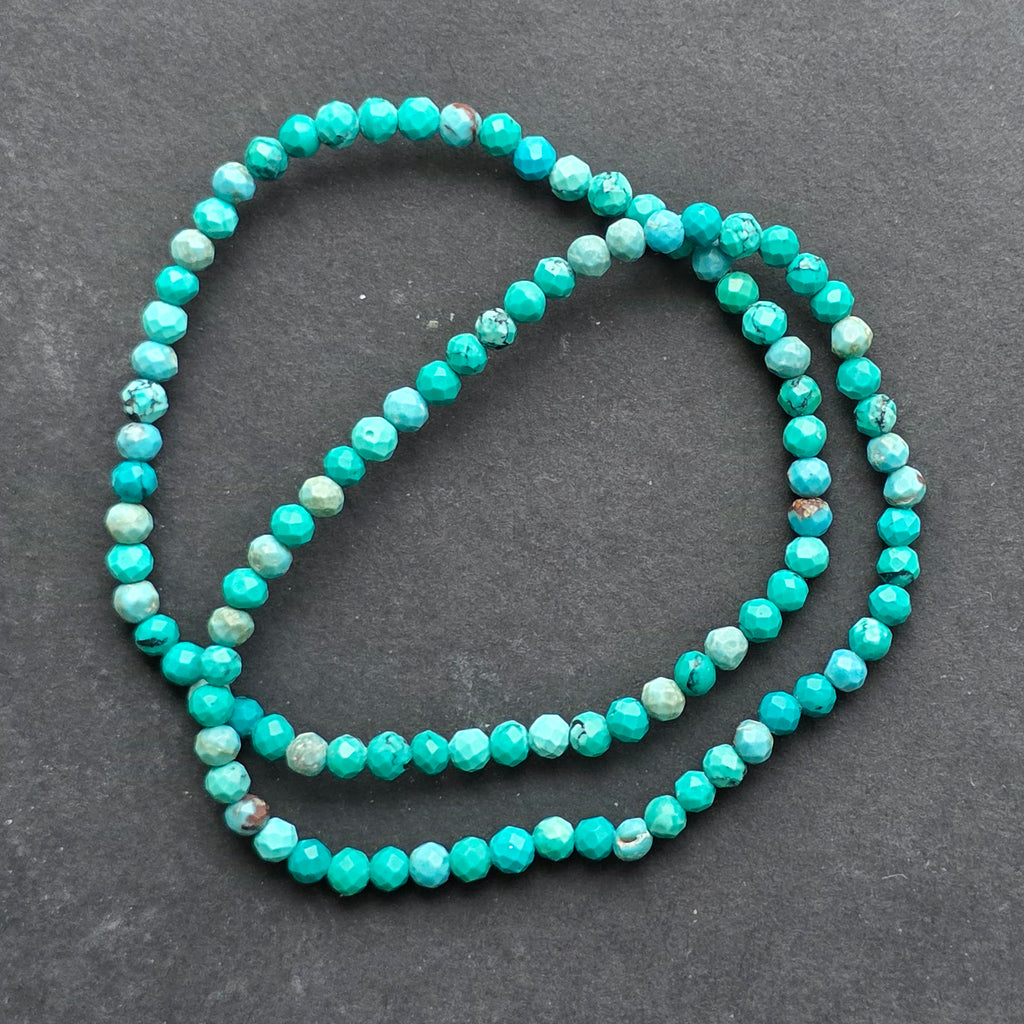 Ένα βραχιόλι που κουβαλά τα χρώματα του ουρανού και της ερήμου, συνδυασμένα σε μια διαχρονική λάμψη. Οι χάντρες πολύπλευρο φυσικό τυρκουάζ, με διάμετρο από 4 χλστ, αντανακλά μια γοητευτική γκάμα μπλε και πράσινων τόνων, με λεπτές φλέβες χαλκού και καφέ που τους δίνουν έναν μοναδικό και γήινο χαρακτήρα. Η λεπτή τους λάμψη φέρνει έναν αέρα γαλήνης, προστασίας και συγκρατημένης αρχοντιάς.