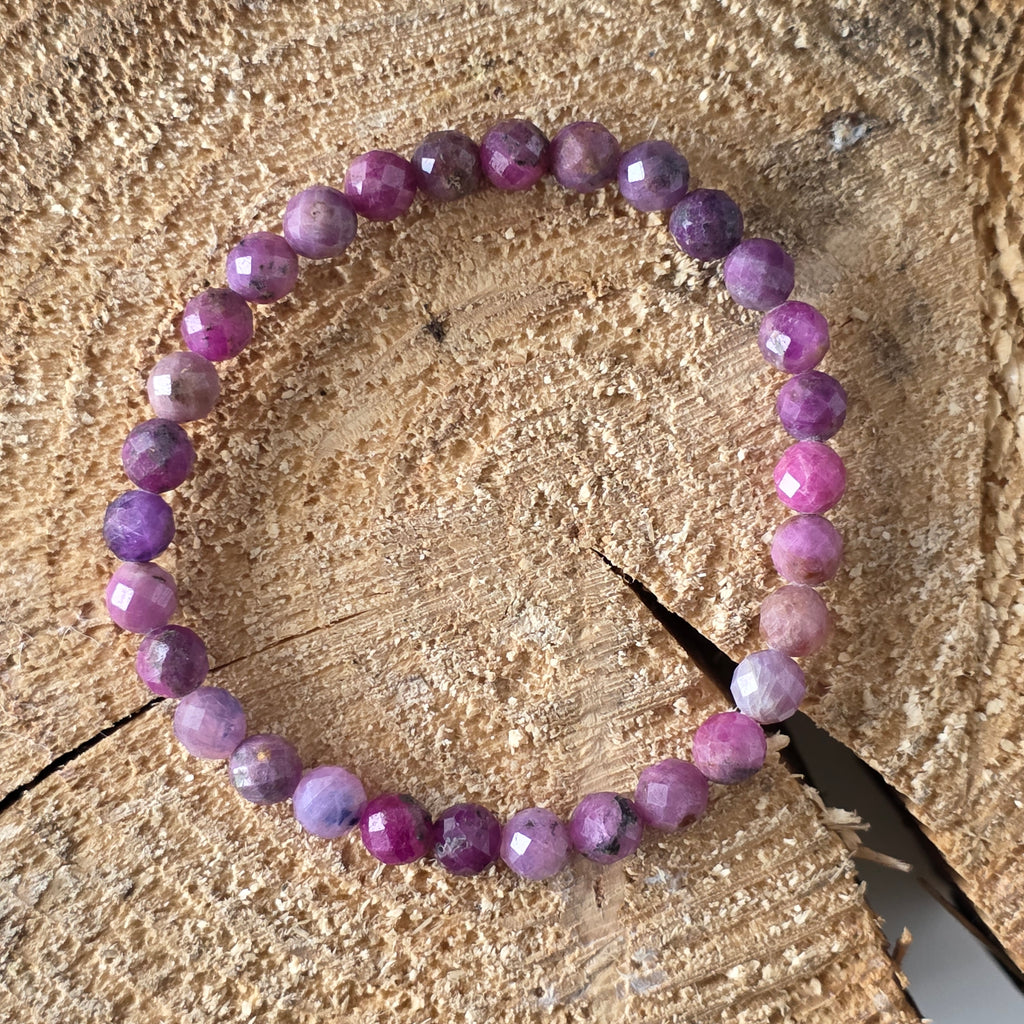 Ένα βραχιόλι που κουβαλά μέσα του τη ζωντανή φλόγα της ζωής. Οι χάντρες πολύπλευρο φυσικό ρουμπίνι, με διάμετρο από 6 mm, λάμπει σε πλούσιους βαθύ κόκκινους τόνους, μερικές φορές με βυσσινί τόνους ή βαθιές ανταύγειες κερασιού. Κάθε πέτρα μοιάζει να πάλλεται με μια ζεστή, ζωτική ενέργεια, σαν μια καρδιά που χτυπά στο ρυθμό της δικής της κλήσης.