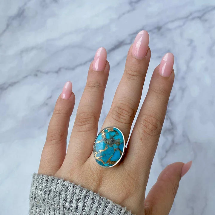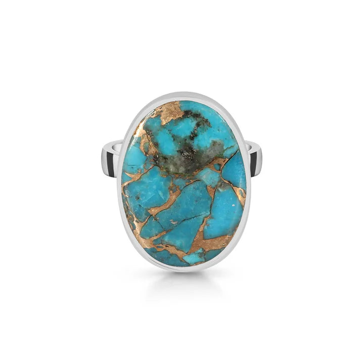 Ένα κομψό δαχτυλίδι από ασήμι 925, με φυσική πέτρα τιρκουάζ με αποχρώσεις που κυμαίνονται από γαλάζιο ουρανού έως θαλασσινό πράσινο, διασχισμένη από λεπτές καστανές και γκρι φλέβες. Ο μινιμαλιστικός σχεδιασμός τύπου plain collet επιτρέπει όλη την προσοχή στην πέτρα, αναδεικνύοντας την οργανική ομορφιά και την αυθεντική υφή της.