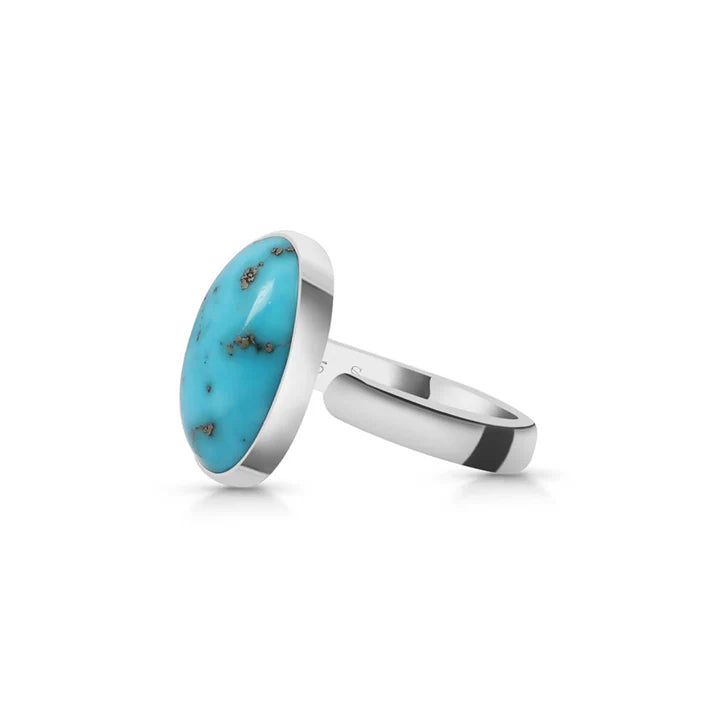 Ένα κομψό δαχτυλίδι από ασήμι 925, με φυσική τυρκουάζ πέτρα με αποχρώσεις που ποικίλλουν μεταξύ του μπλε του ουρανού και του πράσινου του νερού, που διασχίζονται από λεπτές καφέ και γκρι φλέβες. Μινιμαλιστικός τύπος σχεδίασης σκέτο κολέττα Αφήνει όλη την προσοχή στην πέτρα, αναδεικνύοντας την οργανική ομορφιά και την αυθεντική υφή της.