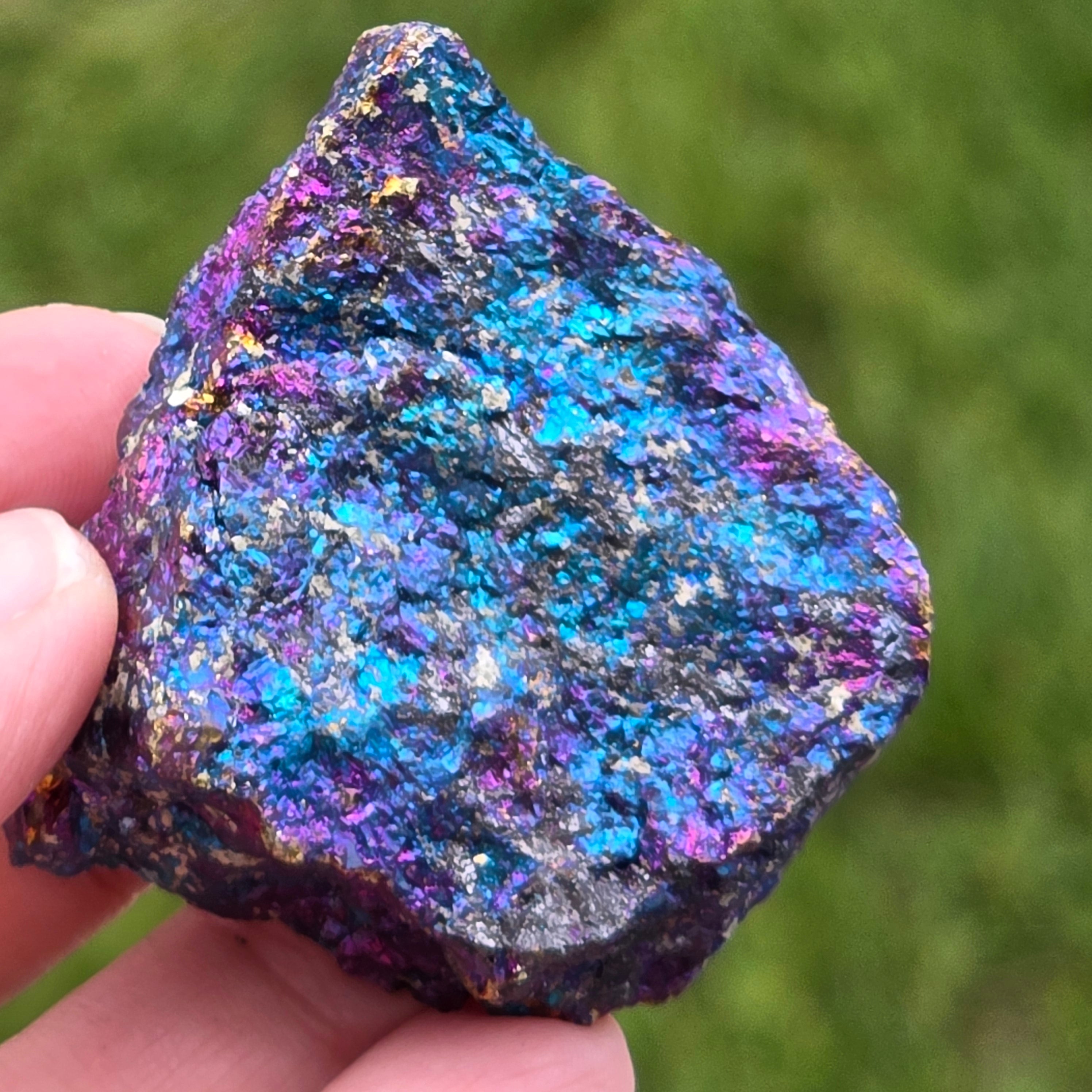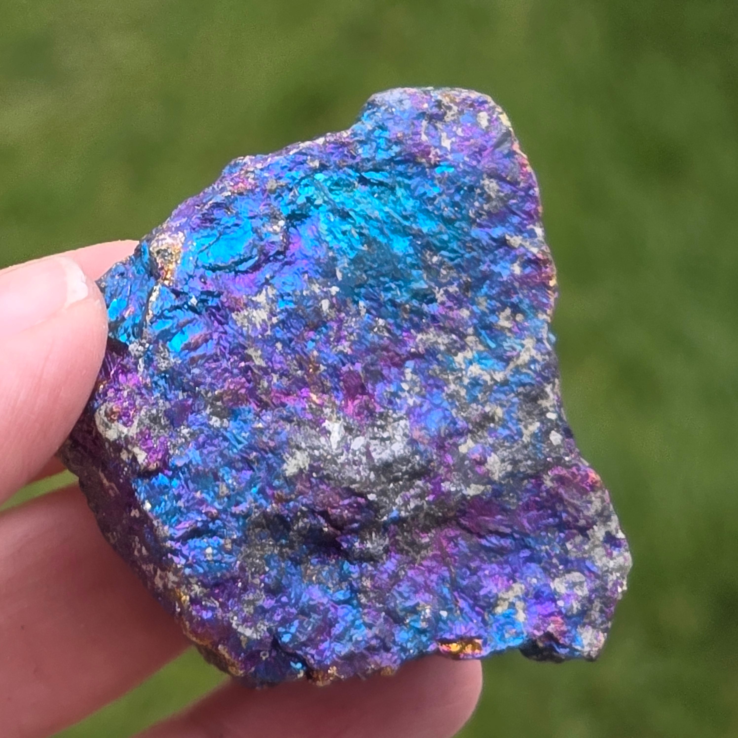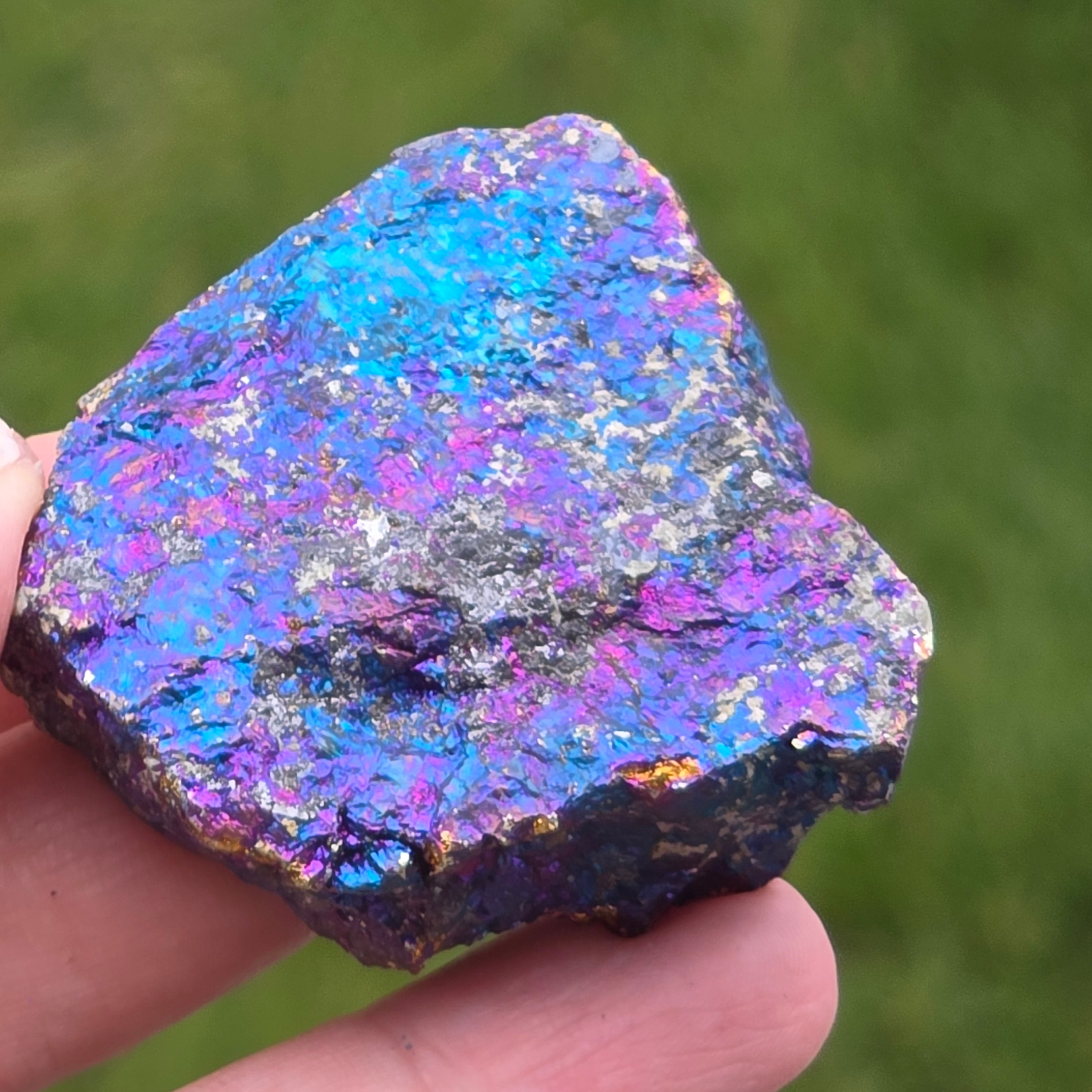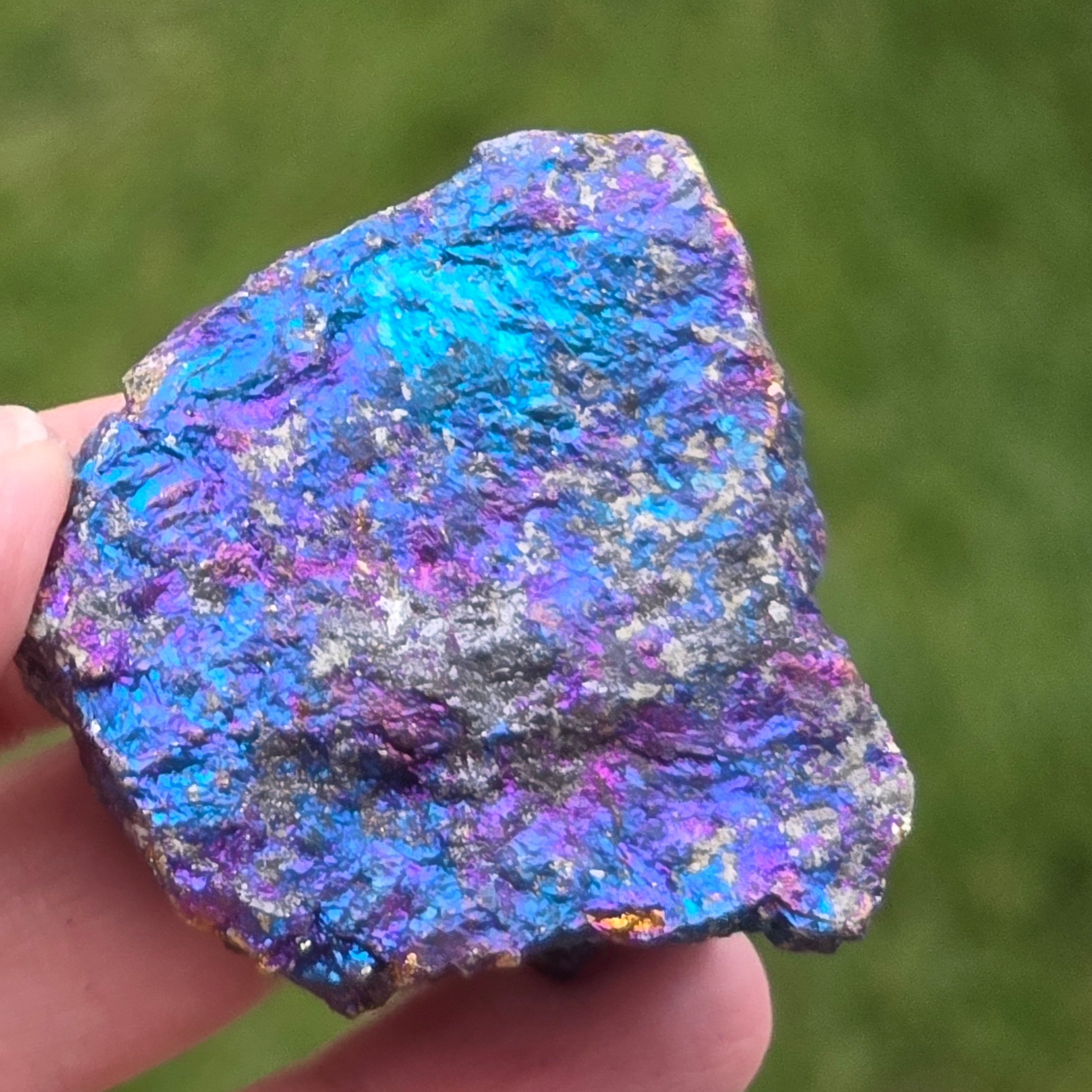 Οι μπλε και μοβ χαλκοπυρίτες συνδέονται με την πνευματική ανάπτυξη, τη διαίσθηση και τη σύνδεση με ανώτερες ενέργειες. Πιστεύεται ότι βοηθά να ηρεμήσει το μυαλό και να τονώσει τη δημιουργικότητα. Οι ιριδίζουσες αποχρώσεις του συνδέονται συμβολικά με την ισορροπία και την αρμονία.