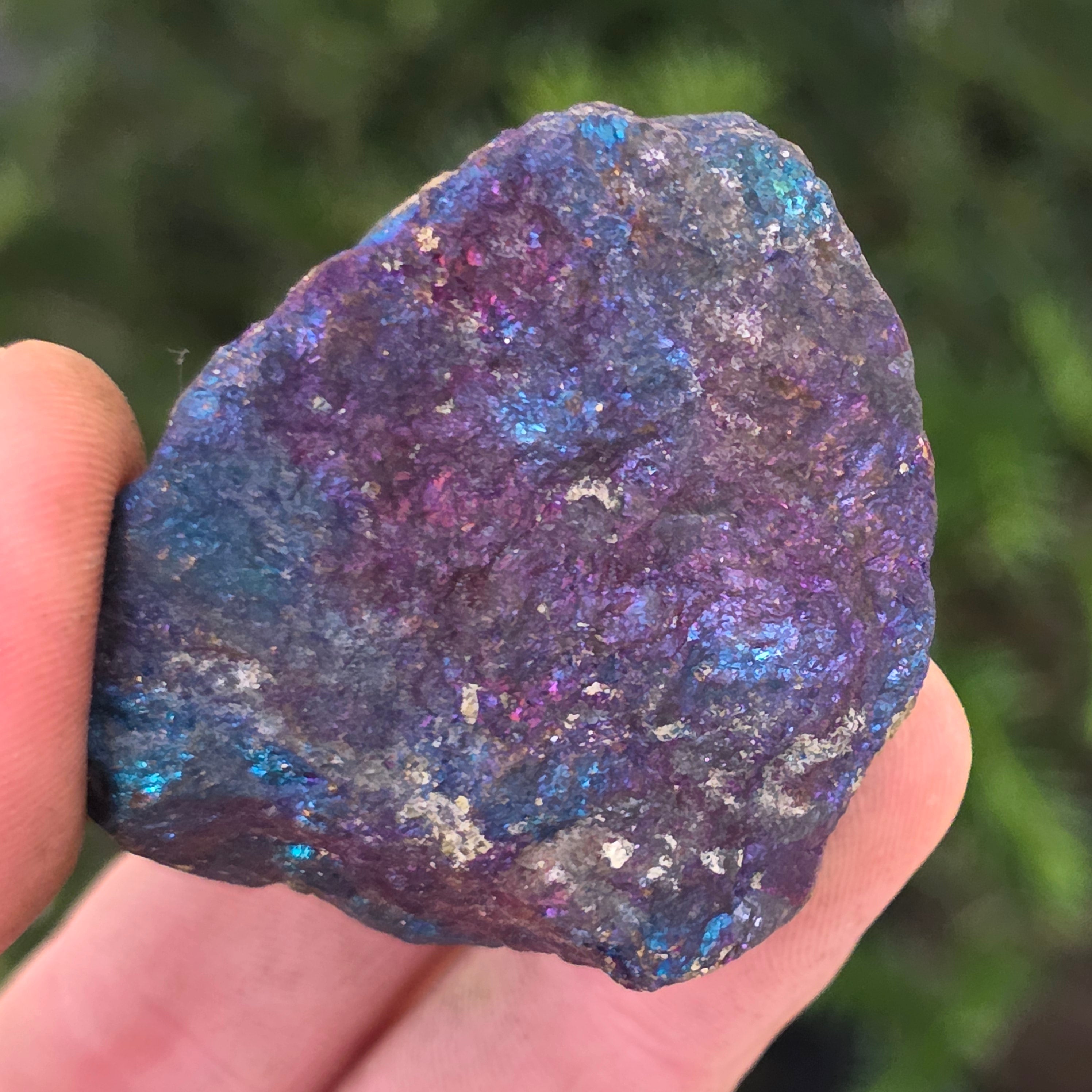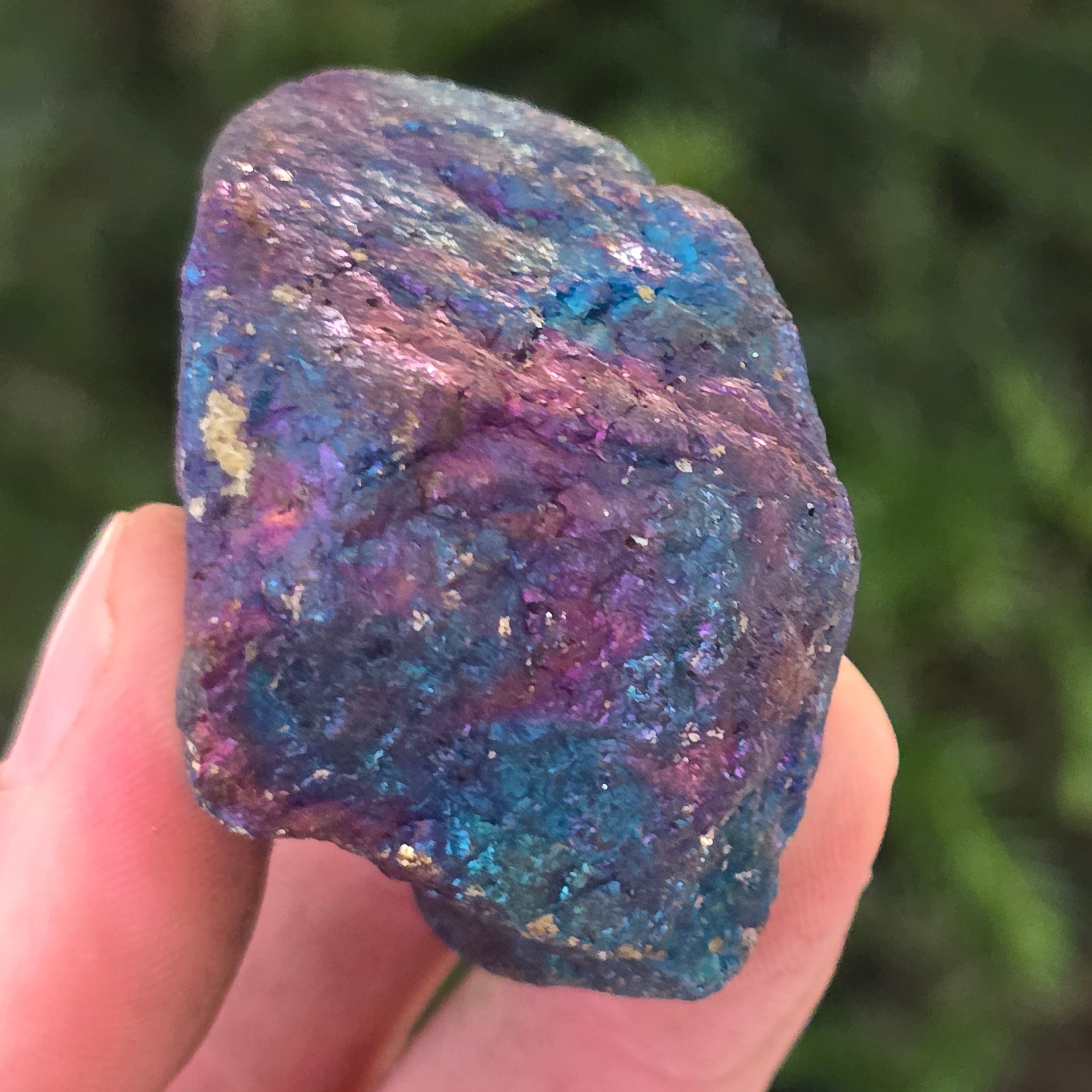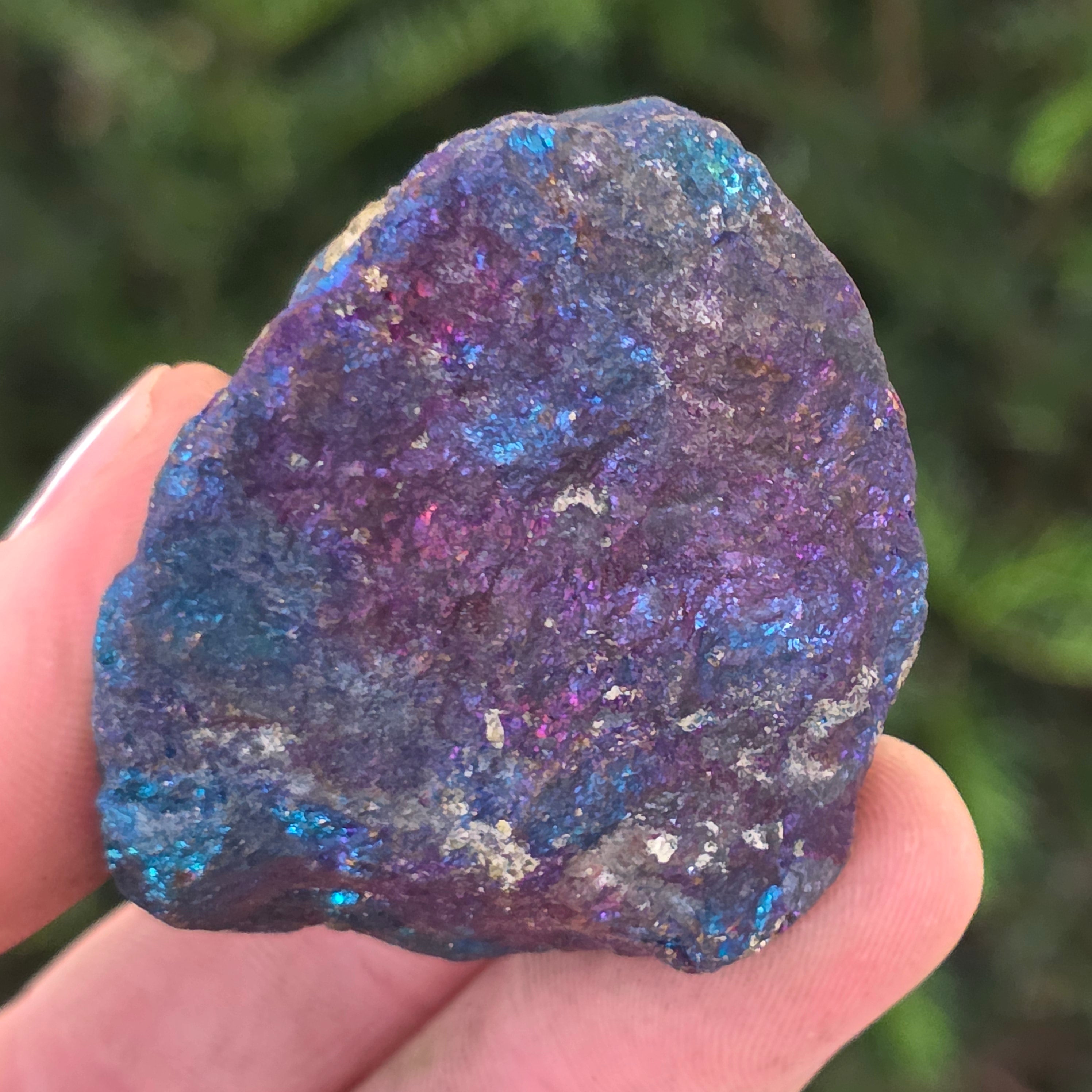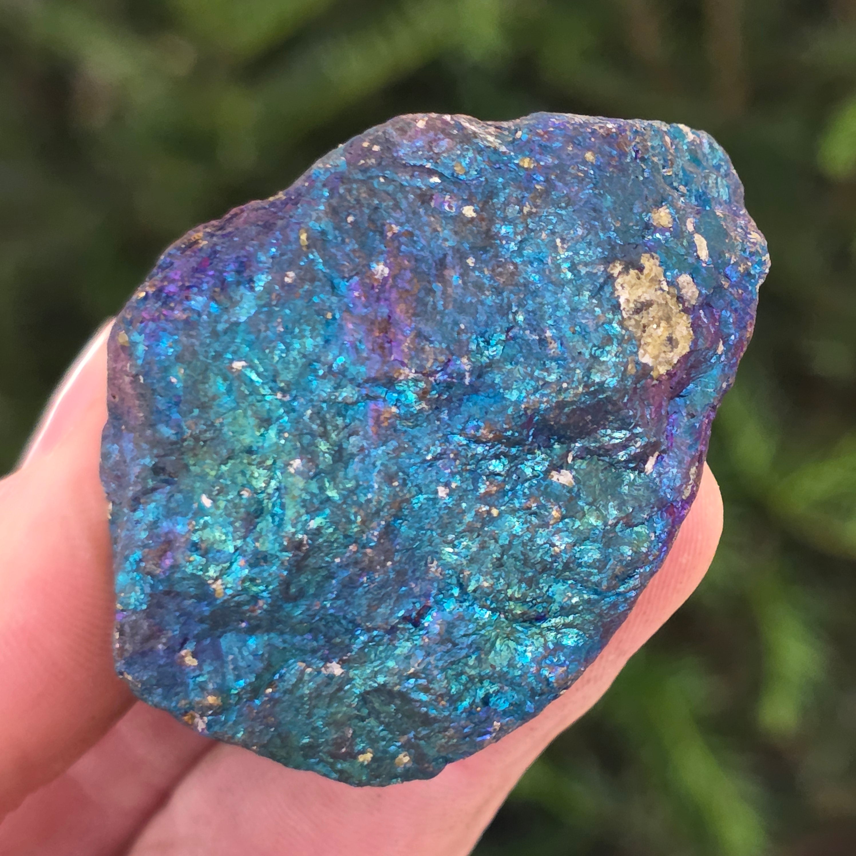 Η μπλε χαλκοπυρίτης, γνωστή επίσης ως ιριδίζουσα χαλκοπυρίτης, είναι ένας τύπος χαλκοπυρίτη που παρουσιάζει λαμπερές αποχρώσεις μπλε, μοβ, πράσινου ή άλλων ιριδίζοντων χρωμάτων. Αυτή η ιριδισμός προκαλείται από ένα λεπτό στρώμα οξείδωσης στην επιφάνεια του ορυκτού, μια φυσική διαδικασία που συμβαίνει όταν η χαλκοπυρίτης εκτίθεται στον αέρα και την υγρασία για μεγάλο χρονικό διάστημα.