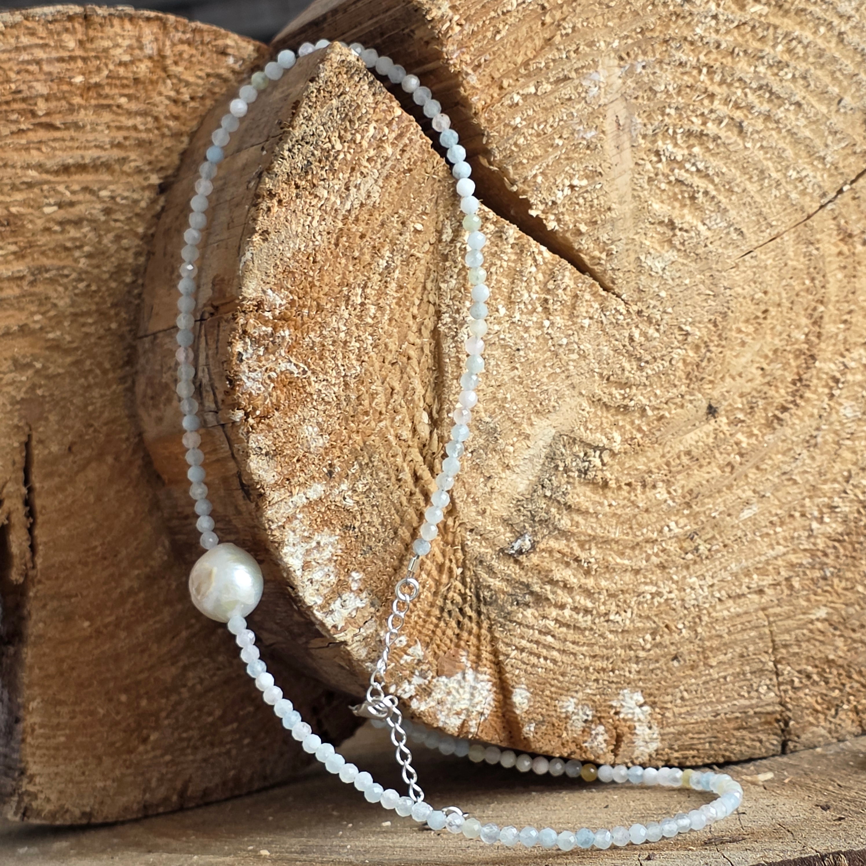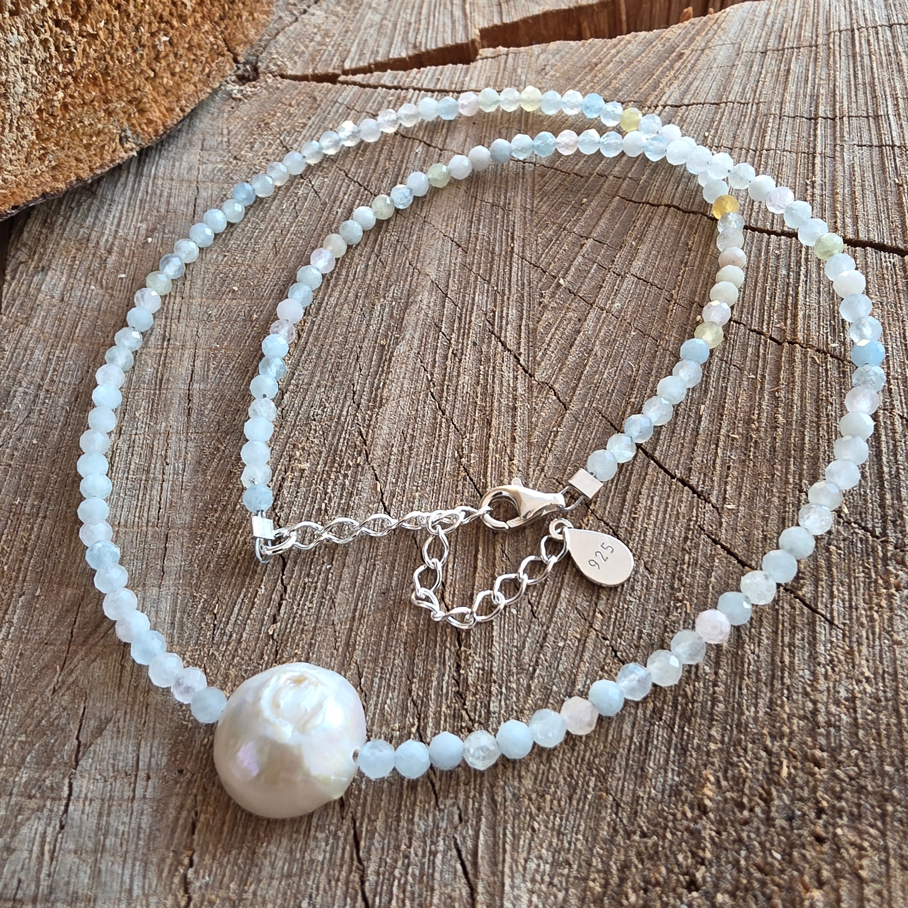 Η ακουαμαρίνη είναι η πέτρα της συναισθηματικής διαύγειας, της ειλικρινούς επικοινωνίας και της εμπιστοσύνης στην προσωπική αλήθεια. Λέγεται ότι ηρεμεί την καρδιά, διώχνει το άγχος και φέρνει ήπιο θάρρος. Τα μαργαριτάρια συμπληρώνουν αυτή τη δόνηση με την διαχρονική τους χάρη – σύμβολα διαισθητικότητας, καλοσύνης και αρμονίας.