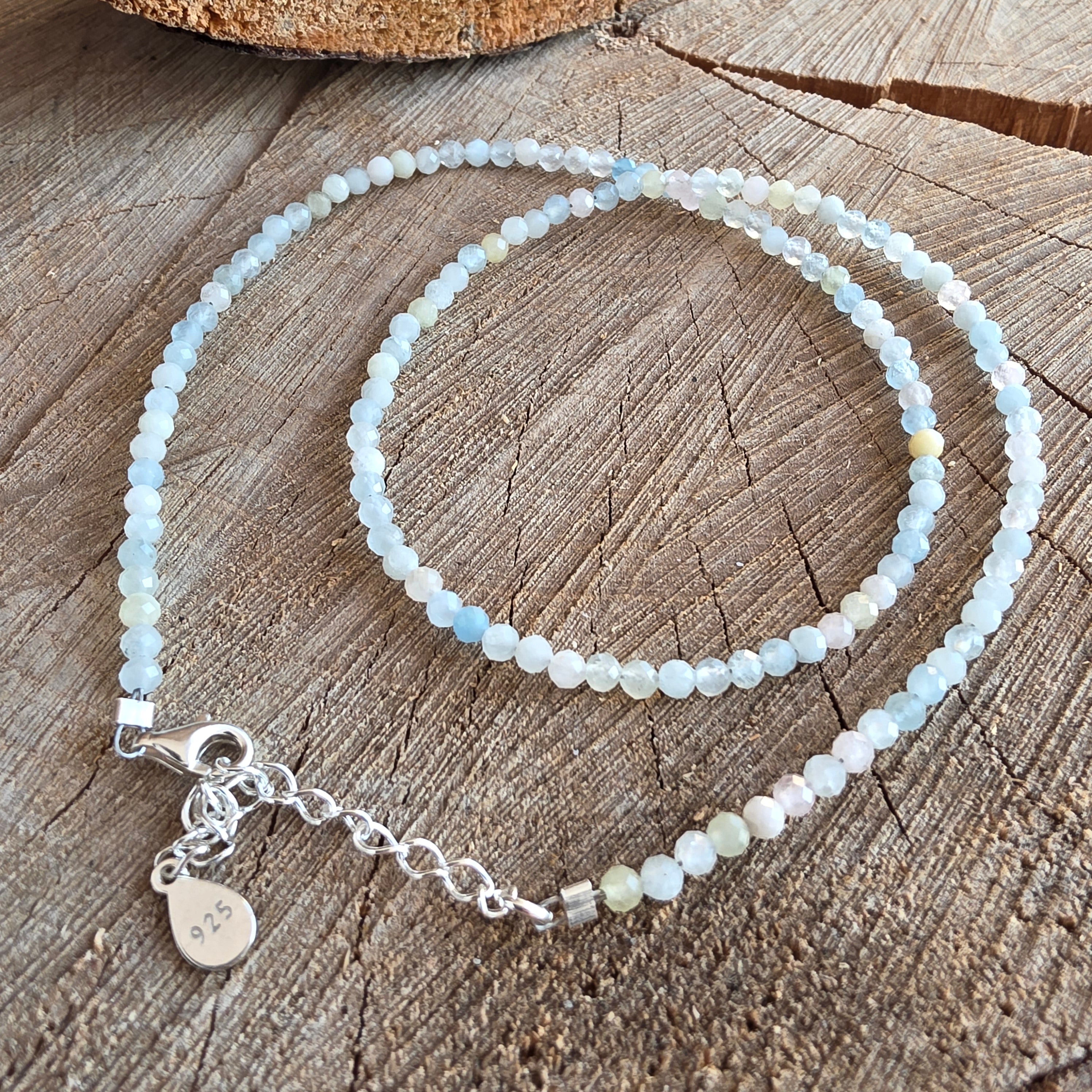 Η ακουαμαρίνη είναι η πέτρα της συναισθηματικής καθαρότητας, της ειλικρινούς επικοινωνίας και της εμπιστοσύνης στην προσωπική αλήθεια. Λέγεται ότι ηρεμεί την καρδιά, διώχνει το άγχος και φέρνει ήπιο θάρρος. Οι πέρλες συμπληρώνουν αυτή τη δόνηση με τη διαχρονική τους χάρη – σύμβολα διαίσθησης, ευγένειας και αρμονίας.