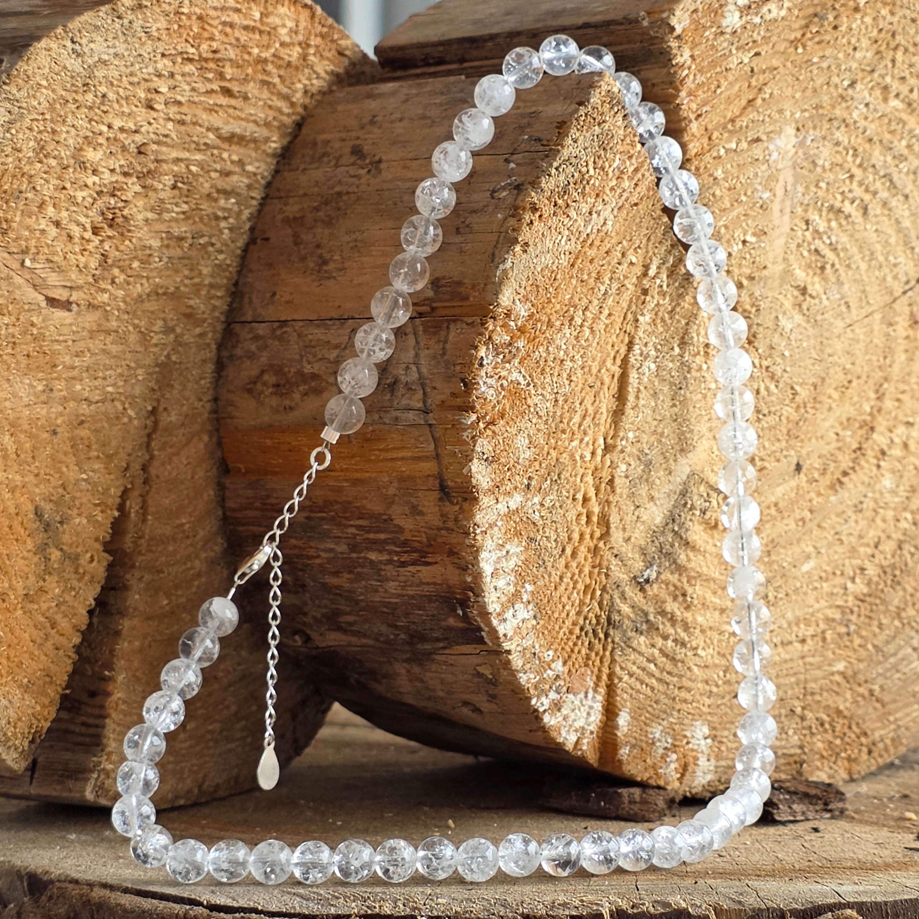 Ένα κολιέ που αποτυπώνει την ουσία της κρυστάλλινης ηρεμίας — μια ισορροπία μεταξύ ευθραυστότητας και δύναμης. Ο διαυγής χαλαζίας "crashed", με τις μοναδικές εσωτερικές υφές του, φαίνεται σαν ένα σύμπαν παγιδευμένο στο γυαλί, όπου το φως πολλαπλασιάζεται και μεταμορφώνεται. Κάθε σφαίρα 6 mm είναι ένα μικρό θαύμα της διαφάνειας, φέρνοντας μια ήρεμη, δροσερή και καθαρή ομορφιά.
