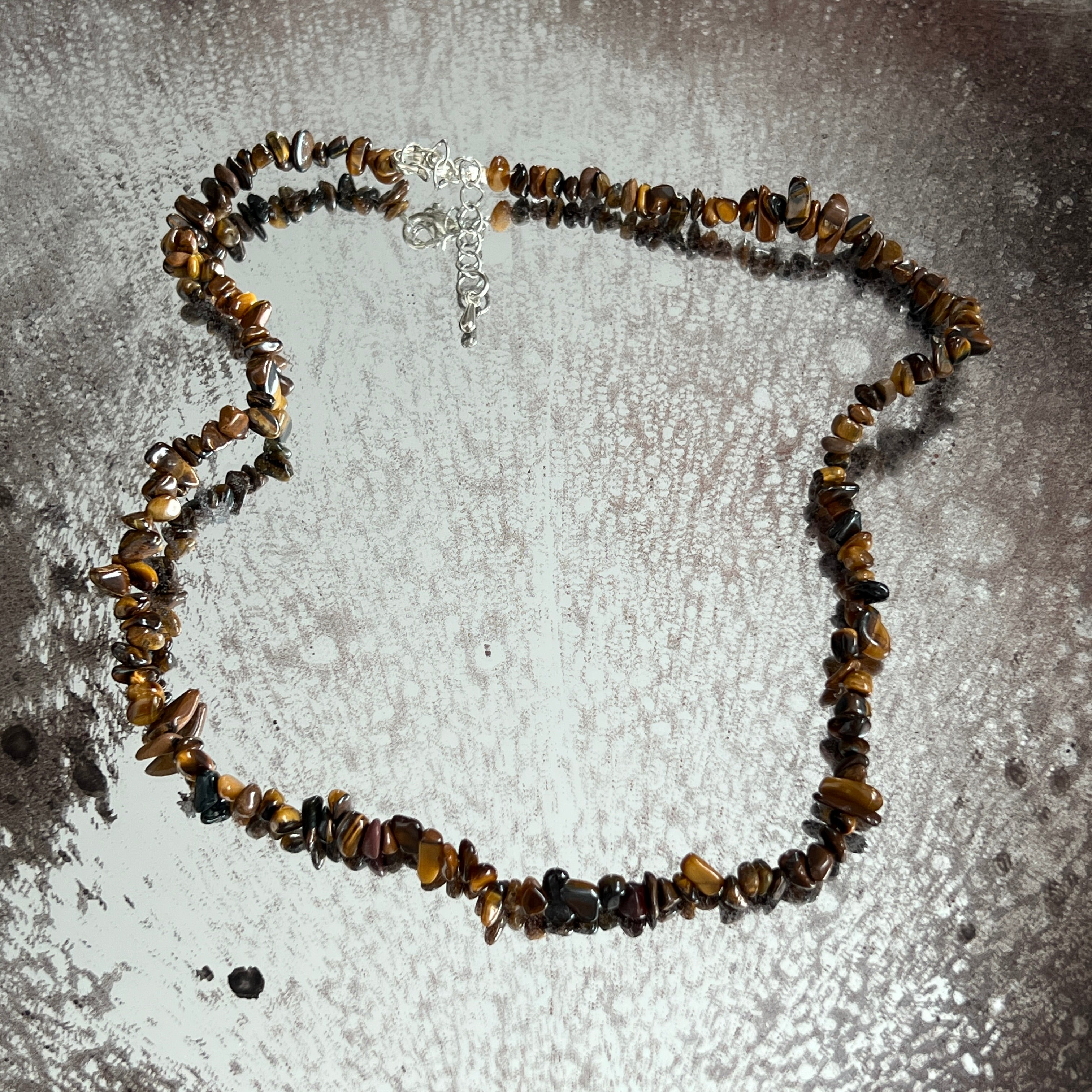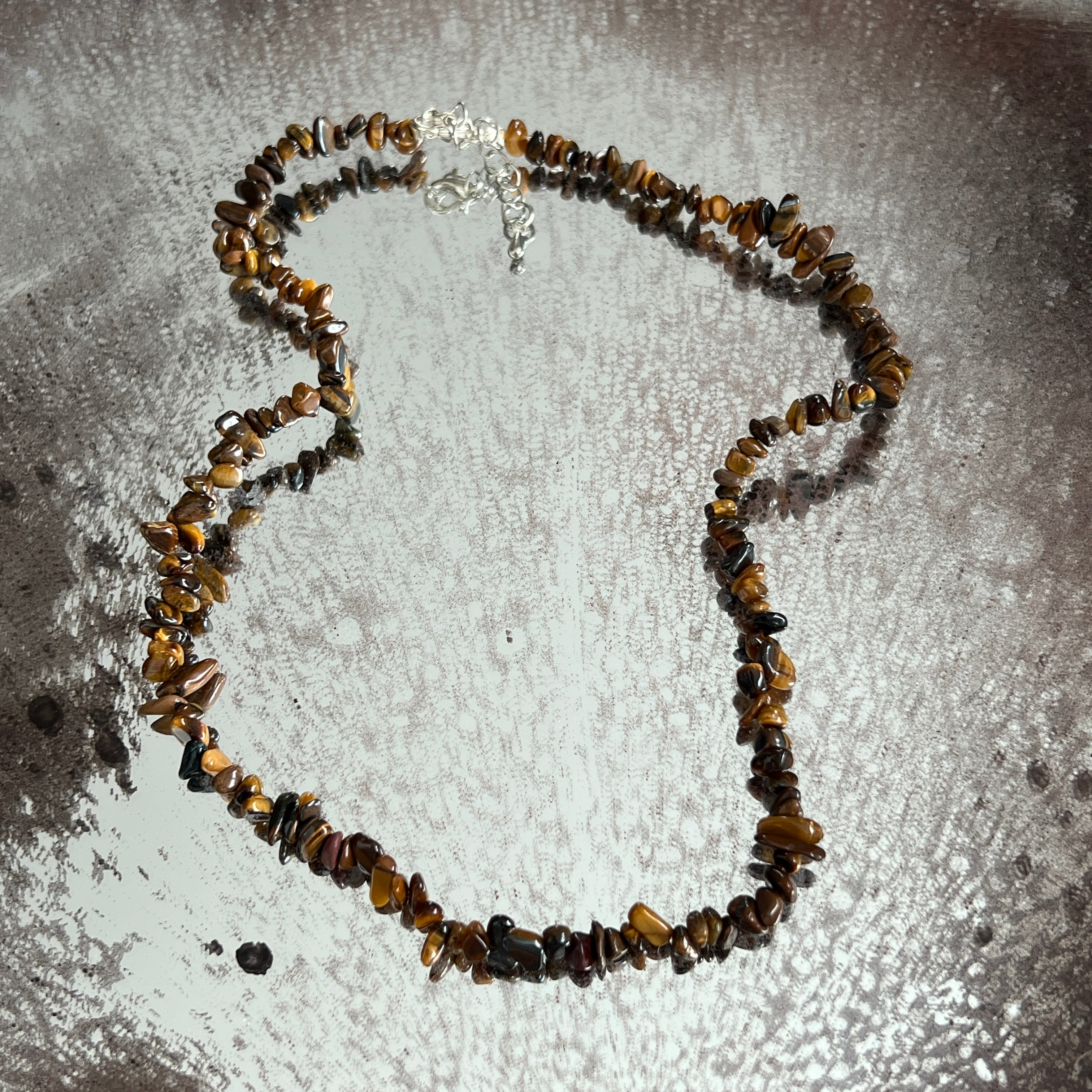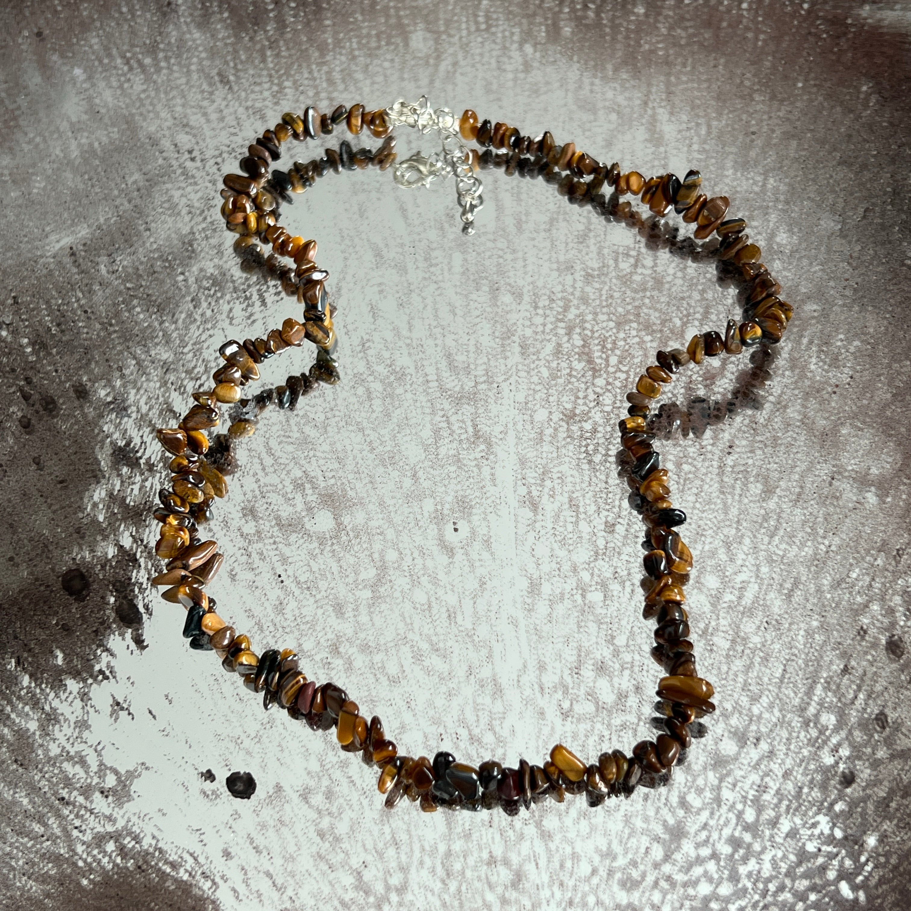 Ένα κολιέ γεμάτο οπτική δύναμη, φτιαγμένο από τσιπς φυστικού ματιού τίγρης – ένα από τα πιο αγαπημένα κρύσταλλα λόγω του οπτικού φαινομένου cat’s eye και των θερμών, χρυσοκαφέ αποχρώσεών του. Κάθε μικρό κομμάτι πέτρας ανακλά το φως διαφορετικά, δημιουργώντας μια ζωντανή, δυναμική δόνηση, με αντανακλάσεις που κινούνται μαζί με τον φορέα.