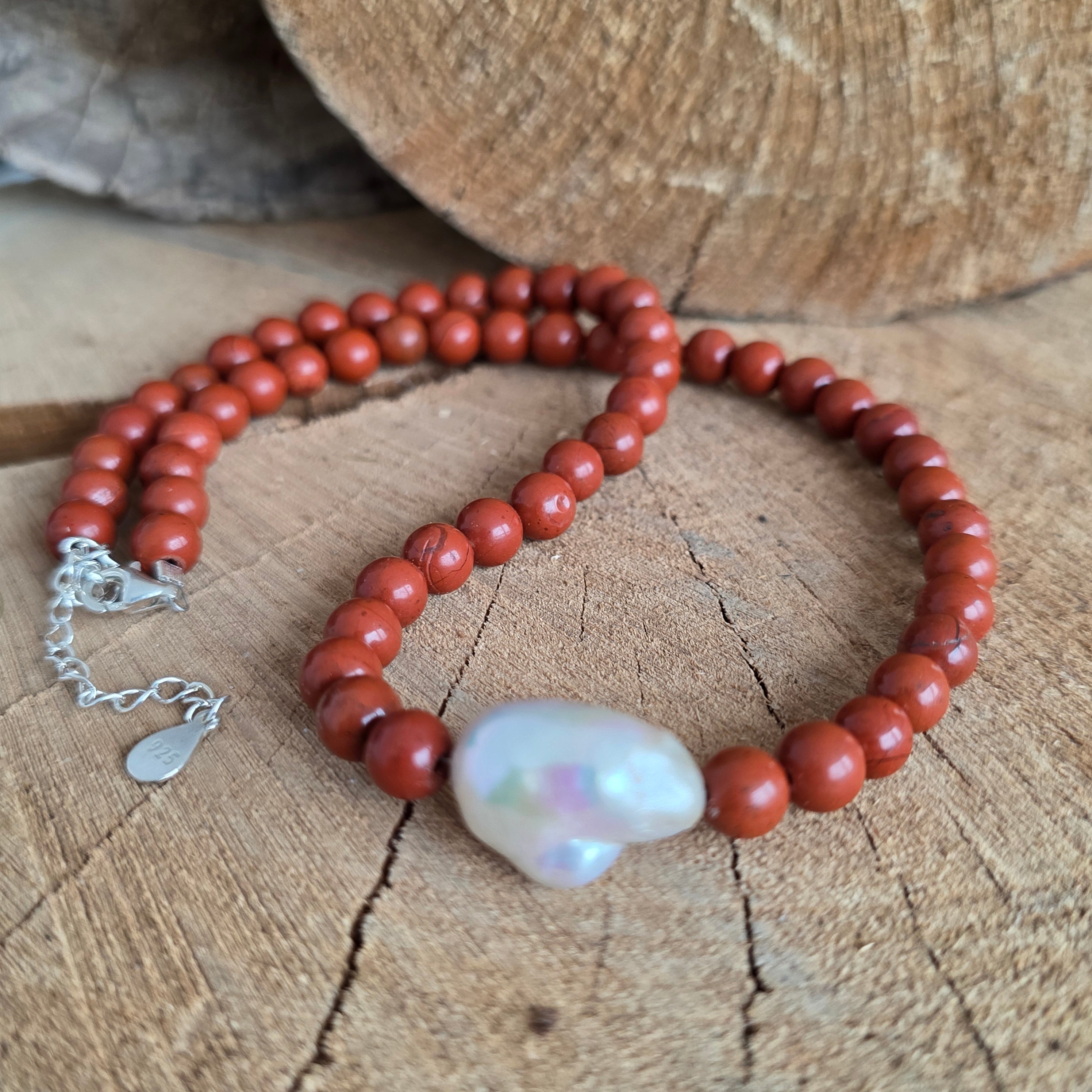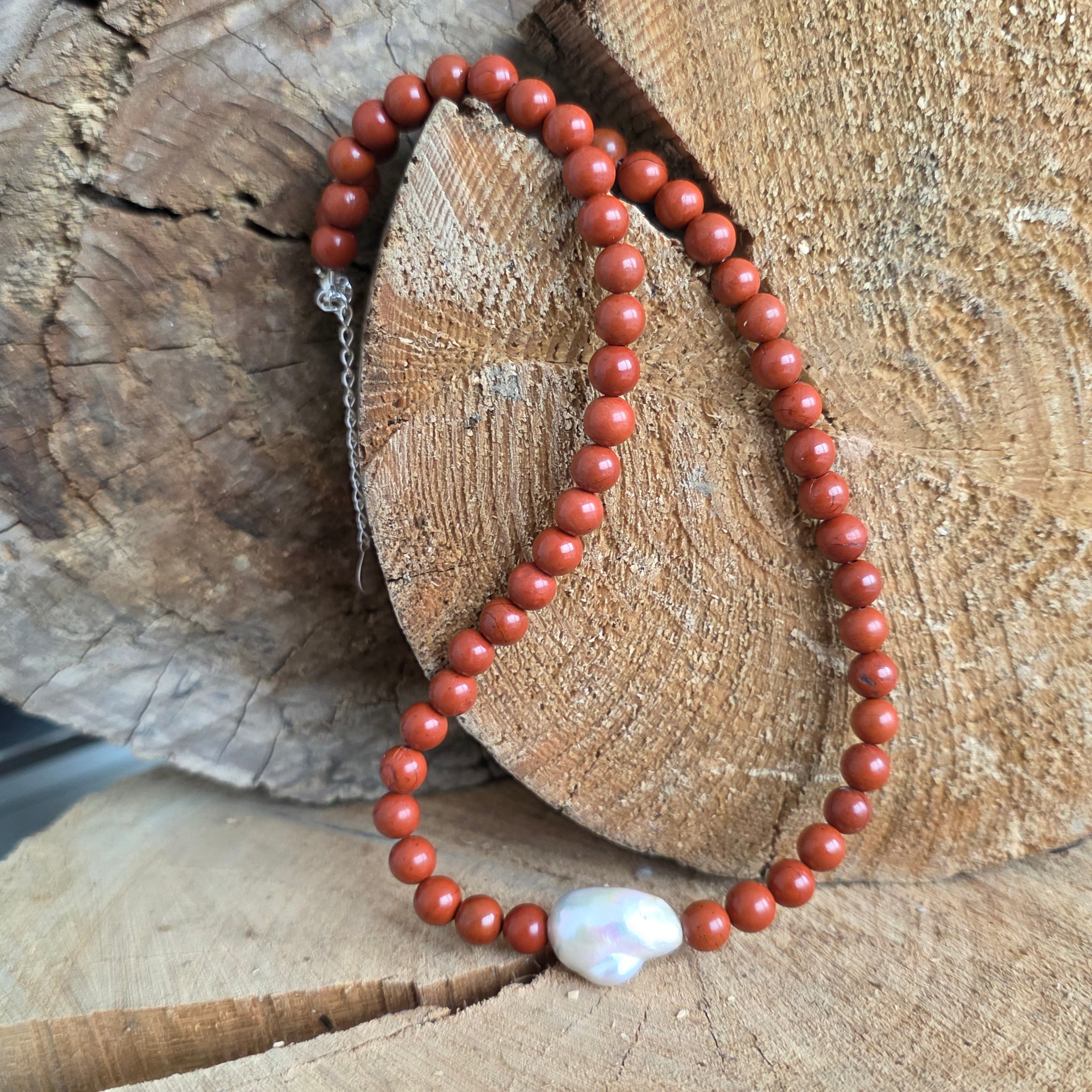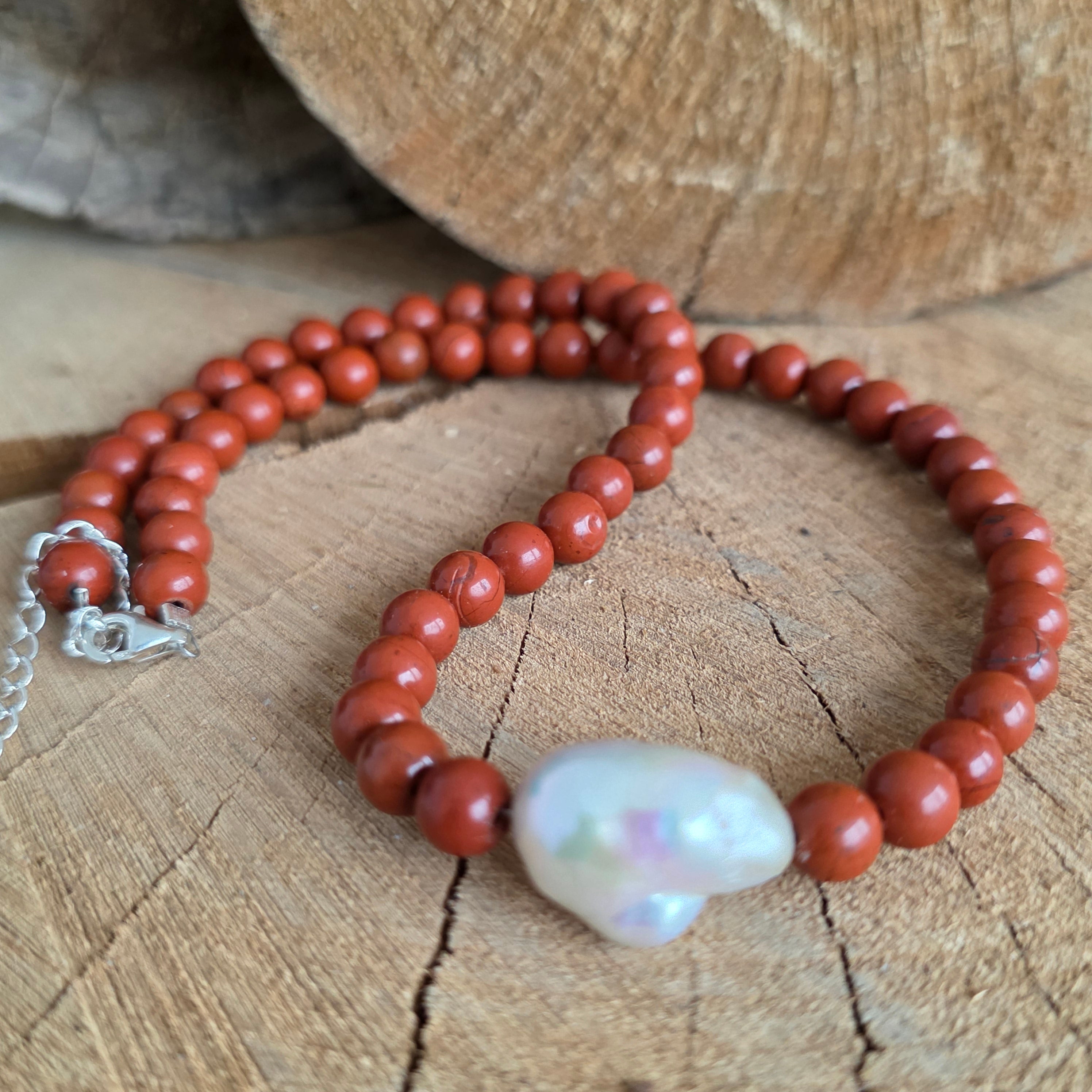 Ο κόκκινος ιάσπης θεωρείται λίθος της σταθερότητας, του κουράγιου και της ζωτικής ενέργειας. Λέγεται ότι ενισχύει τη σύνδεση με τη Γη, προσφέροντας εμπιστοσύνη, ασφάλεια και εσωτερική αντοχή. Σε συνδυασμό με το μαργαριτάρι, σύμβολο της καθαρότητας και της θηλυκότητας, το κολιέ γίνεται μια λεπτή έκφραση της αρμονίας μεταξύ δύναμης και χάρης.