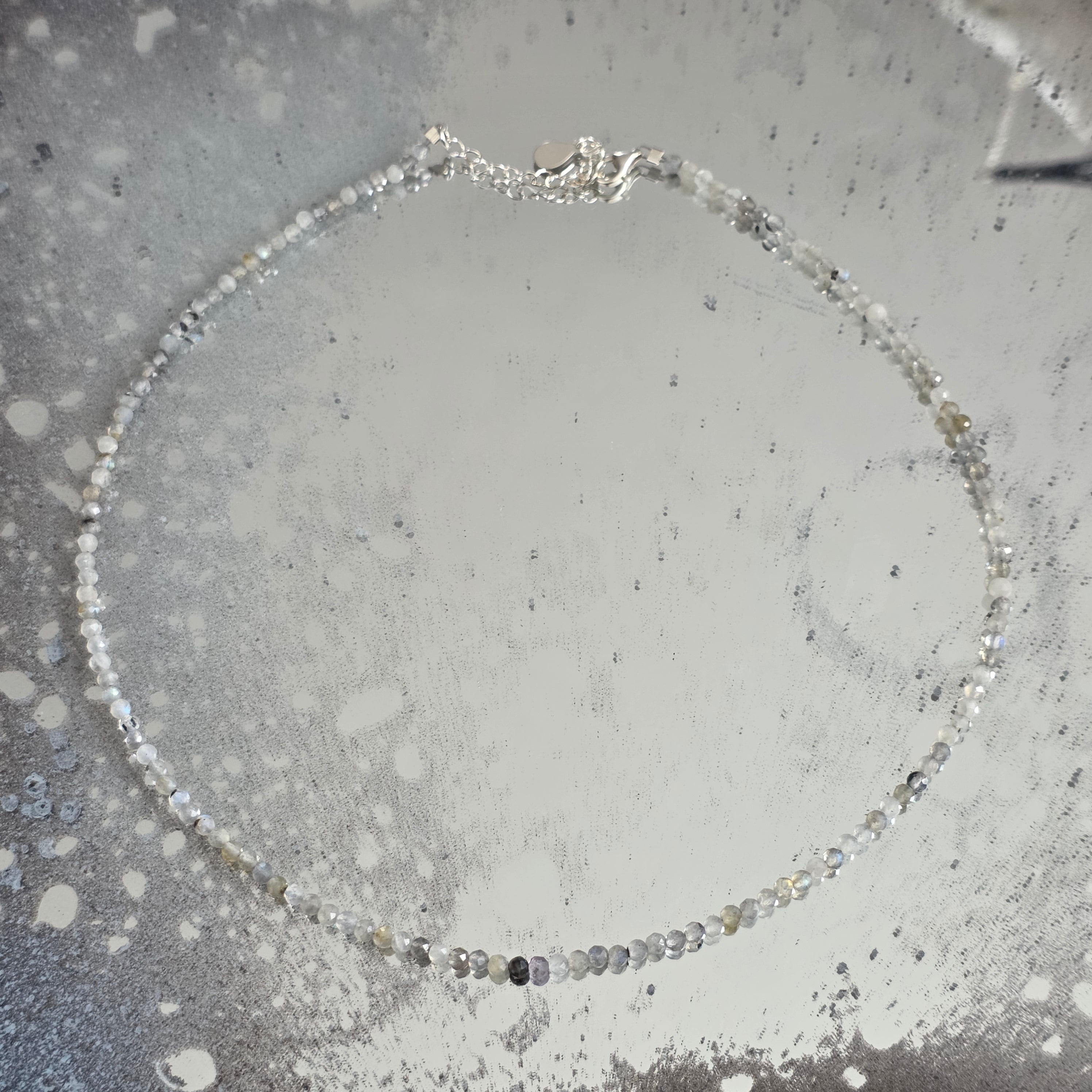 Ένα κόσμημα που συνδυάζει τη λεπτότητα και το μυστήριο – Το Κολιέ Labradorit AURA #131 είναι μια έκρηξη διακριτικού φωτός και κομψότητας. Οι κομμένες χάντρες των μόλις 3 χιλιοστών αντανακλούν το φως σε πολλαπλές γωνίες, δημιουργώντας ένα υπνωτιστικό παιχνίδι μπλε, χρυσών και πράσινων αντανακλάσεων, σαν μια Βόρεια Αυγή που παγιδεύτηκε στην πέτρα.