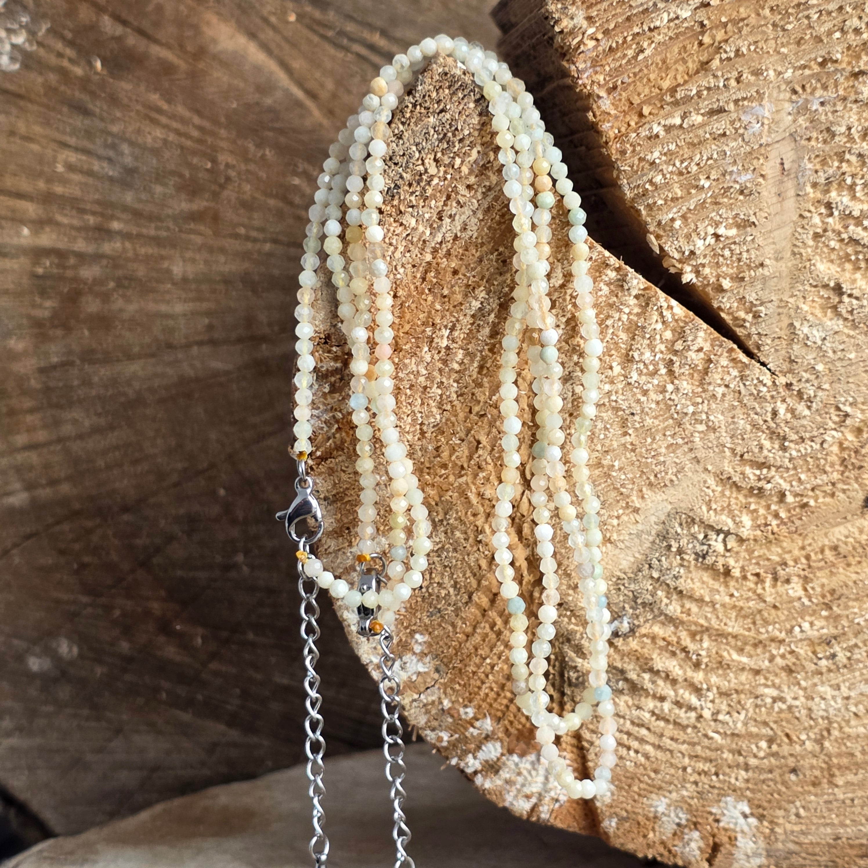 Ένα λεπτό και ηλιόλουστο κολιέ, φτιαγμένο από φυσικό μπιρίλιο γνωστό ως ηλιοδώρος, εκτιμούμενο για τη ζεστή λάμψη του και το απαλό φως που αντανακλά. Οι παστέλ κίτρινες αποχρώσεις, διάφανο και υποβλητικά ιριδίζον, προσδίδουν στο κολιέ μια καθαρή, φωτεινή, σχεδόν αιθέρια όψη. Κάθε σκαλισμένη σφαίρα δημιουργεί ένα διακριτικό παιχνίδι αντανακλάσεων, μετατρέποντας το κομμάτι σε ένα κομψό αξεσουάρ, ιδανικό για όσους αγαπούν τα λεπτά και φυσικά κοσμήματα.