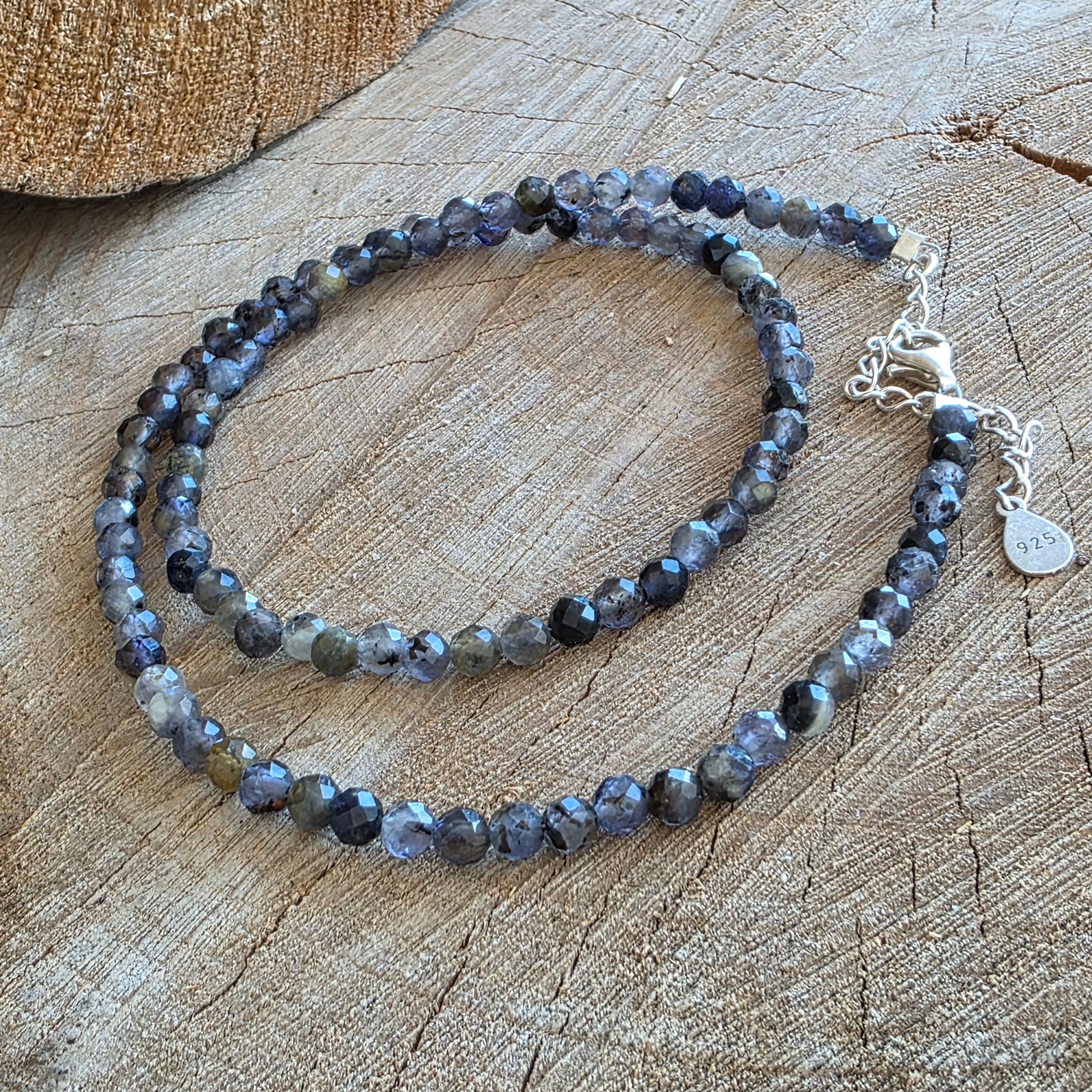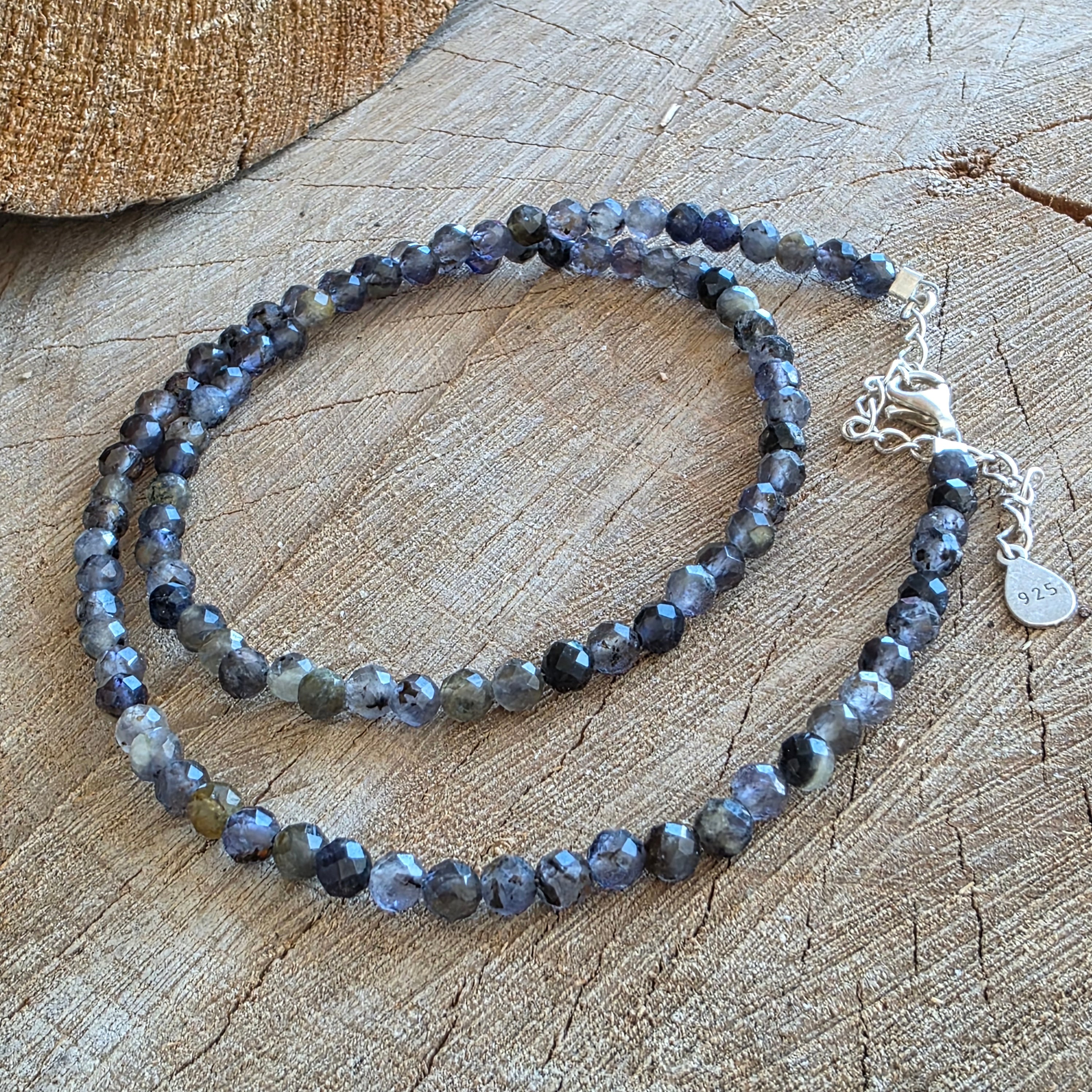 Ένα κολιέ με ήρεμο βάθος και διακριτική κομψότητα, φτιαγμένο από σφαιρίδια κοπής ιολίτη 4 mm, που σχηματίζουν μια λεπτή και ισορροπημένη γραμμή γύρω από το λαιμό. Οι αποχρώσεις του μπλε-ιώδους, μερικές φορές με γκρι ή διαφανείς τόνους, δημιουργούν ένα διακριτικό χρωματικό παιχνίδι, ενώ η λεπτή κοπή προσθέτει απαλές αντανακλάσεις, χωρίς να επιβαρύνει οπτικά το κόσμημα. Ο σχεδιασμός παραμένει καθαρός και αρμονικός, αναδεικνύοντας τη φυσική ομορφιά του λίθου.