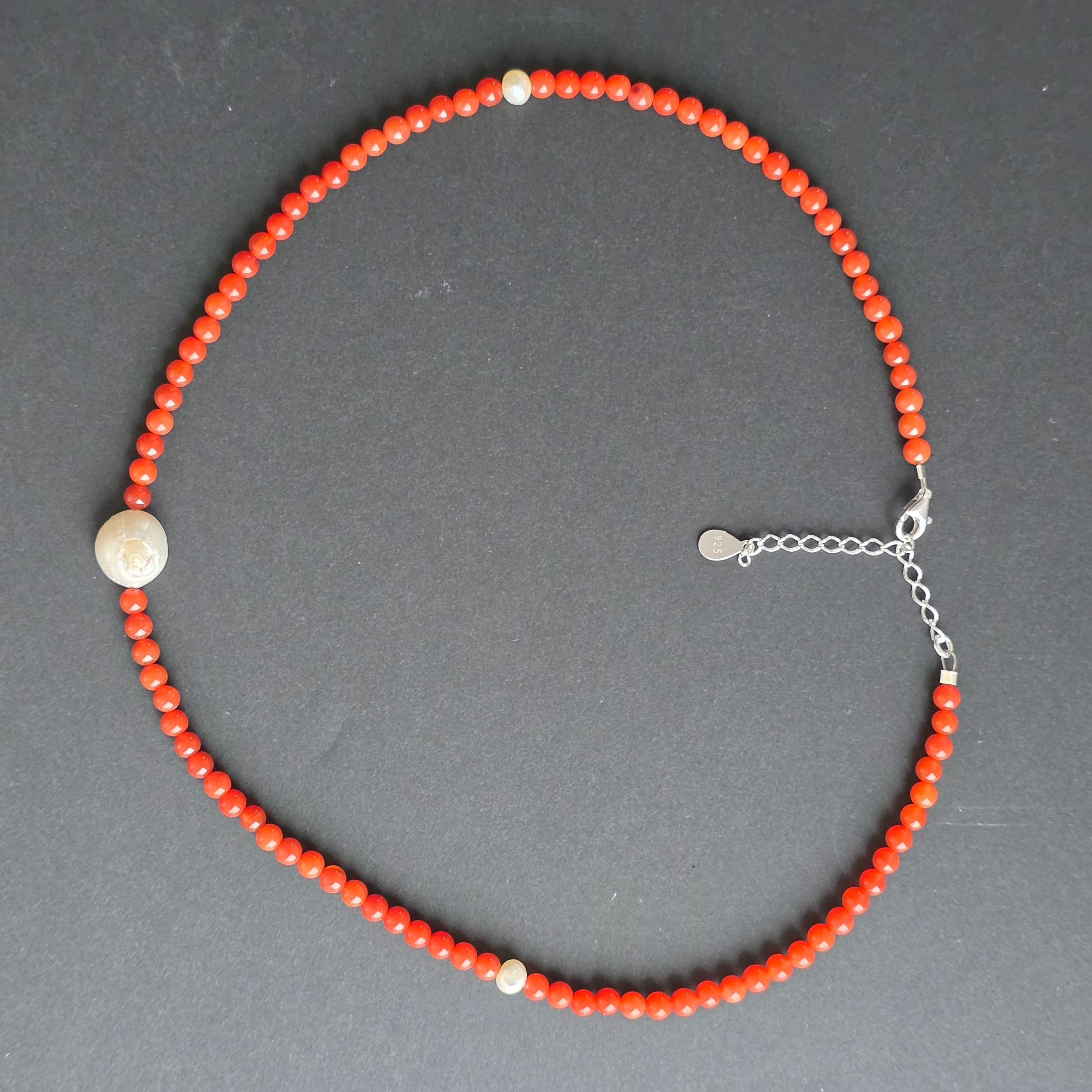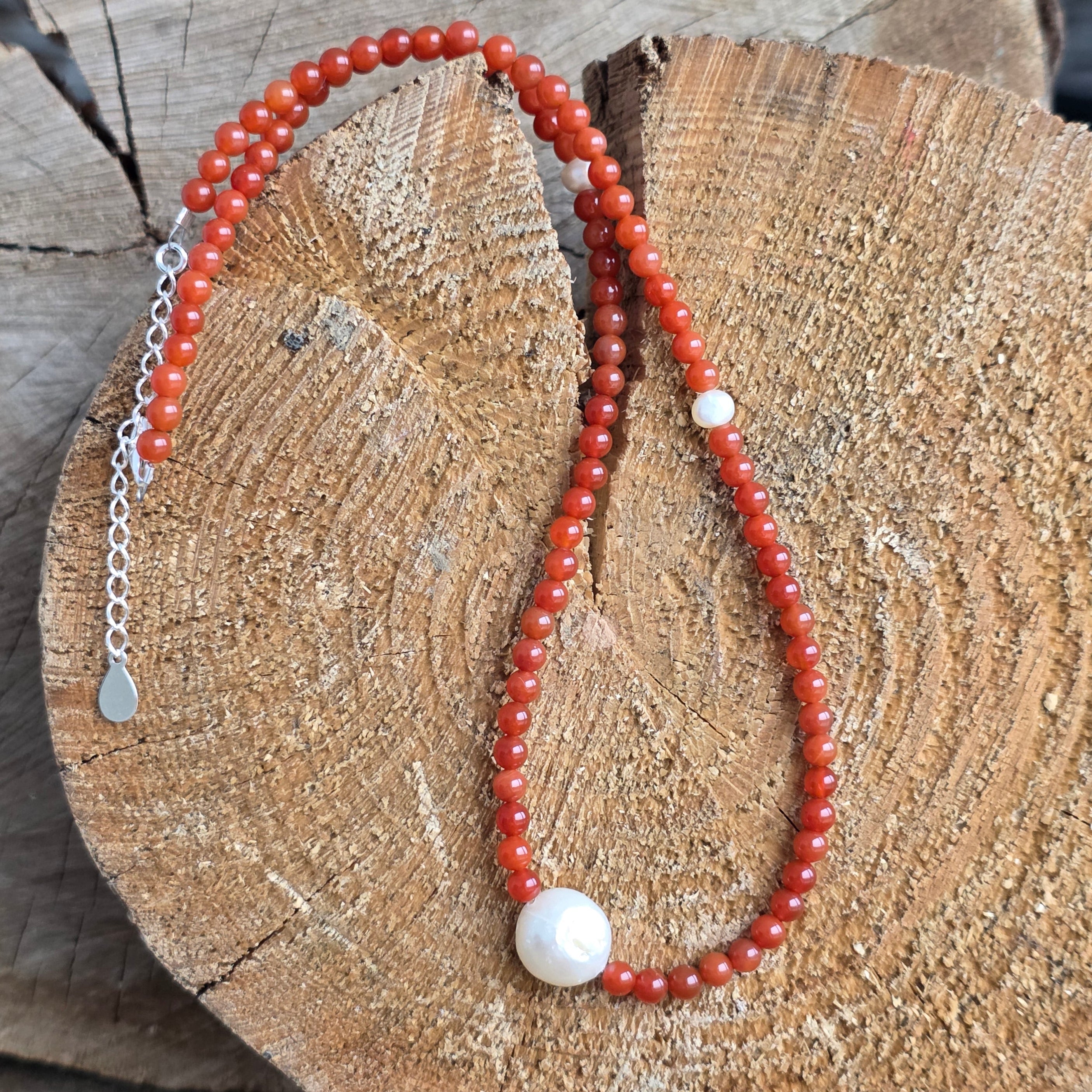Ένα κολιέ που ακτινοβολεί ζωτικότητα, πάθος και ζέστη. Η φυσική καρνεόλη φέρνει τη λάμψη του ηλιοβασιλέματος και την ενέργεια της εσωτερικής φωτιάς. Το παιχνίδι των αποχρώσεών της – από ανοιχτό πορτοκαλί έως κόκκινο-κεχριμπάρι – δημιουργεί μια ζωντανή και αισιόδοξη δόνηση, ένα σύμβολο της ζωής που βιώνεται με θάρρος και χαρά.