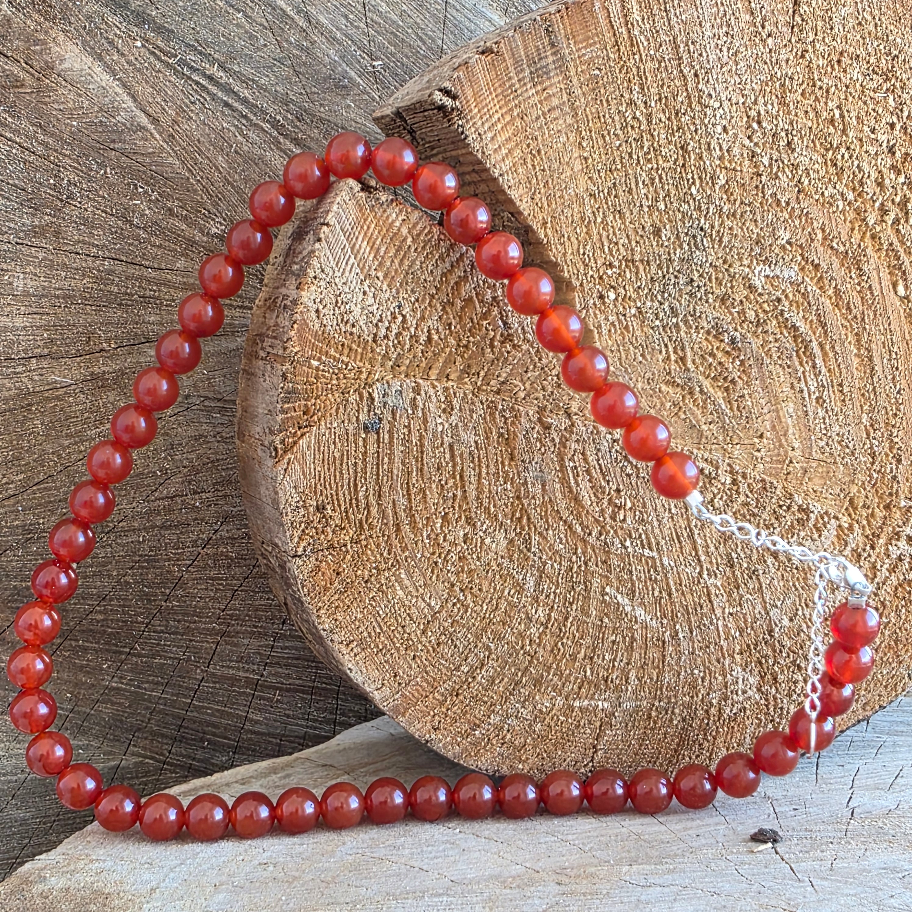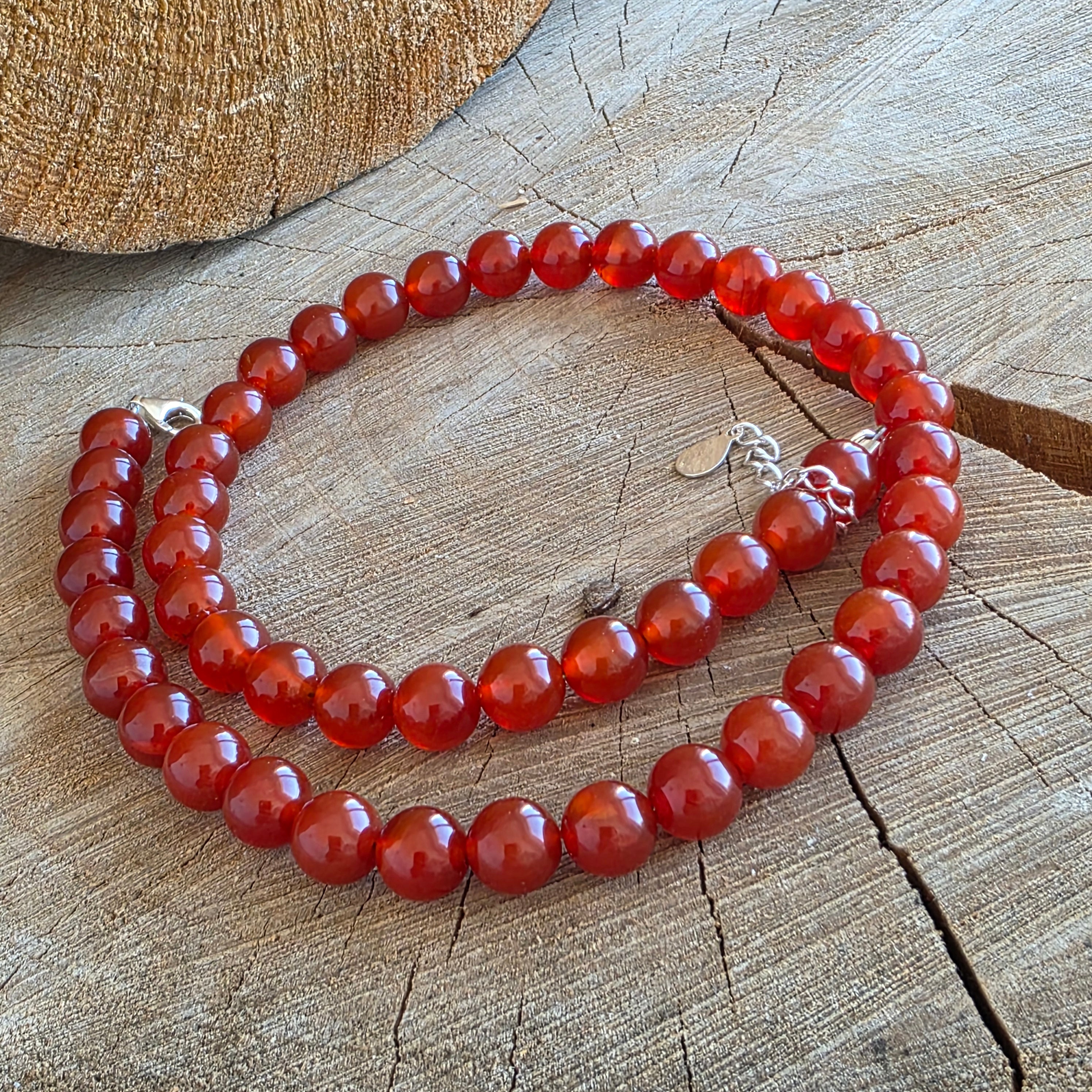 Ένα κολιέ με ζεστή και ζωντανή παρουσία, φτιαγμένο από χάντρες καρνεόλης 6 mm, που τοποθετούνται αρμονικά γύρω από τον λαιμό, σχηματίζοντας μια στρογγυλή και ισορροπημένη γραμμή. Οι πλούσιες αποχρώσεις του πορτοκαλί και του καμένου κόκκινου, μερικές φορές με διαφανείς παραλλαγές, αναδεικνύουν τον ζωντανό χαρακτήρα της πέτρας, ενώ το σφαιρικό σχήμα ενισχύει την αίσθηση της συνέχειας και της οπτικής ροής. Ο σχεδιασμός είναι καθαρός και διαχρονικός, αφήνοντας το φυσικό χρώμα και την υφή της καρνεόλης να βρίσκονται στο επίκεντρο.