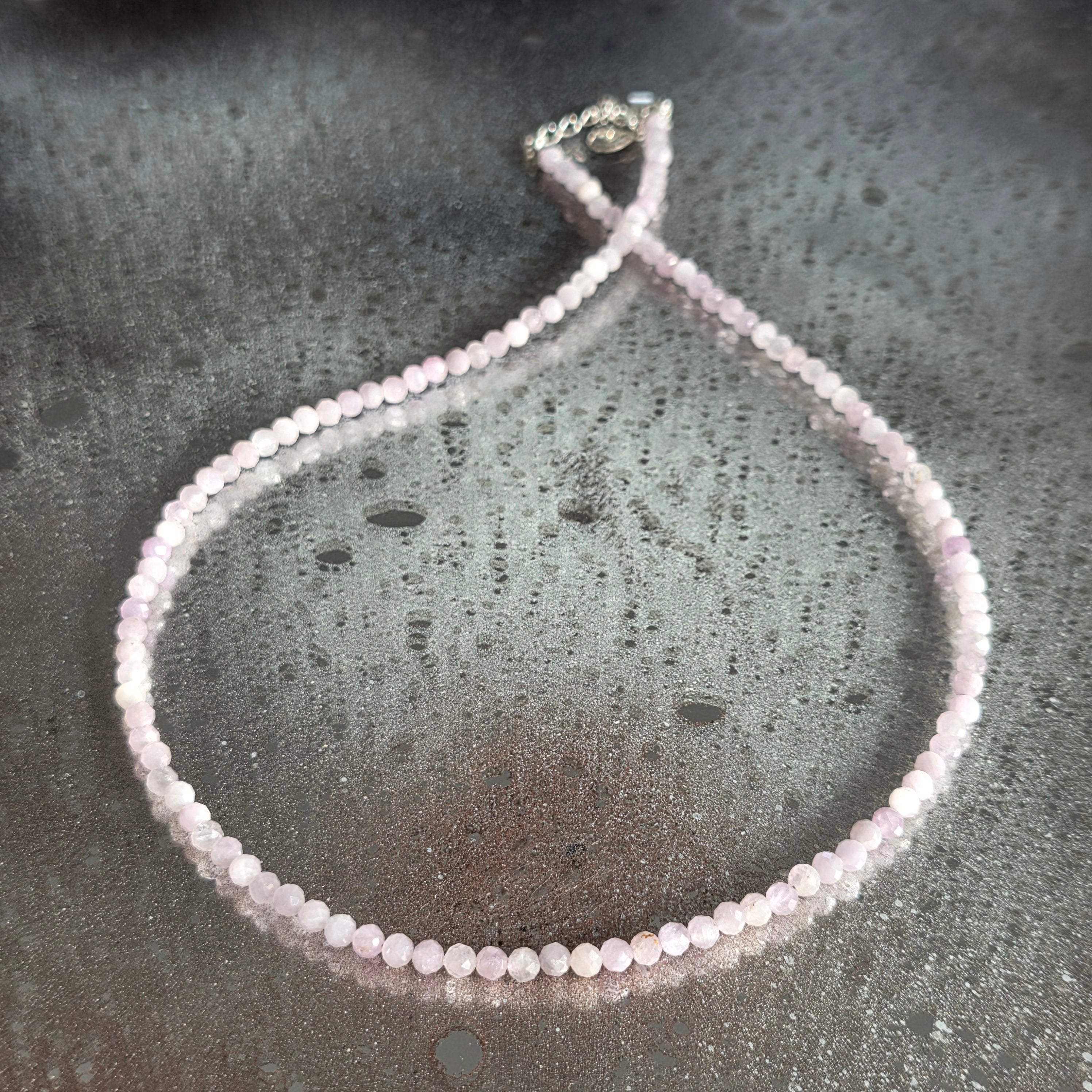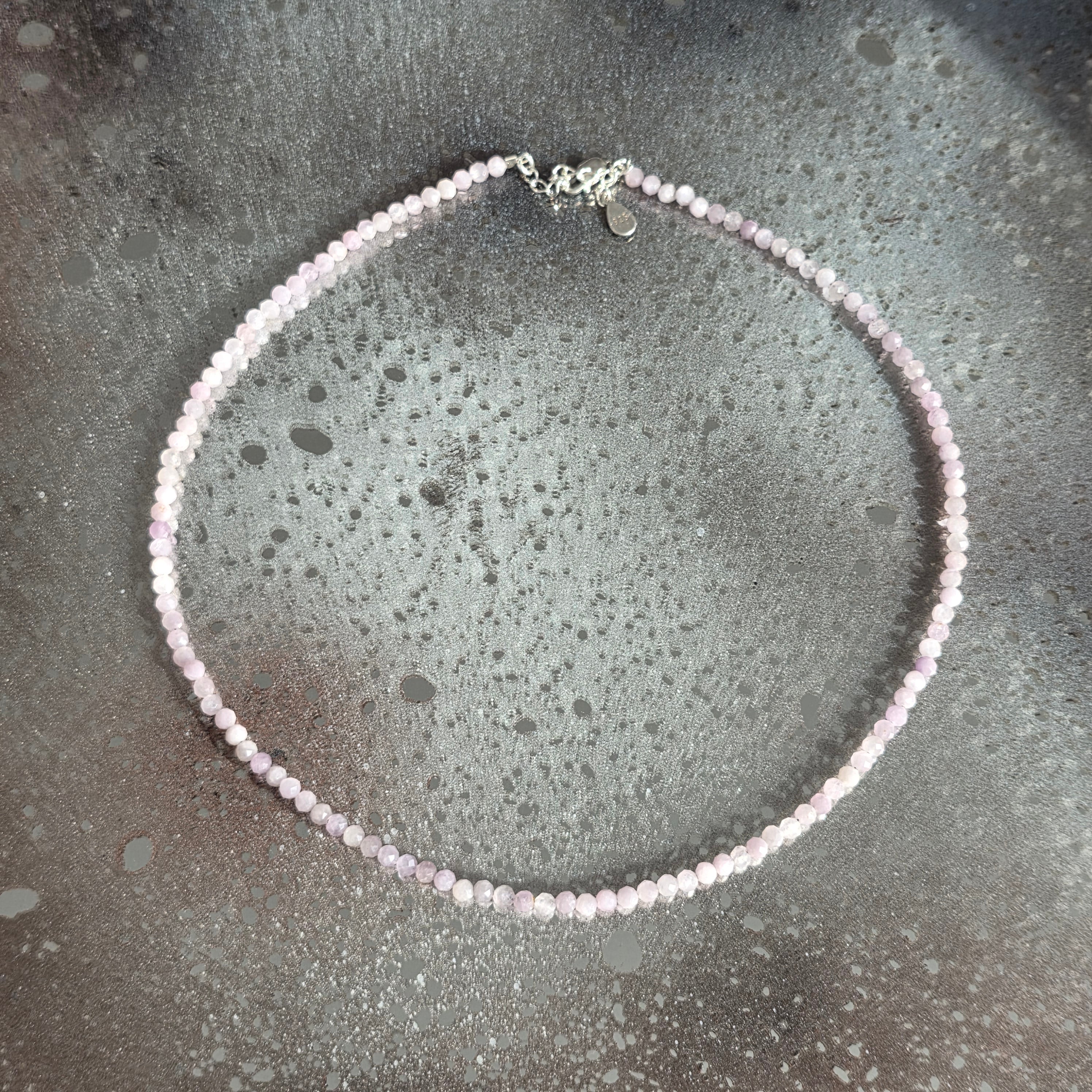 Ένα λεπτό κολιέ, σαν αύρα ροζ φωτός στη βάση του λαιμού. Οι φακοσχηματισμένες χάντρες από φυσικό κουνζίτη, με διαστάσεις 3–4 mm, δημιουργούν διακριτική και λεπτή λάμψη, αντανακλώντας το φως με έναν υποτονικό, θηλυκό και εκλεπτυσμένο τρόπο. Οι διάφανες αποχρώσεις του – από απαλό ροζ έως διαφανές λιλά – προσφέρουν στο κόσμημα μια ιδιαίτερη κομψότητα, κατάλληλη τόσο για καθημερινή χρήση όσο και για ειδικές στιγμές.