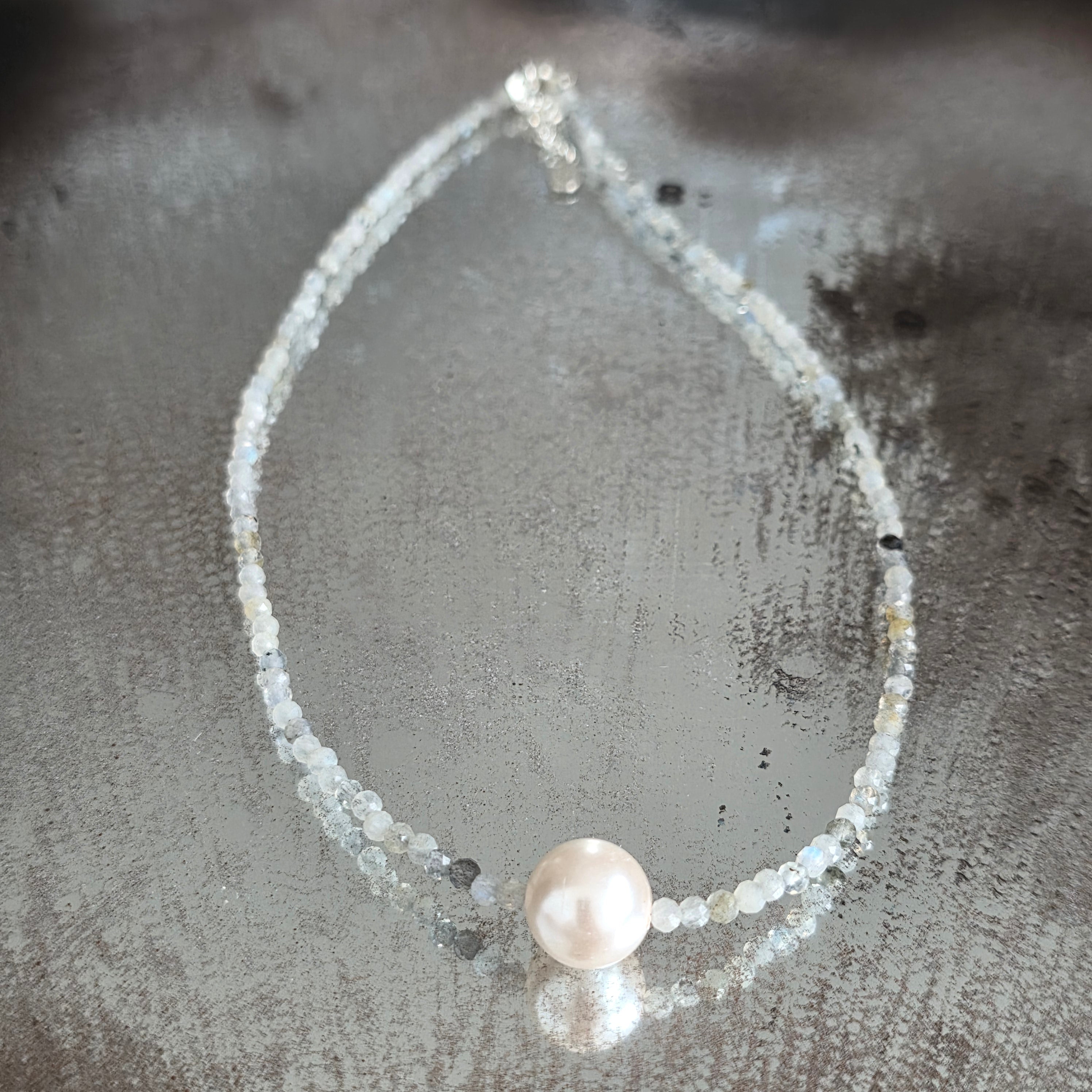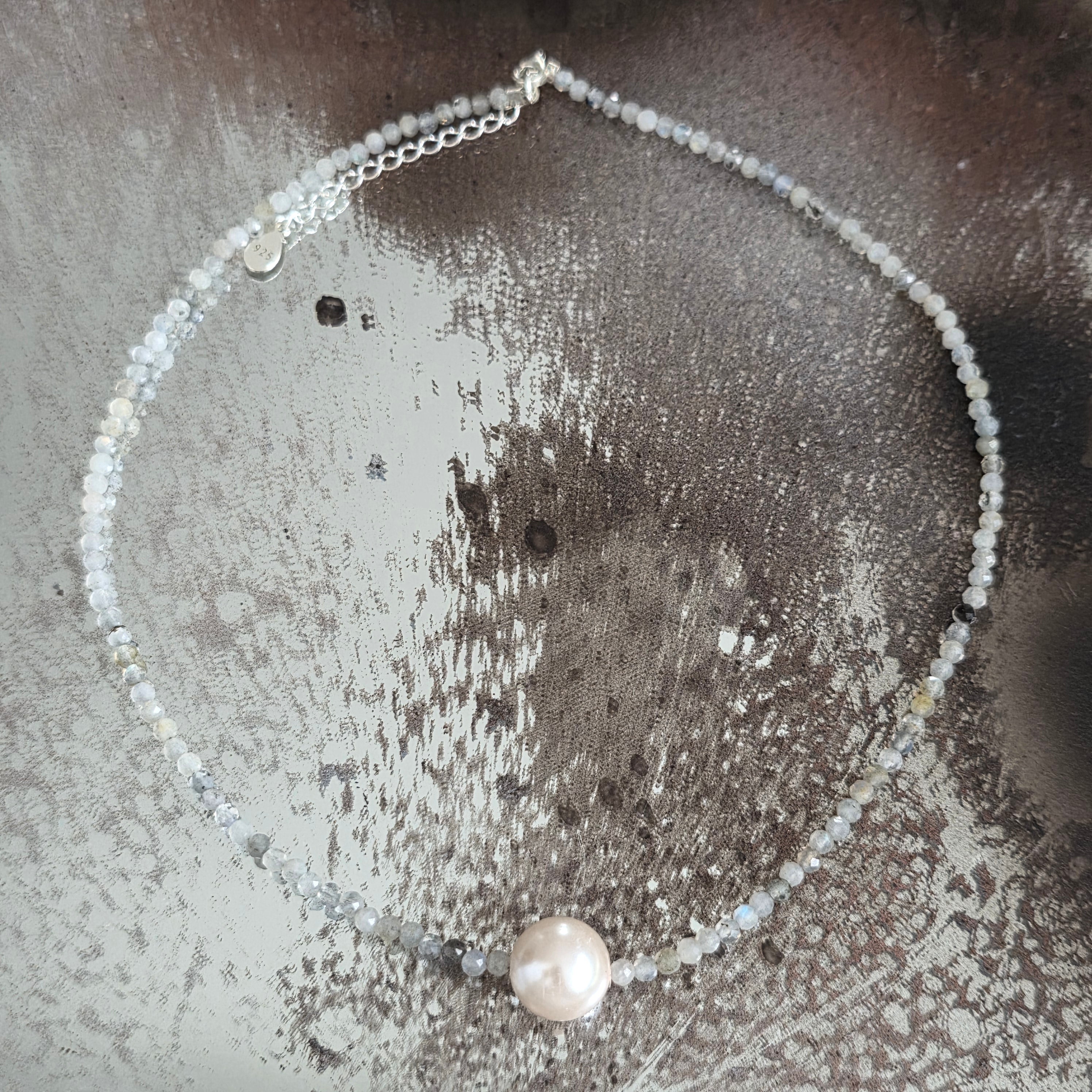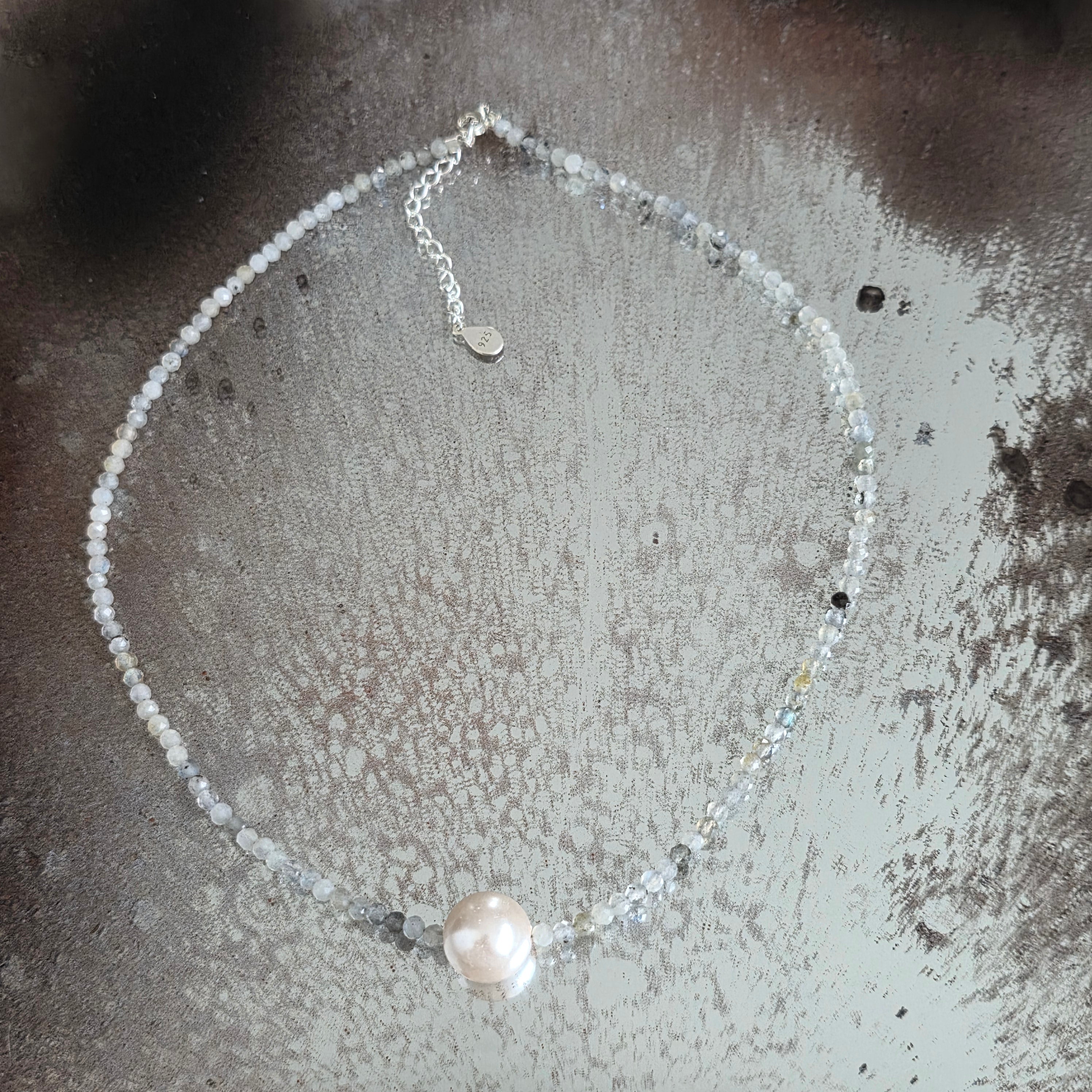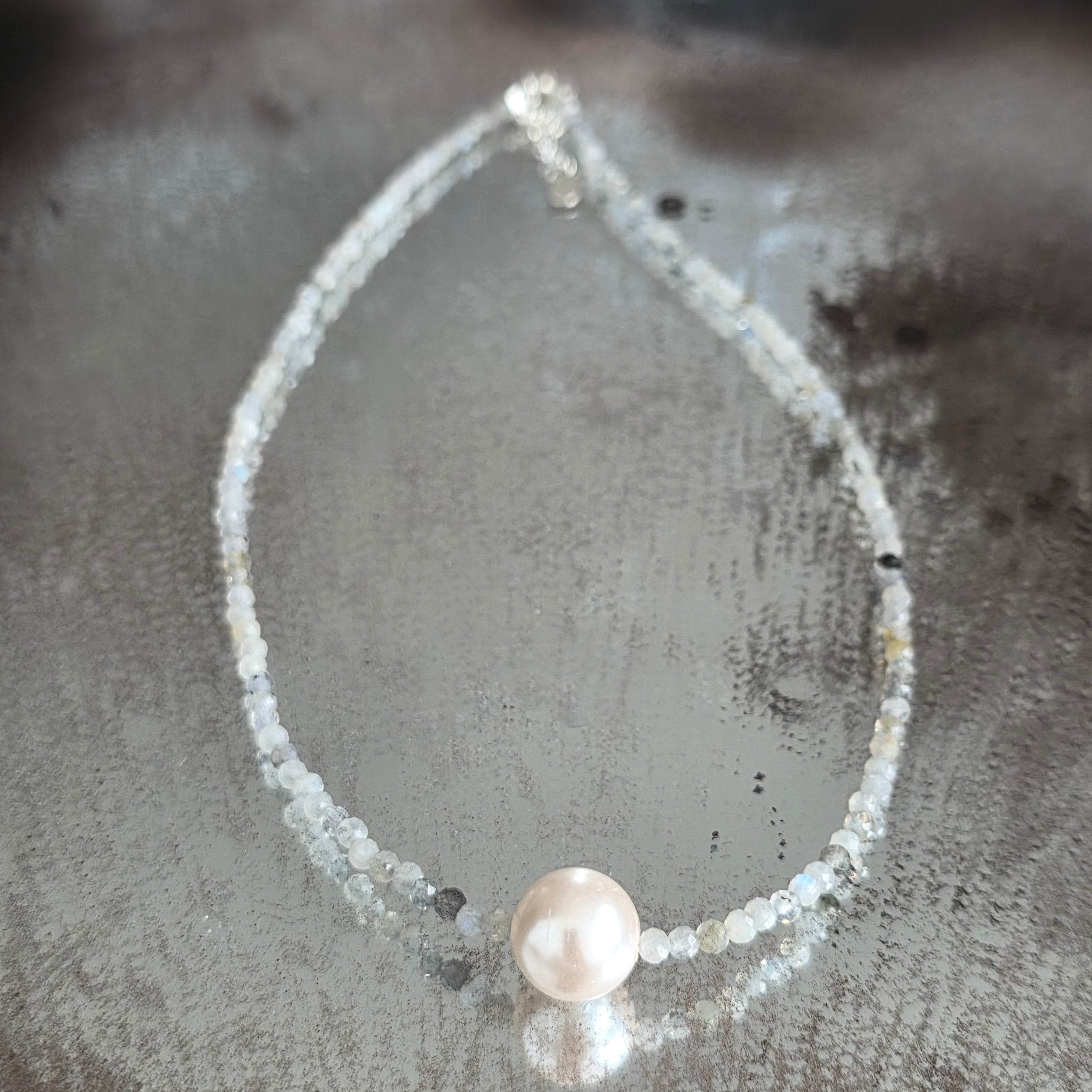 Η ενέργειά του φέρει τη δόνηση της διαίσθησης, της προστασίας και της εσωτερικής μεταμόρφωσης, αποτελώντας μια πέτρα της λεπτής μαγείας, που μας θυμίζει ότι η πραγματικότητα είναι πιο εκτεταμένη από αυτό που φαίνεται. Ο λαμπραντορίτης ξυπνά το θάρρος να ακολουθήσουμε το δικό μας μονοπάτι, ενώ το φυσικό μαργαριτάρι 1 εκ. προσθέτει μια νότα χάρης και αγνότητας — μια ισορροπία μεταξύ εσωτερικού φωτός και εξωτερικής κομψότητας.
