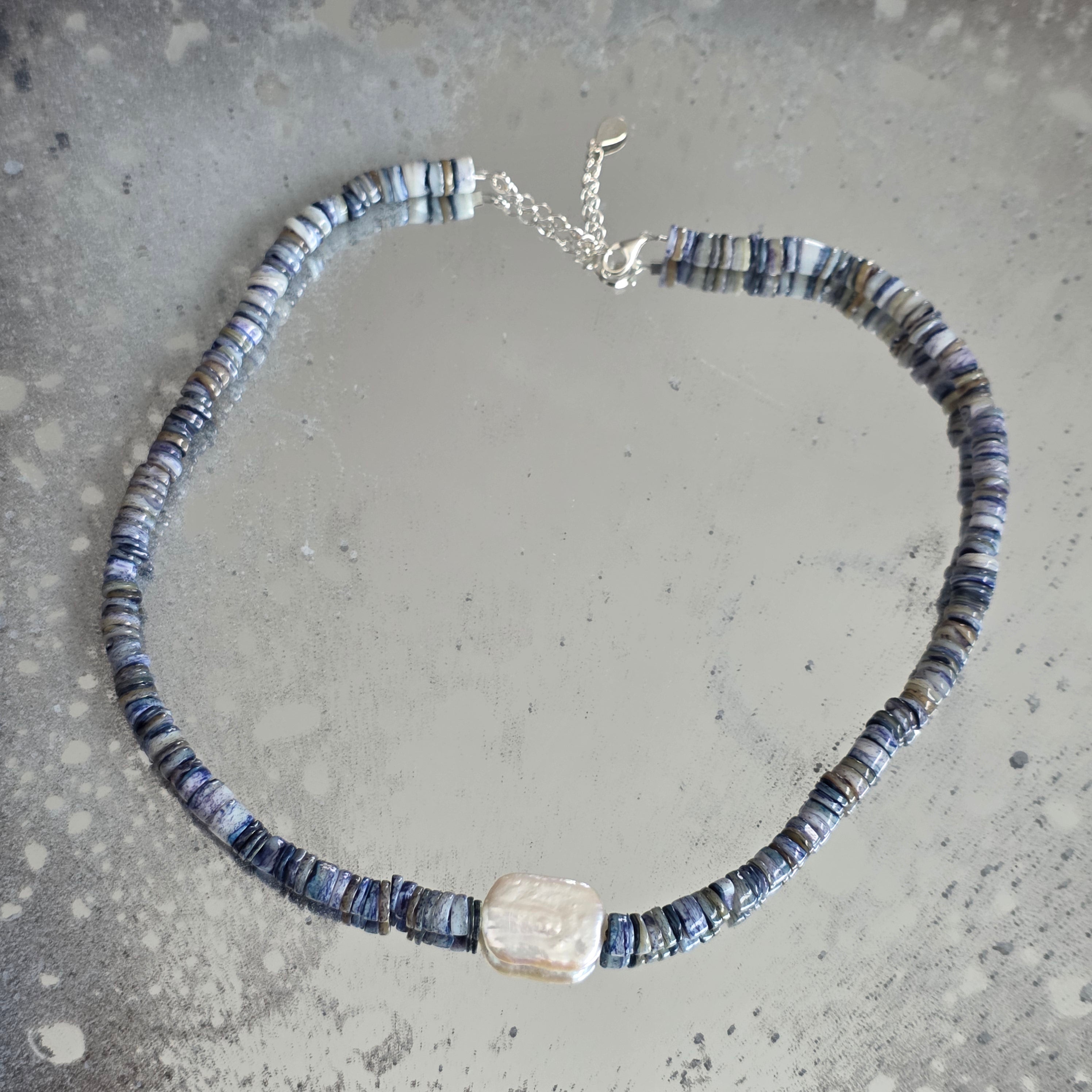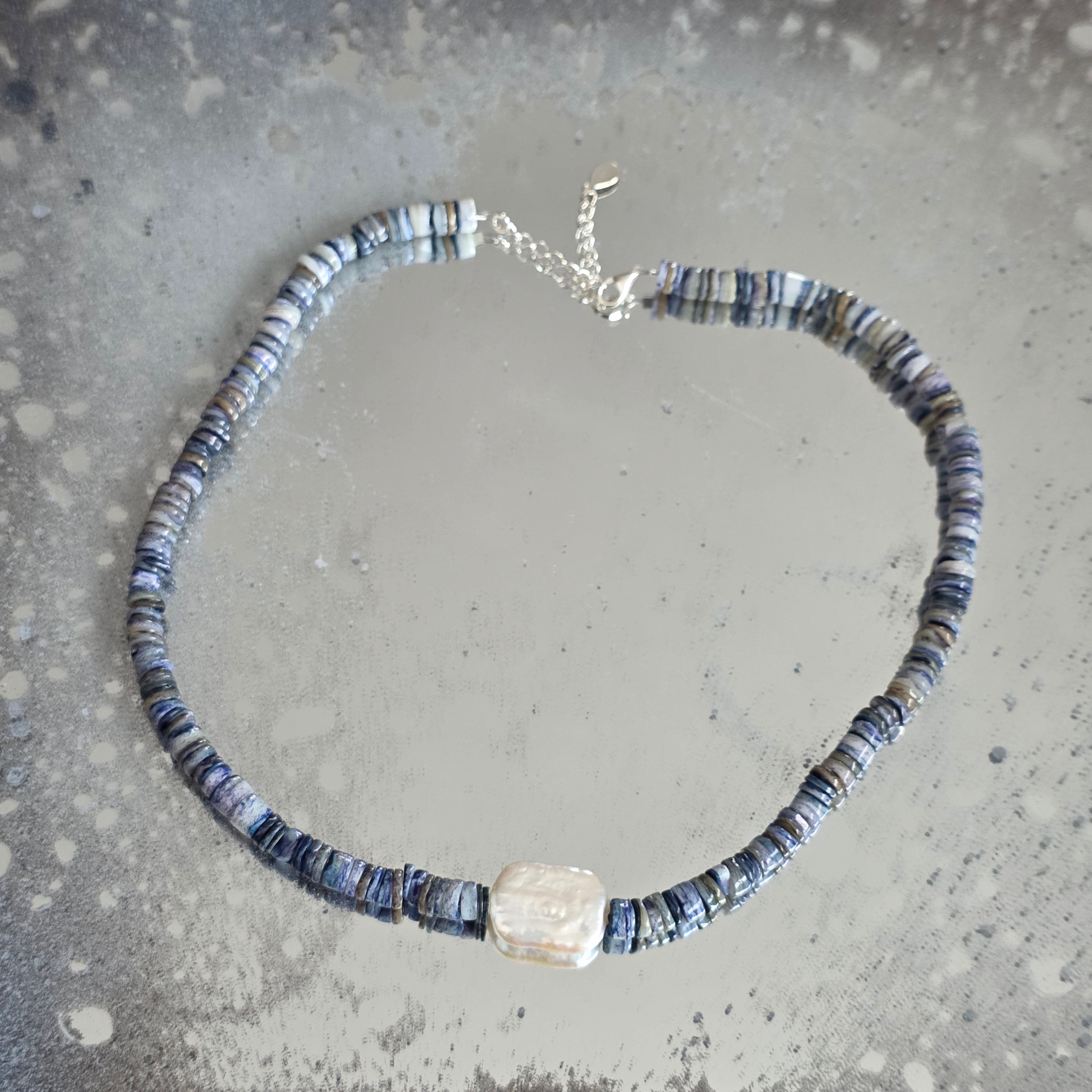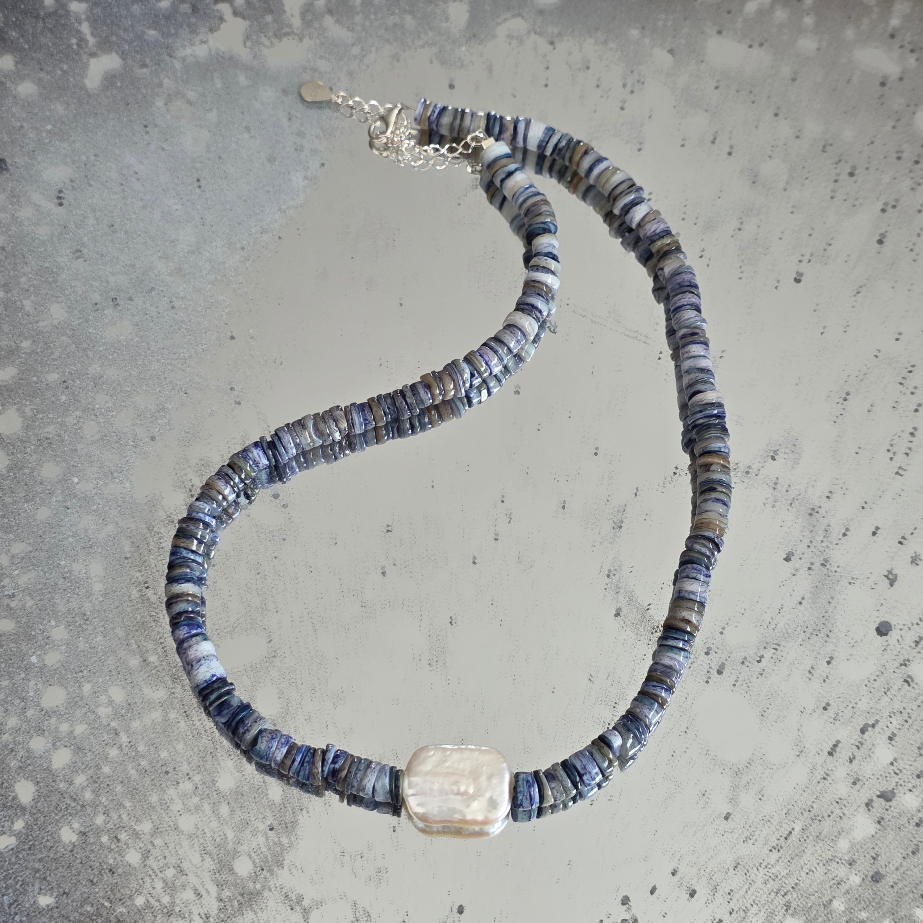 Υλικά: Λάπις Λάζουλι φυσικοί δίσκοι 6 mm, φυσικό ορθογώνιο μαργαριτάρι 2 cm, ασήμι 925