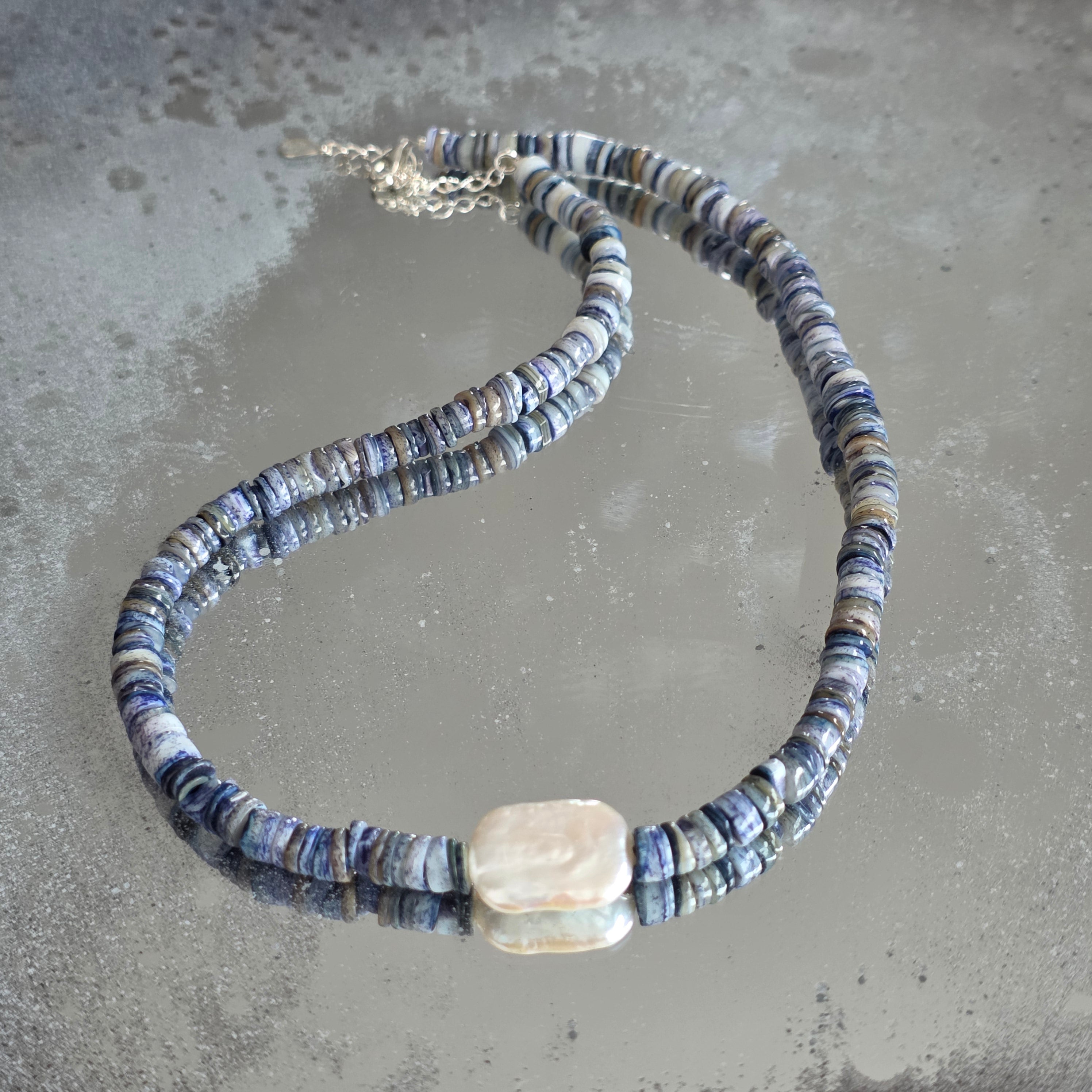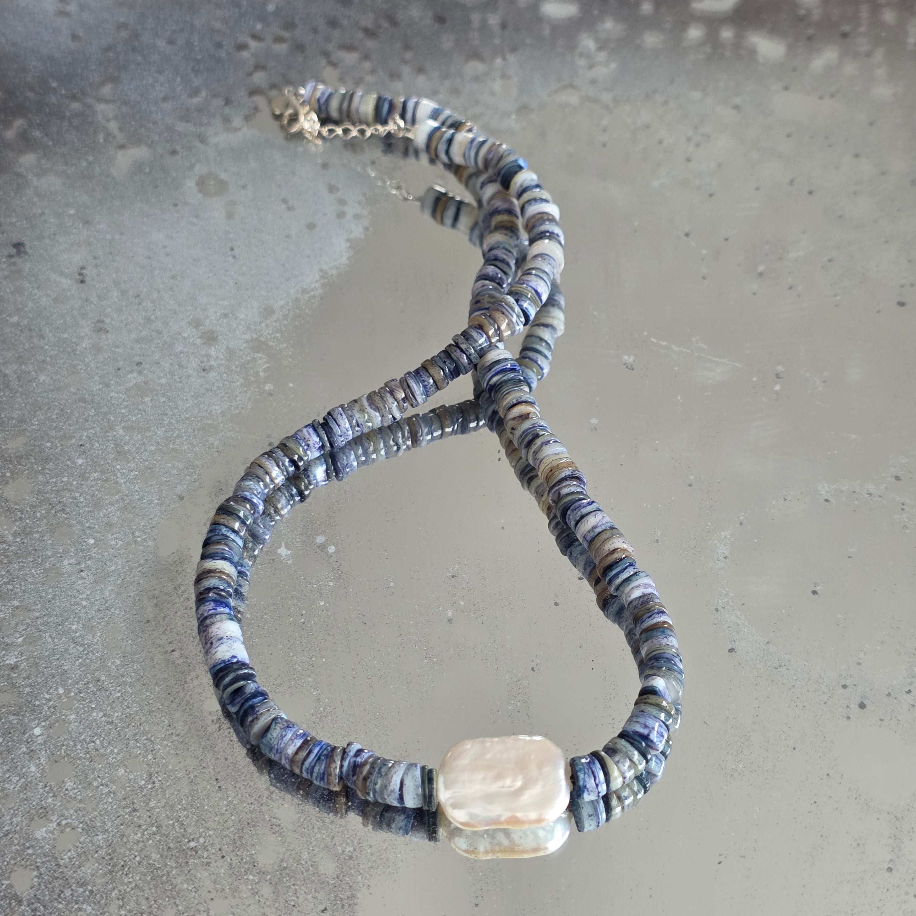 Ένα κολιέ που φέρνει μαζί τον ουρανό και τη θάλασσα, σε τέλεια ισορροπία μεταξύ βάθους και καθαρότητας. Λάπις Λάζουλι-το φυσικό, κομμένο σε δίσκους των 6 mm, λάμπει σε έντονο μπλε με χρυσές αντανακλάσεις από πυρίτη, ανακαλώντας τη γαλήνια νύχτα της αρχαίας Ανατολής. Στο κέντρο της σύνθεσης, ένα φυσικό ορθογώνιο μαργαριτάρι 2 cm προσθέτει μια υποτονική λάμψη φωτός, σαν λευκή αφροφη χάρις στα μπλε κύματα.