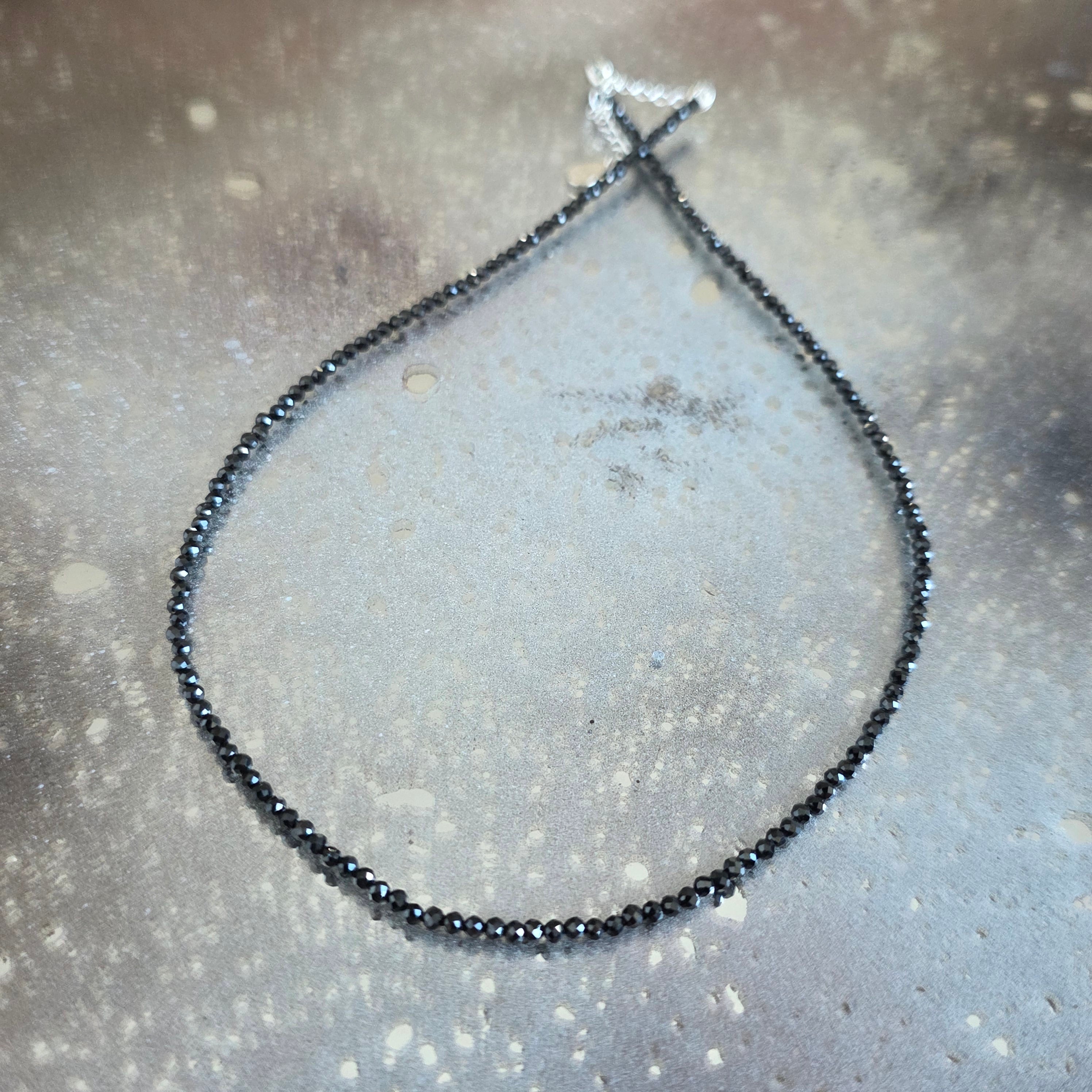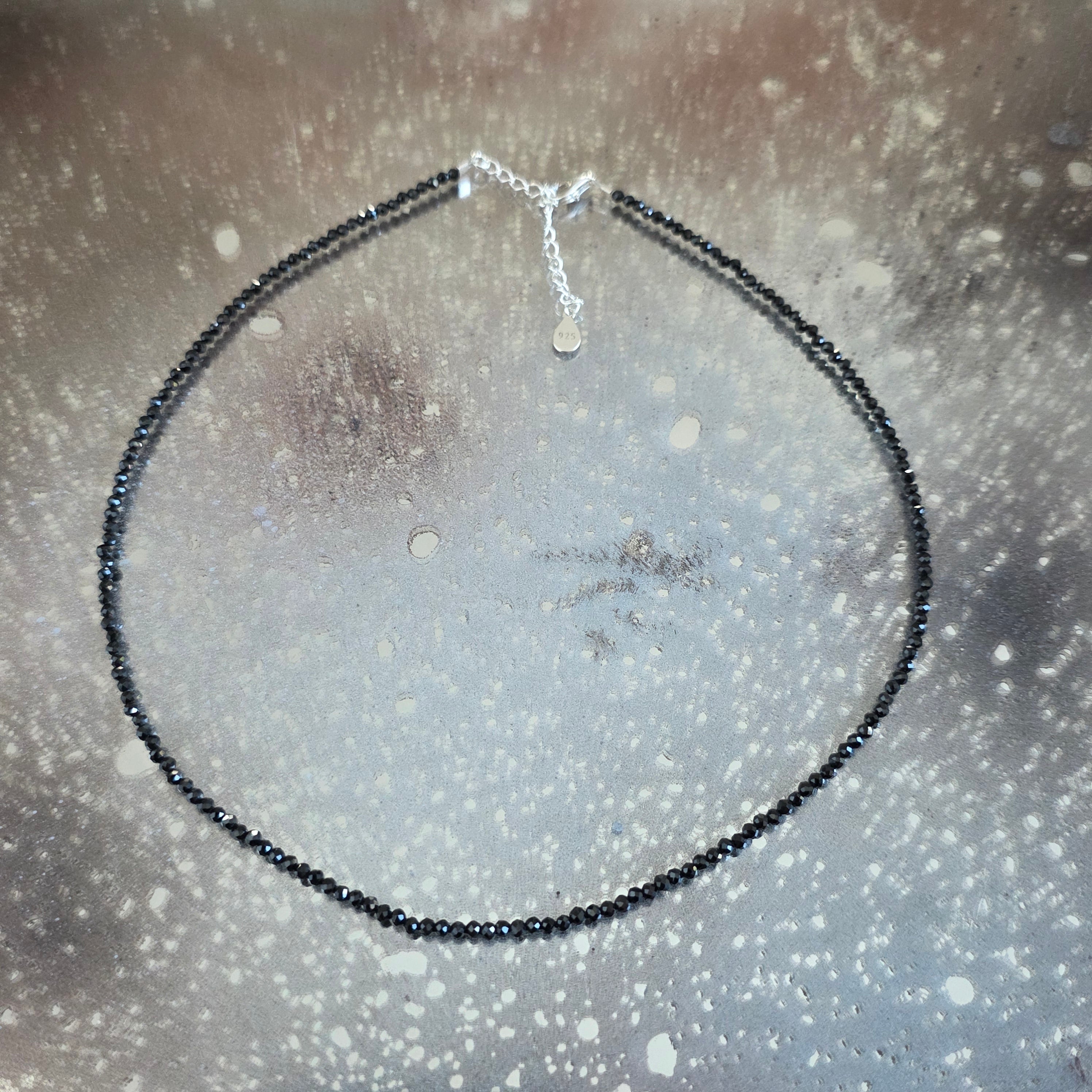 Ένα λεπτό και έντονο κολιέ, κατασκευασμένο από σφαιρίδια κομμένα από μαύρο οψιανό 2,5 mm, που δημιουργούν μια λεπτή αλλά καθορισμένη γραμμή γύρω από τον λαιμό. Το βαθύ μαύρο, με διακριτική γυαλιστερή λάμψη, αιχμαλωτίζει το φως σε λεπτές, σχεδόν γραφικές αντανακλάσεις, προσδίδοντας στο κόσμημα μια μοντέρνα και ισορροπημένη αίσθηση. Το μικρό μέγεθος των χαντρών διατηρεί τον μινιμαλιστικό σχεδιασμό, αναδεικνύοντας την καθαρότητα της μορφής και την οπτική σαφήνεια.