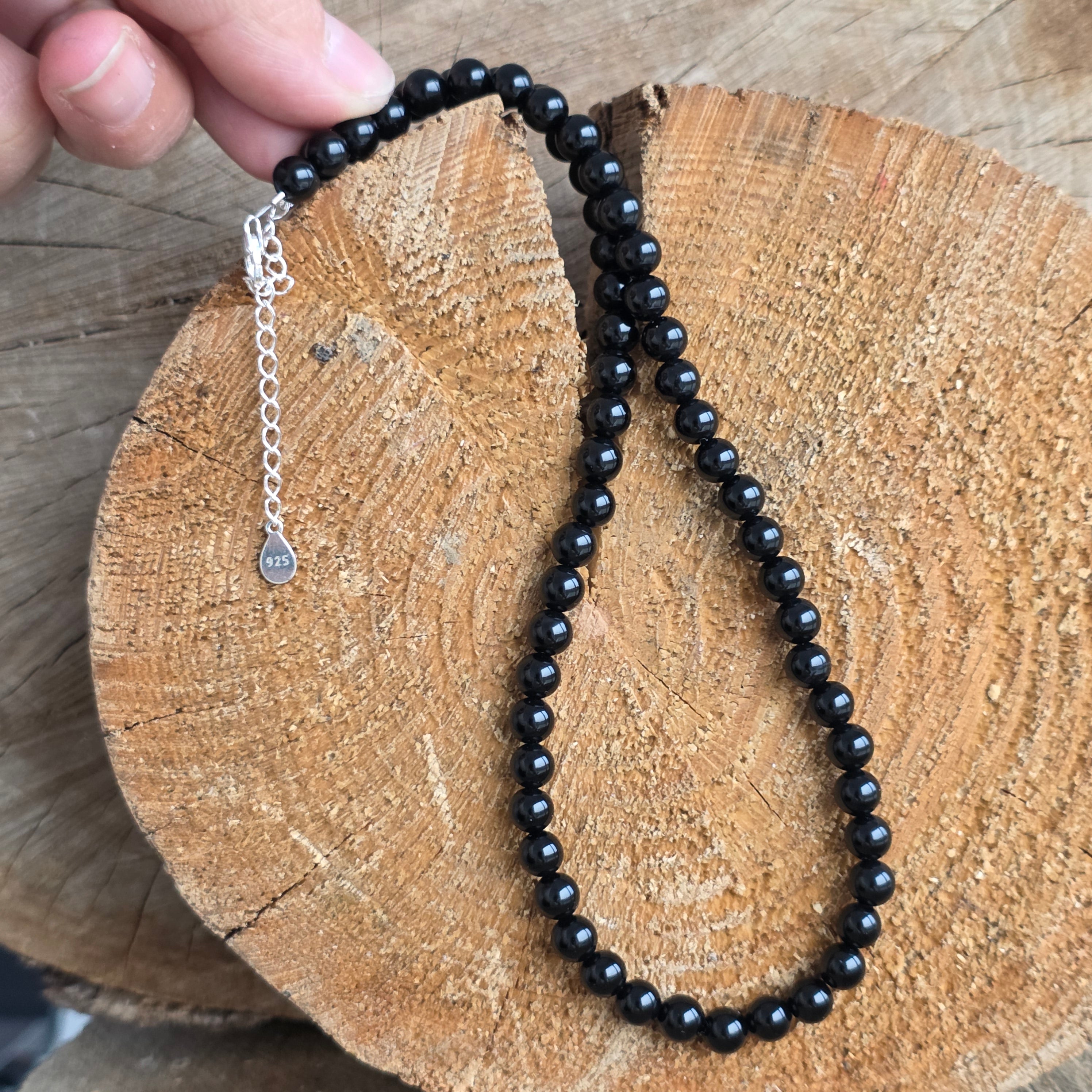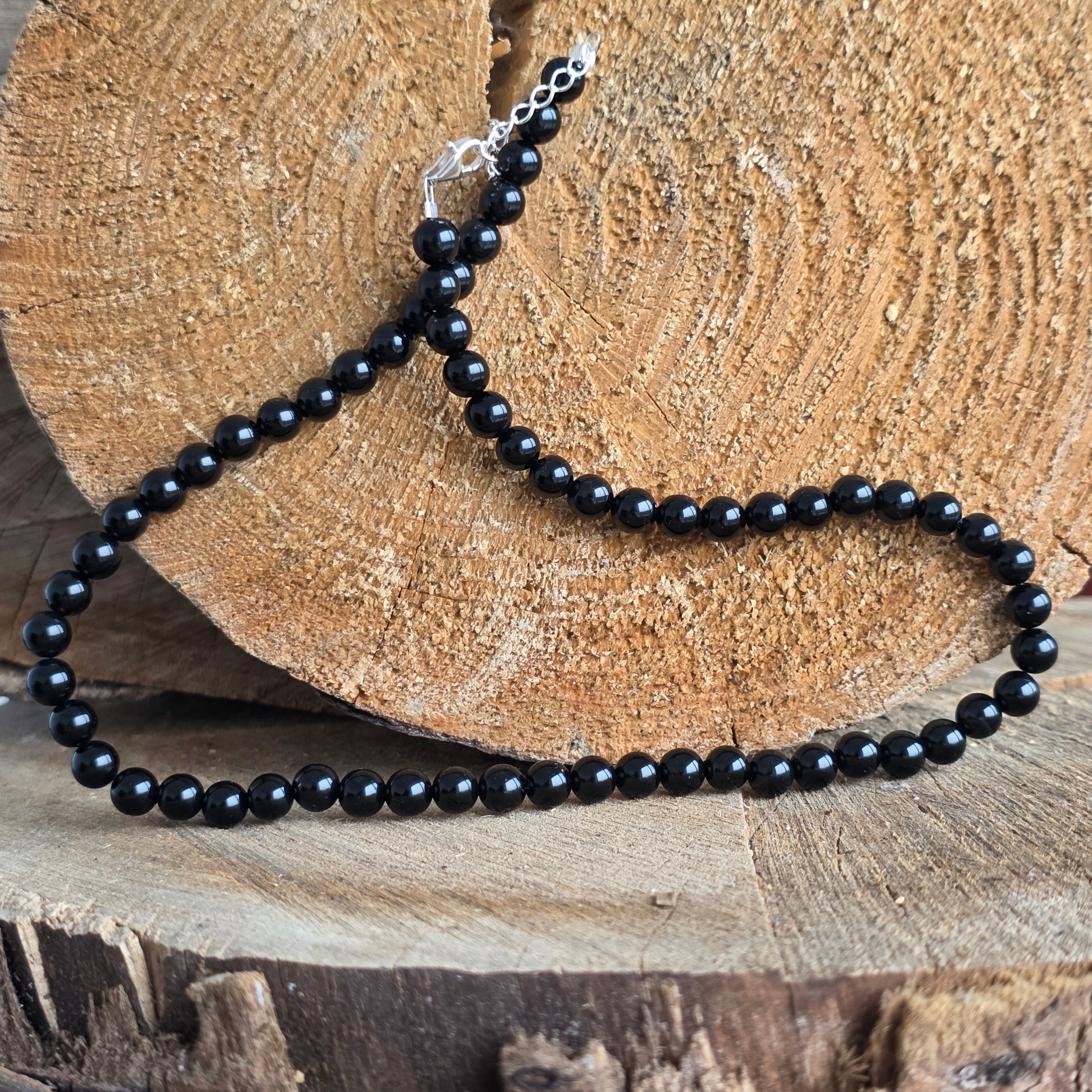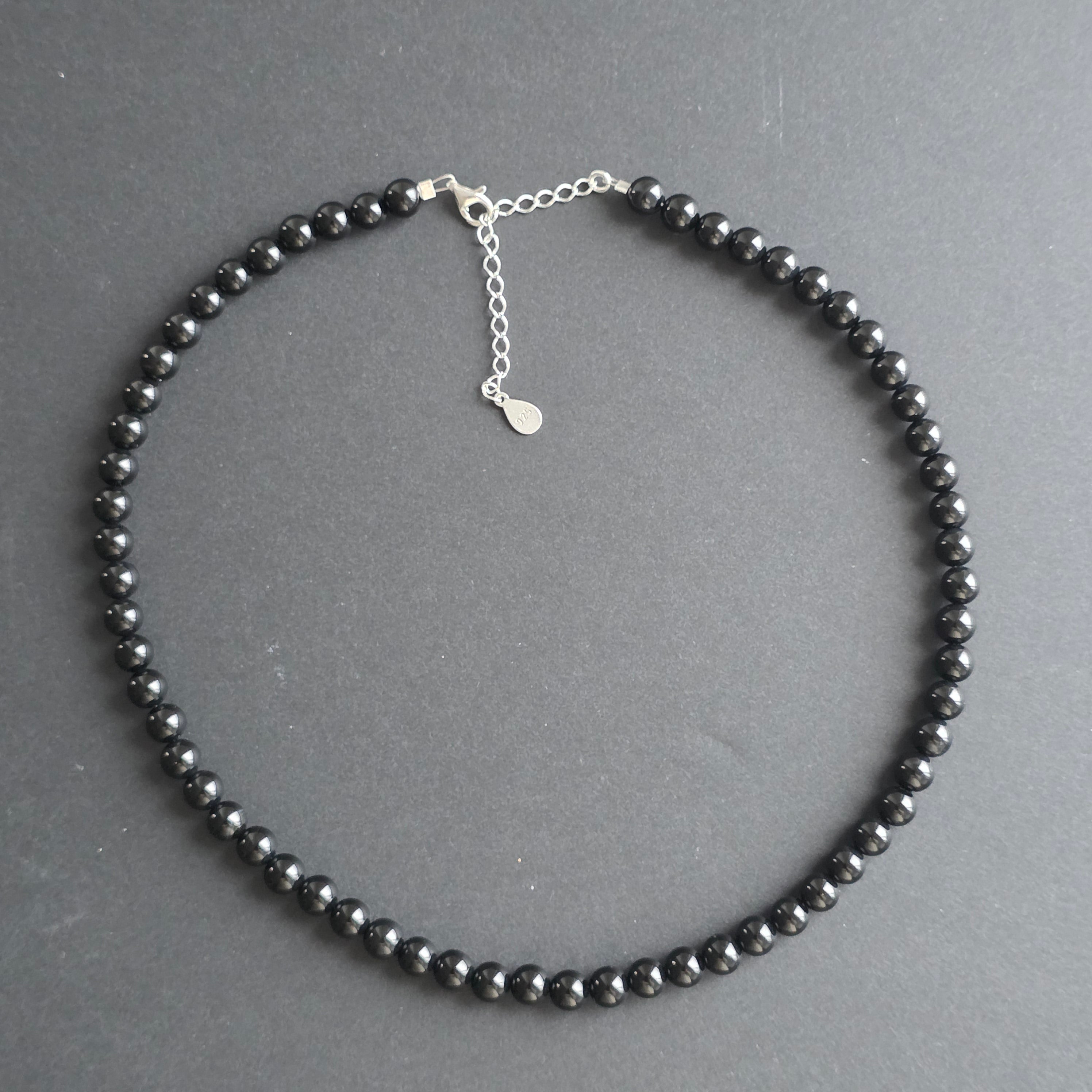Ένα κολιέ σαν μια καθαρή νύχτα όπου η πανσέληνος λάμπει πάνω στη σιωπή της γης. Οι λείες μαύρες χάντρες όνυχα 6 χλστ σχηματίζουν μια γραμμή δύναμης και μυστηρίου, ένας προστατευτικός κύκλος που απορροφά τον θόρυβο του κόσμου και αφήνει χώρο στην παρουσία.