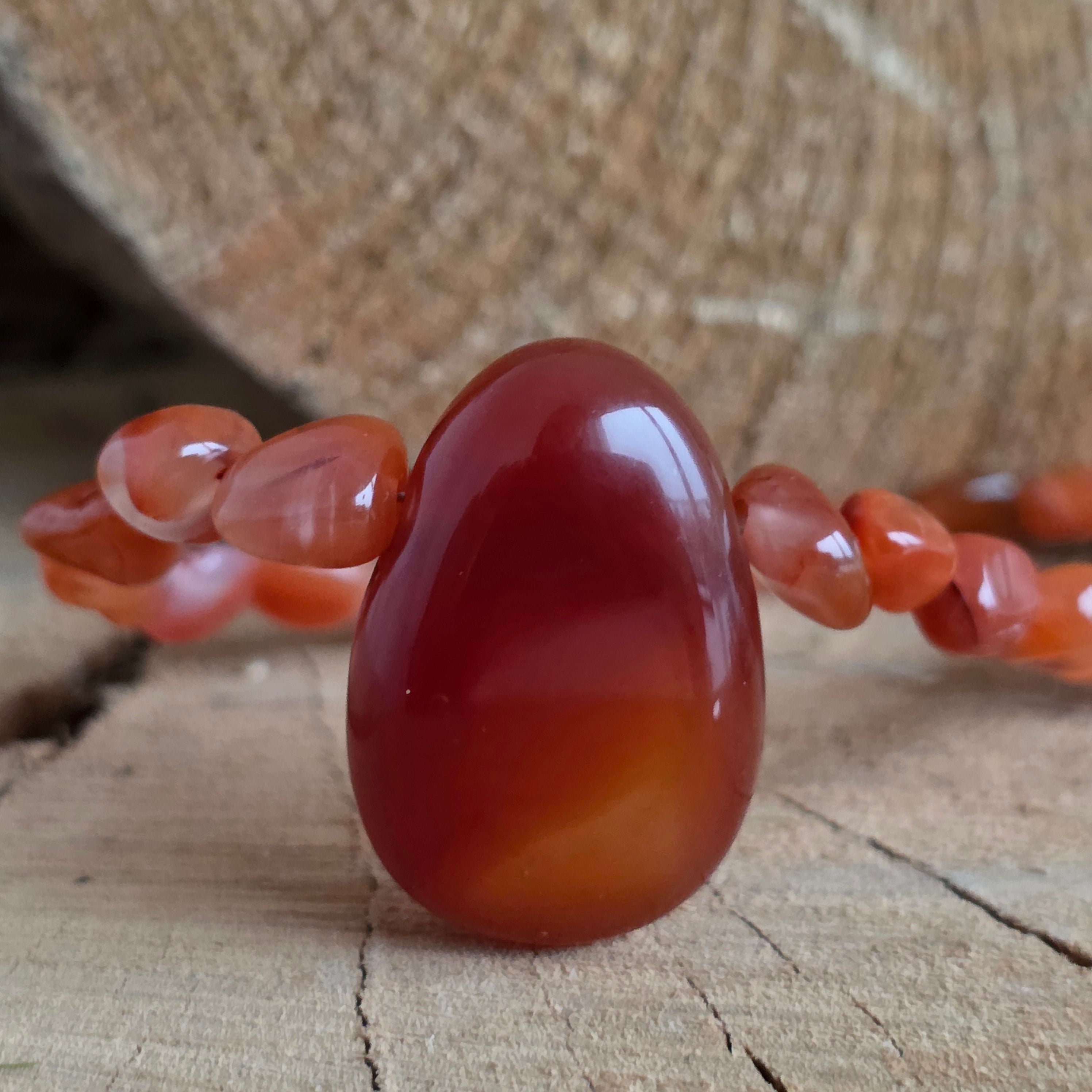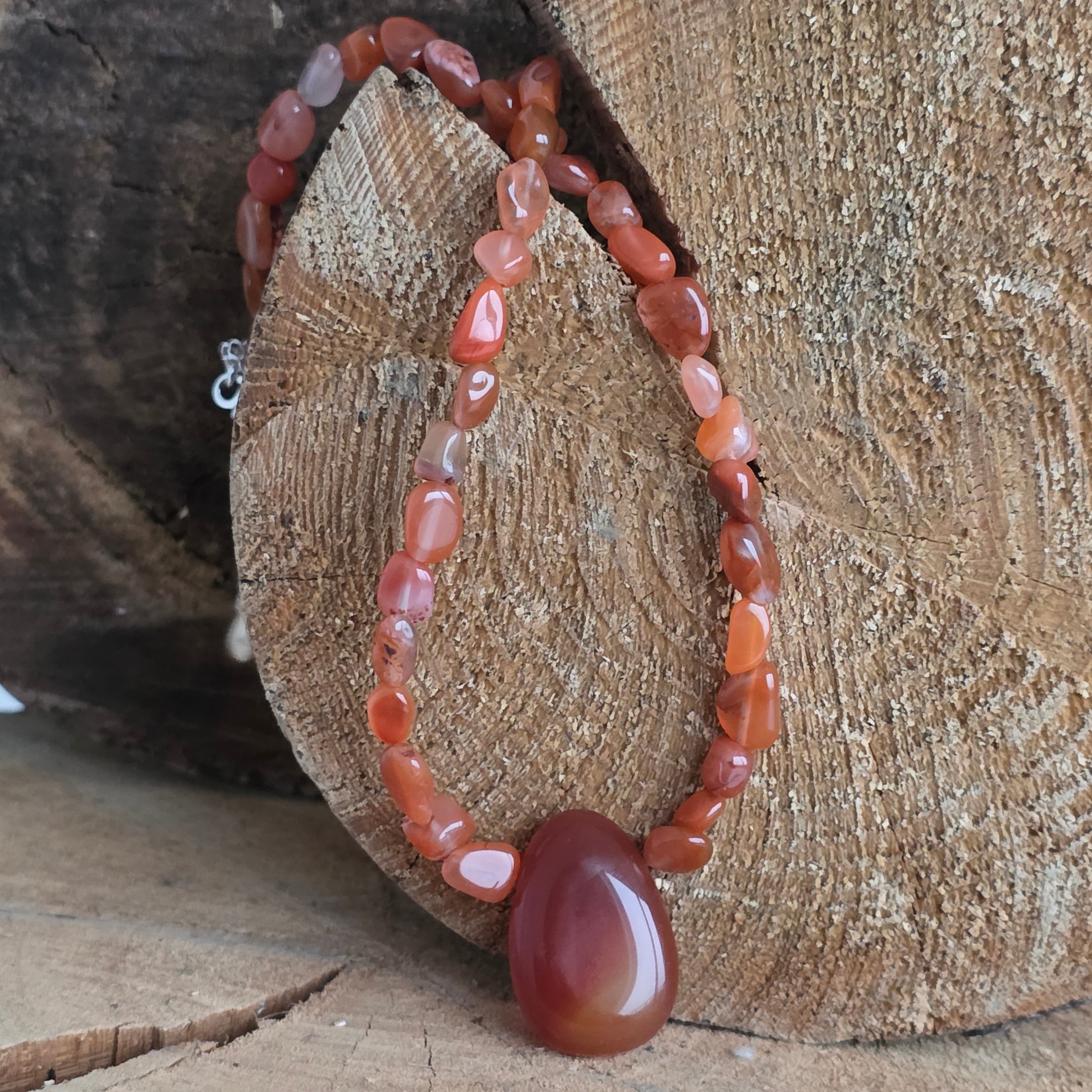 Ένα κολιέ σαν μια ήρεμη φλόγα – ζεστό, ζωντανό και γεμάτο απαλή δύναμη. Οι λεία χάντρες καρνεόλης, μεγέθους μεταξύ 6 και 8 χιλ., ακτινοβολούν σε έντονες αποχρώσεις πορτοκαλί, κόκκινου και κεχριμπαριού, σαν φως από το εσωτερικό της Γης που απέκτησε σχήμα και χρώμα.