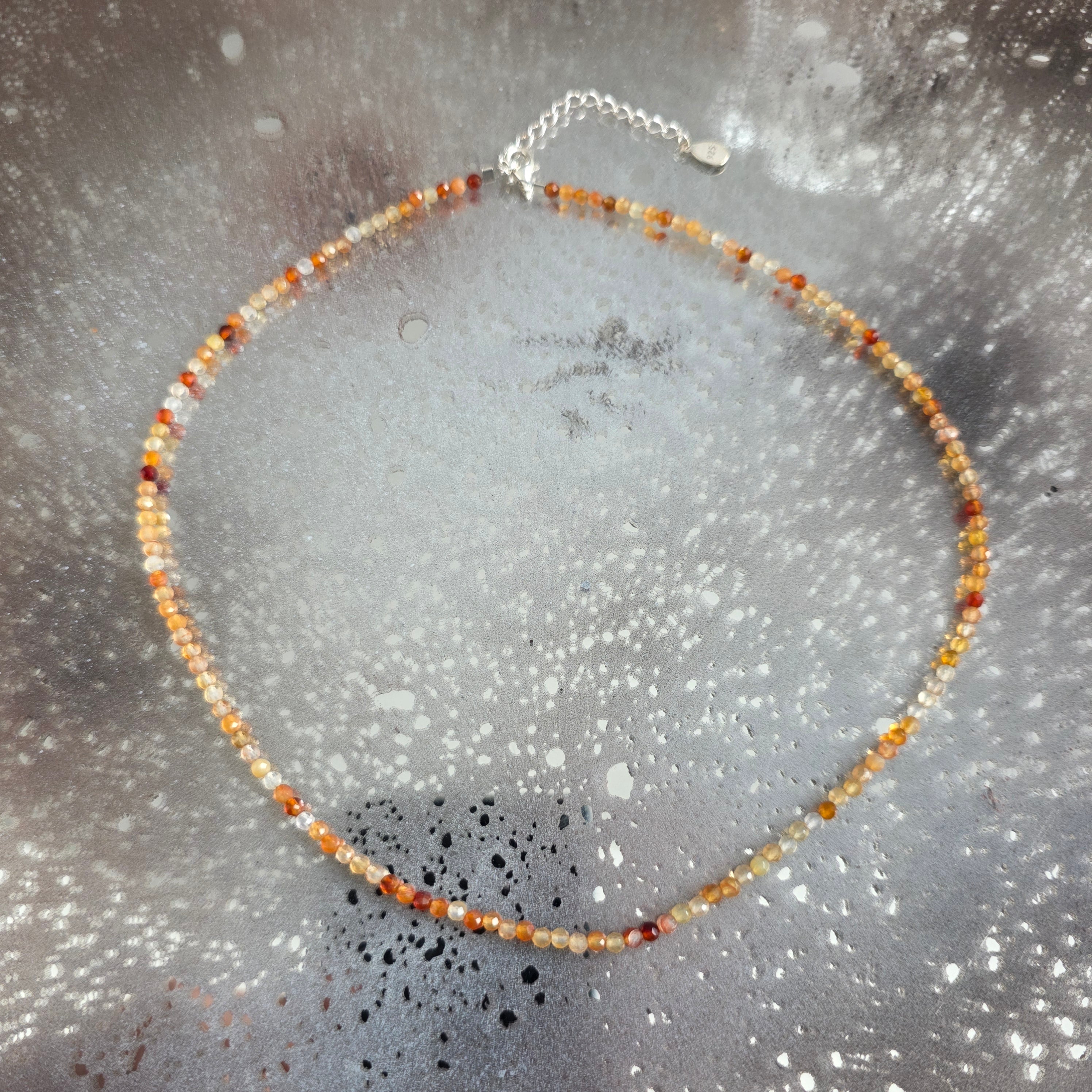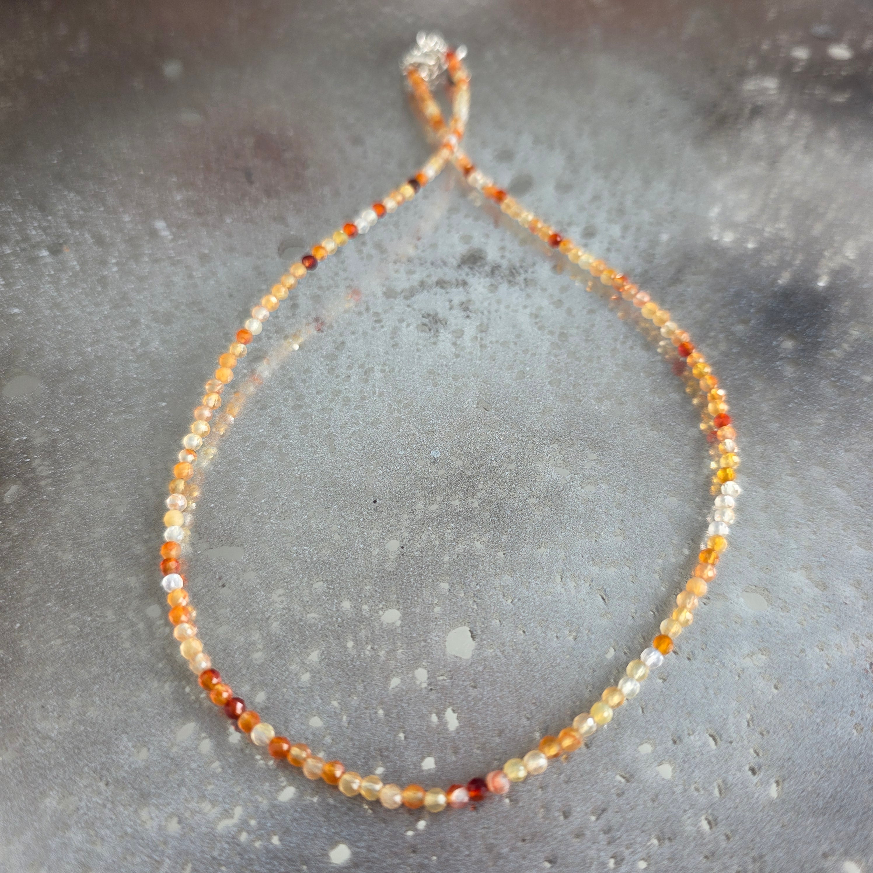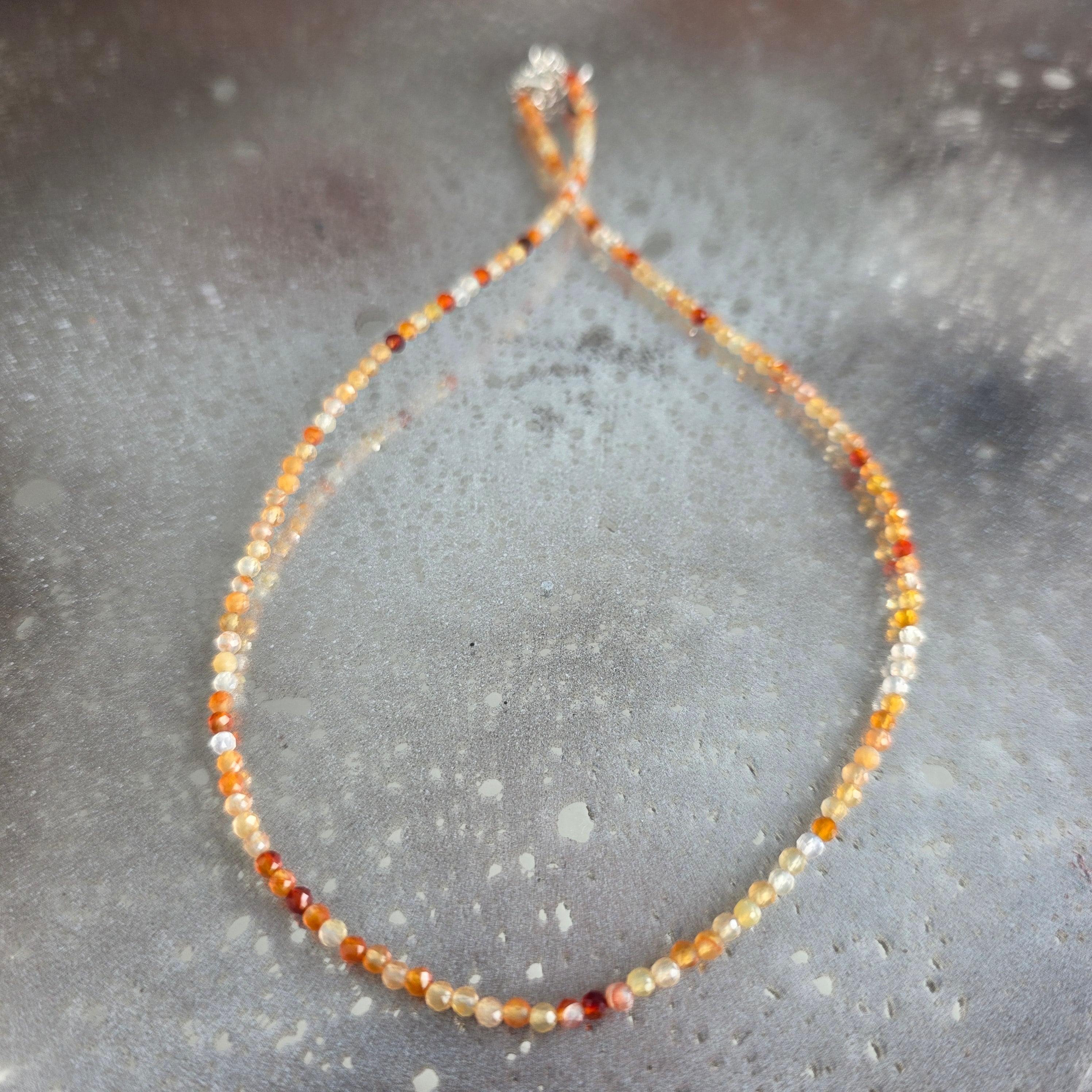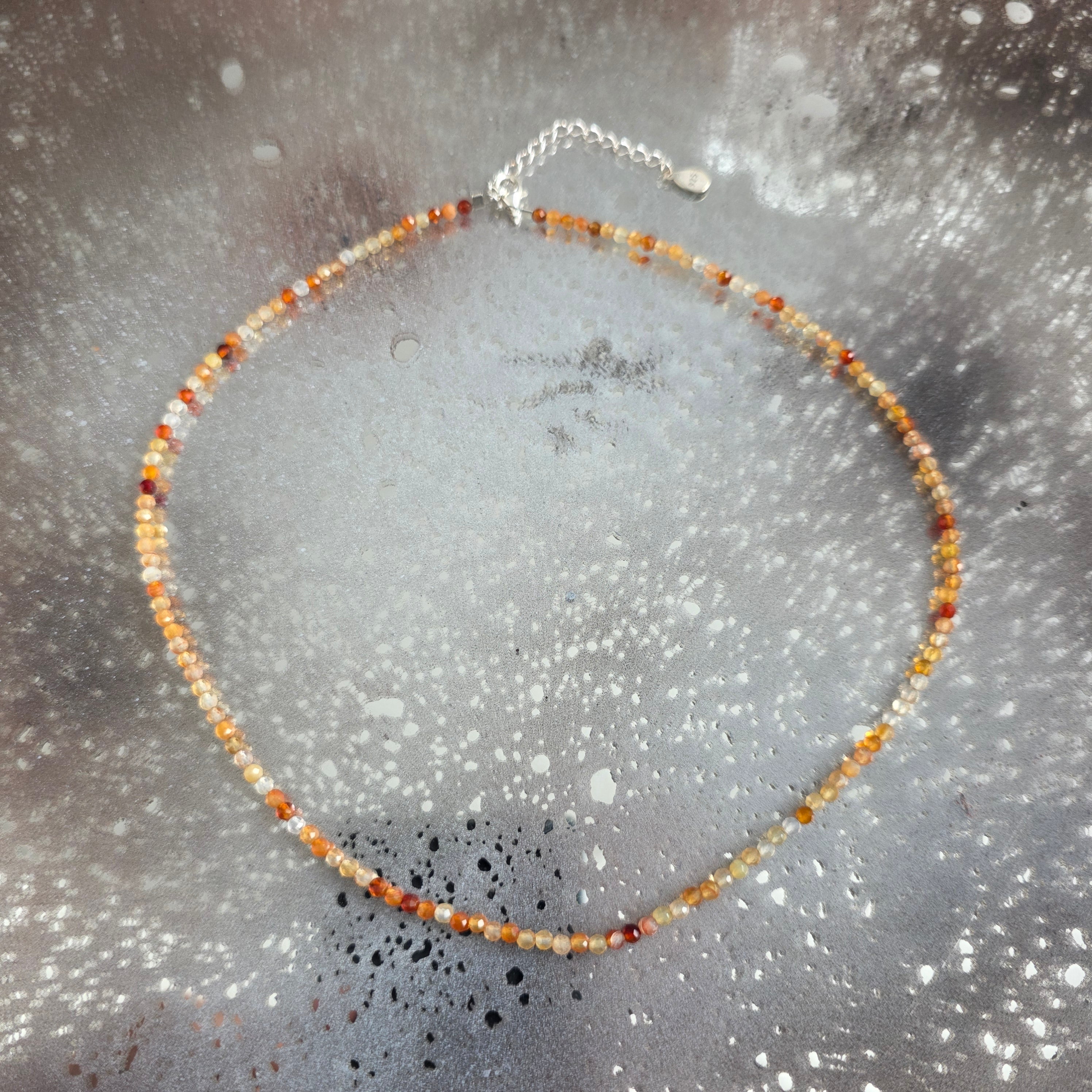 Ένα λεπτό αλλά ζωηρό κολιέ, σαν μια γραμμή φωτιάς που σχεδιάζεται με ακρίβεια. Οι πολύπλευρες χάντρες καρνεόλης, μόλις 3 mm, λάμπουν διακριτικά σε διάφορες αποχρώσεις του πορτοκαλί και του κόκκινου – σαν πιτσιλιές ζεστού φωτός που συλλέγονται από ένα τροπικό ηλιοβασίλεμα.