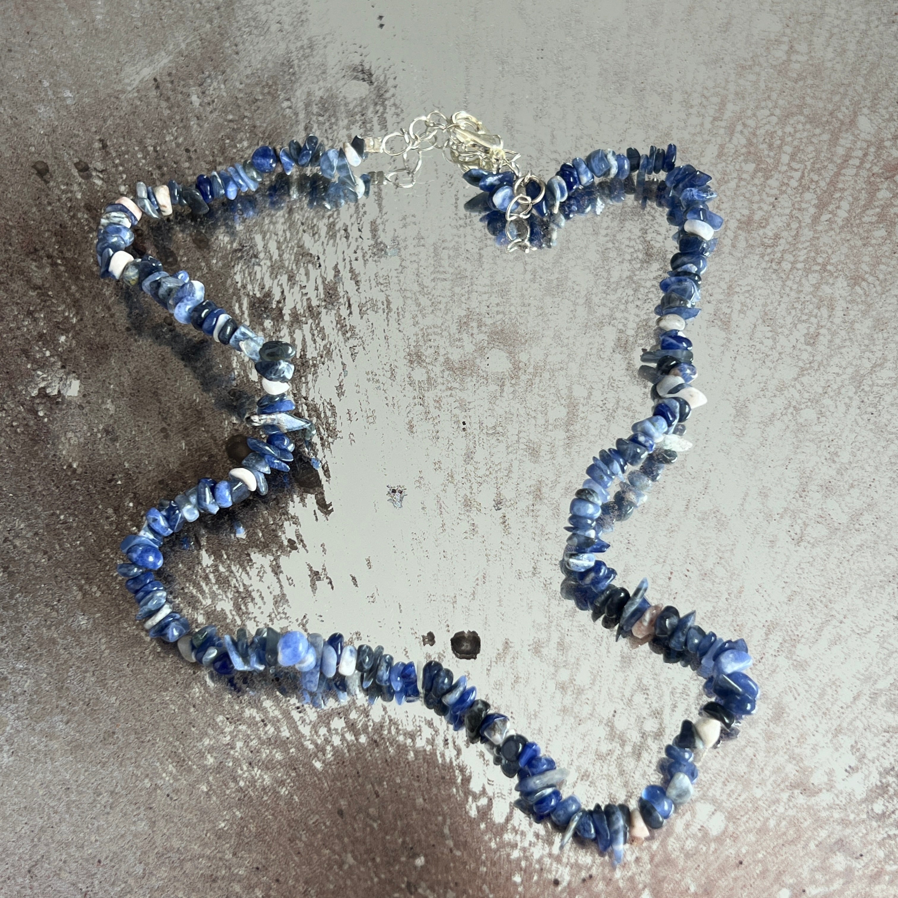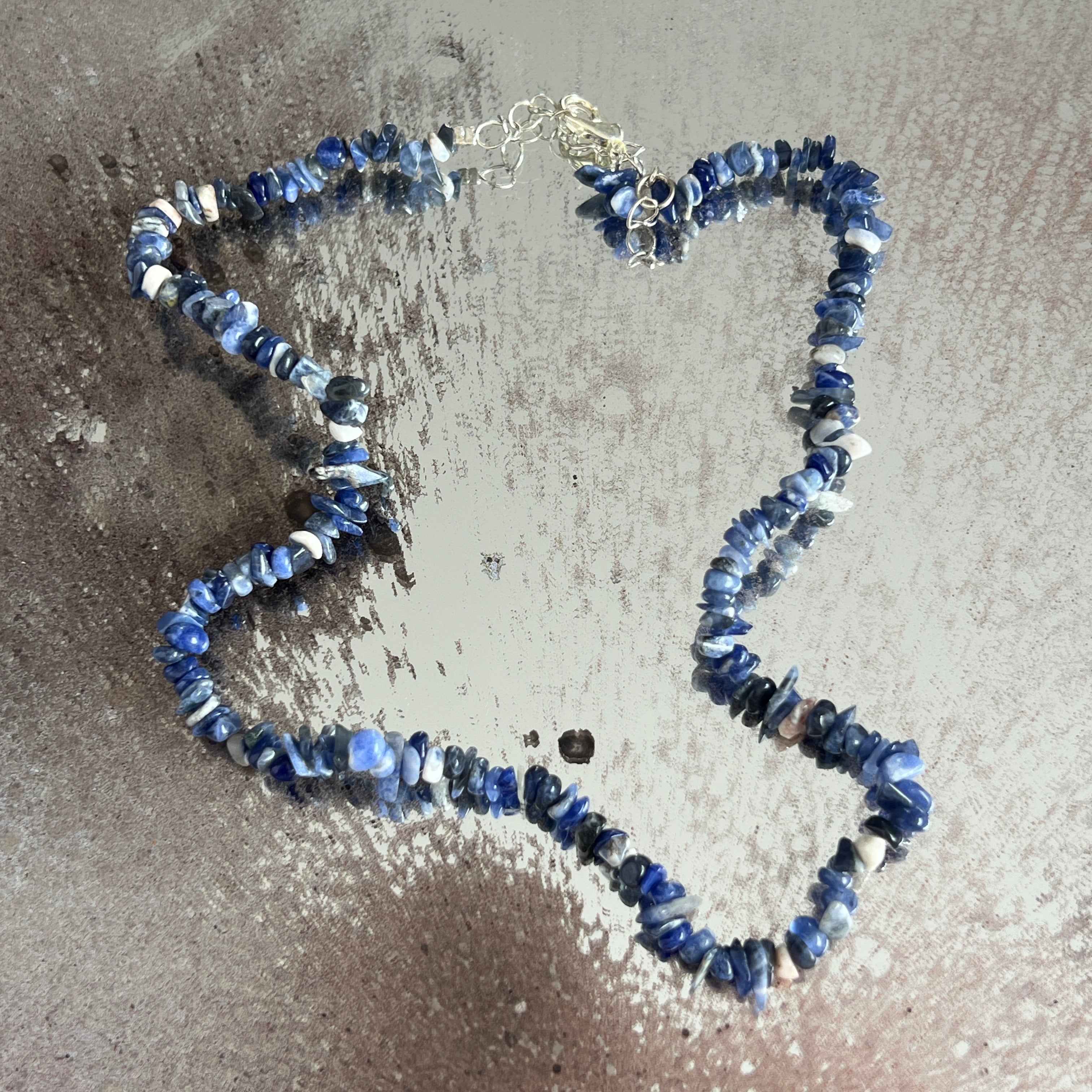 Κολιέ φτιαγμένο από φυσικό σοδαλίτη, εκτιμώμενο για το βαθύ μπλε χρώμα του, διασκορπισμένο με λευκές κλωστές που συχνά μιμούνται την υφή των σύννεφων στον νυχτερινό ουρανό. Τα ακανόνιστα chips, με οργανική όψη, προσδίδουν στο κόσμημα ένα μποέμ και αυθεντικό ύφος, ιδανικό για τους λάτρεις των φυσικών κρυστάλλων και των υπερβολικά ανεπεξέργαστων σχεδίων.