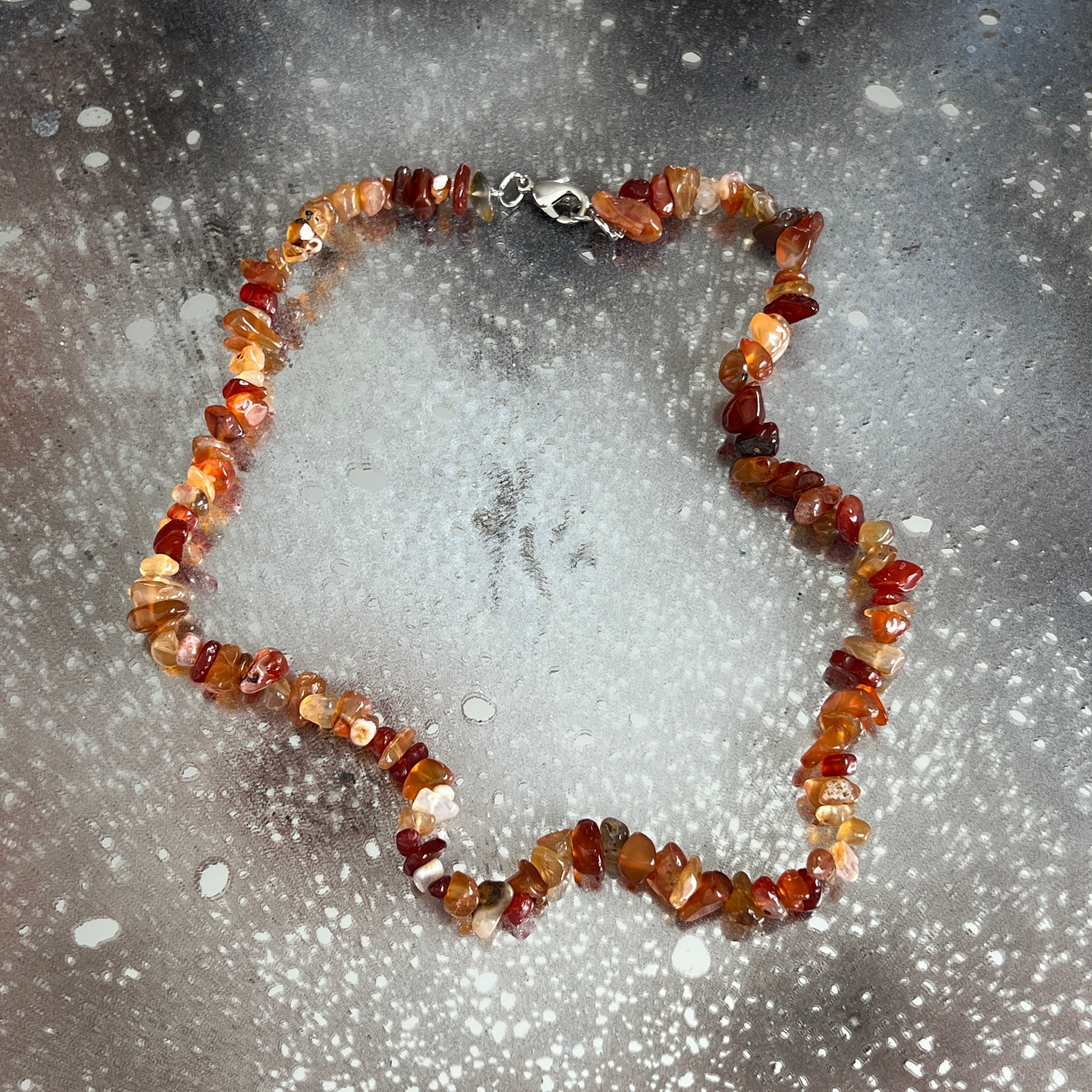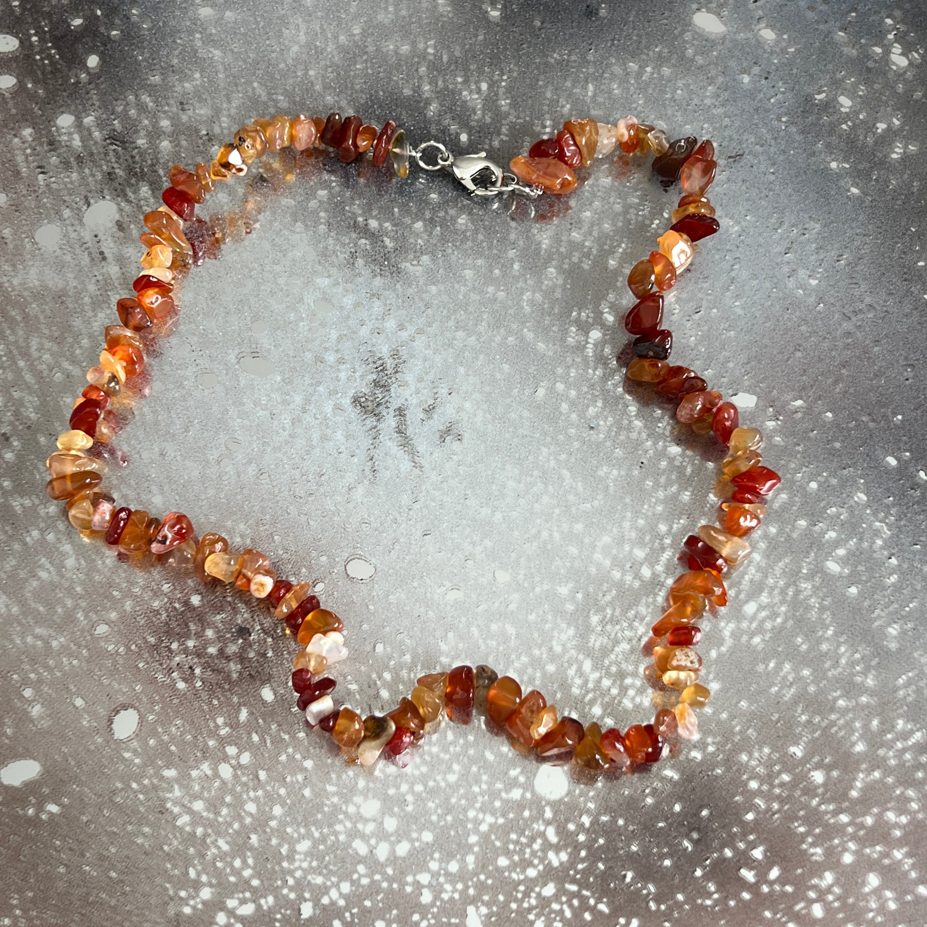Ένα κοντό, ζωντανό κολιέ, δημιουργημένο από κομμάτια φυσικού καρνεόλου, που φέρει τη λάμψη των φωτεινών ηλιοβασιλεμάτων και την πρωταρχική ενέργεια της Γης. Κάθε κομματάκι καρνεόλου, με αποχρώσεις από έντονο πορτοκαλί έως διαφανές τούβλινο κόκκινο, φέρνει μια δόση ζεστασιάς και θάρρους σε αυτόν που το φορά.