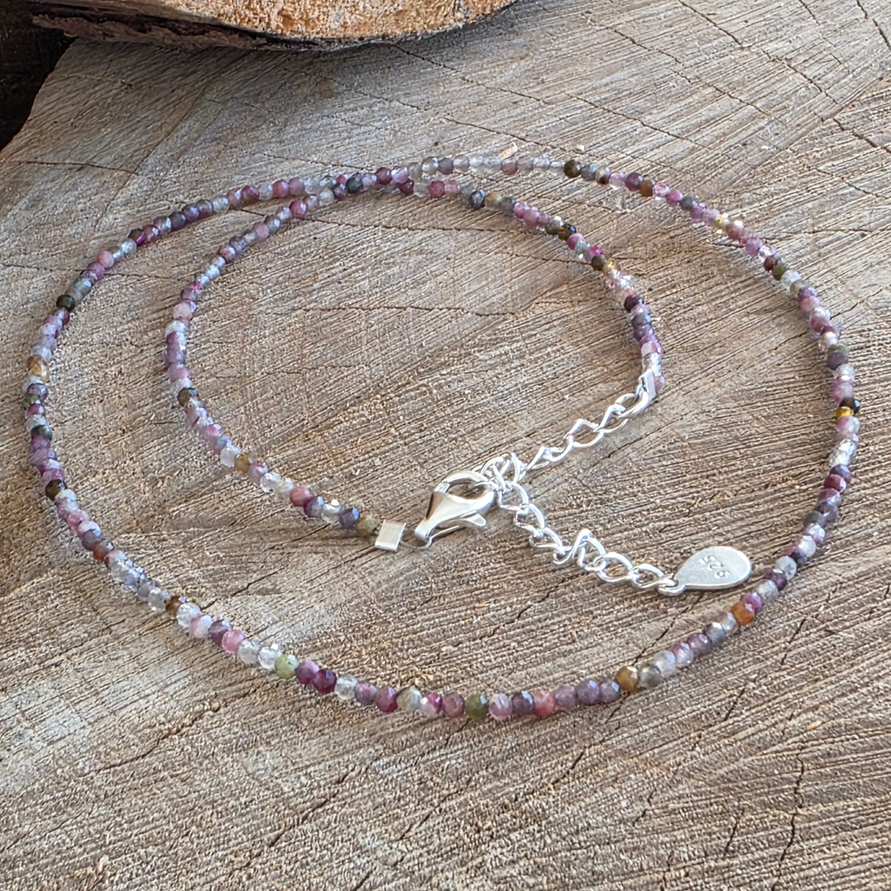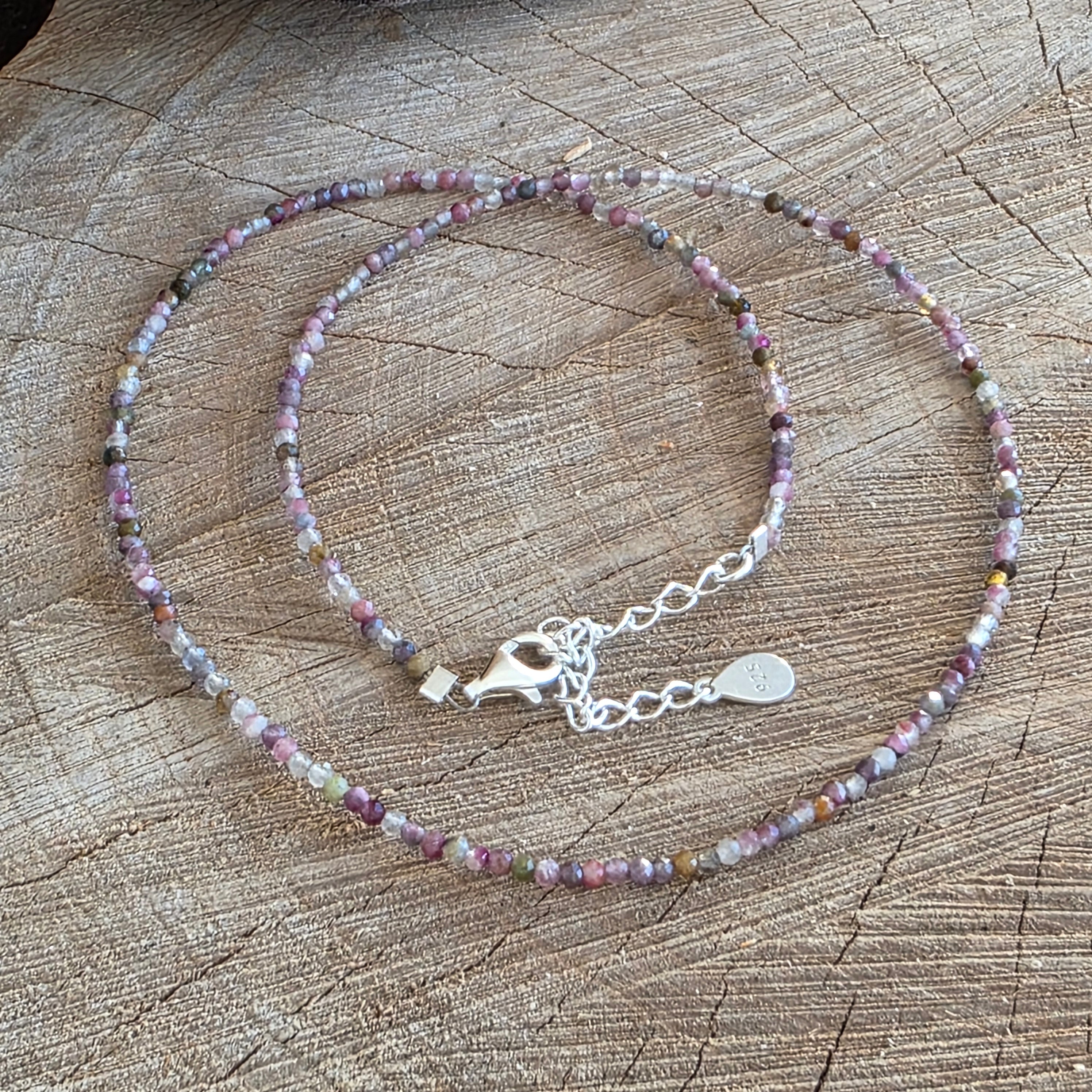 Ένα λεπτό και εκφραστικό κολιέ, φτιαγμένο από 2 mm στρογγυλά κοψίματα ροζ τουρμαλίνης, που σχηματίζουν μια λεπτή, κομψή και αρμονική γραμμή γύρω από το λαιμό. Οι φυσικές αποχρώσεις του ροζ, από τις απαλές τόνους μέχρι τις πιο έντονες, δημιουργούν ένα διακριτικό παιχνίδι χρωμάτων, ενώ το κόψιμο προσθέτει διακριτικές αντανακλάσεις, χωρίς να επιβαρύνει οπτικά το κόσμημα. Πρόκειται για ένα αέρινο, θηλυκό και ισορροπημένο σχέδιο που αναδεικνύει την πραγματική ομορφιά της πέτρας.