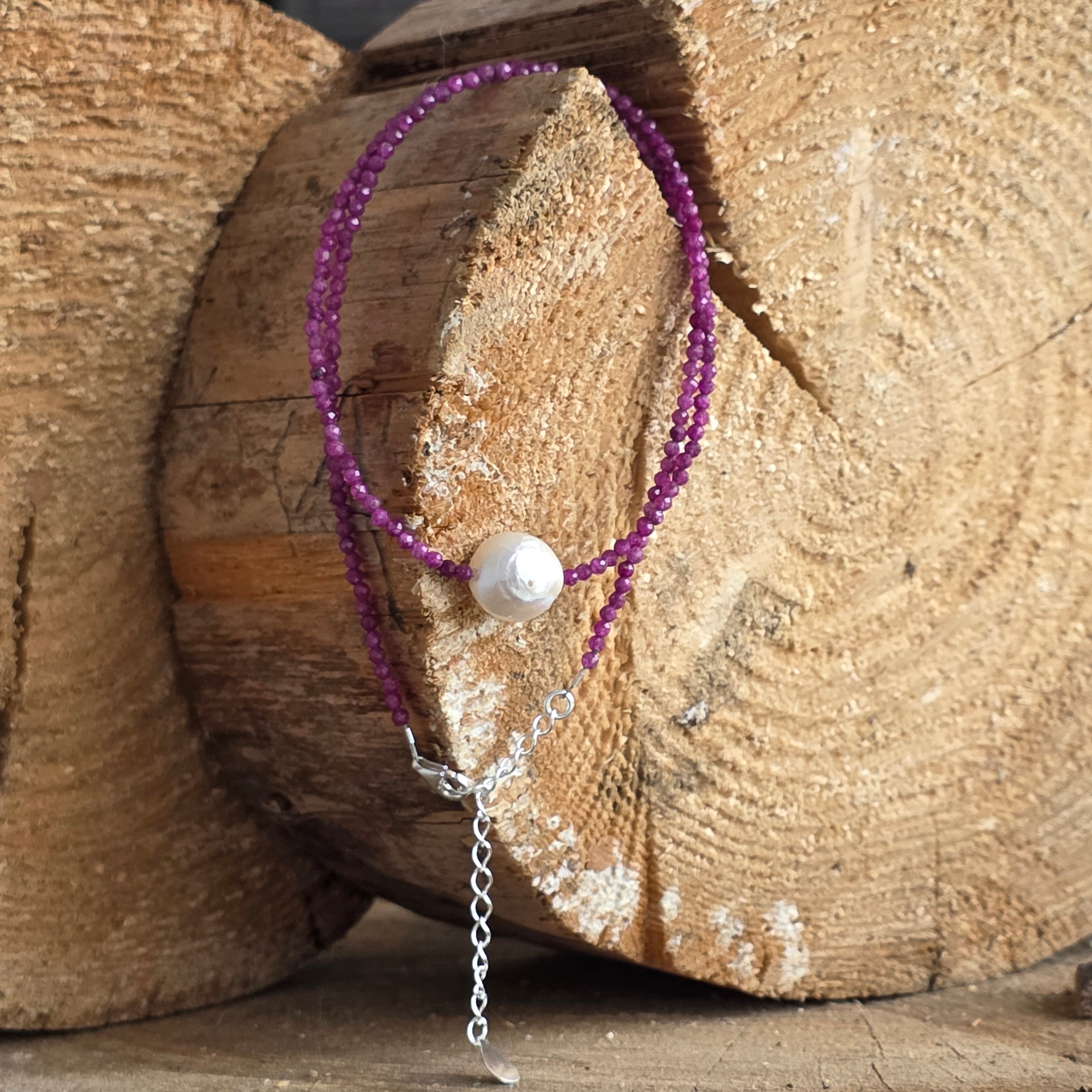 Ένα λεπτό, αλλά εντυπωσιακό κολιέ, φτιαγμένο από σφαιρίδια φυσικού ρουμπινιού με κοπή 2,5 mm, σε μια βαθιά έντονη κερασί απόχρωση, με ζεστές και σχεδόν βασιλικές αντανακλάσεις. Κάθε μικρή και ήσυχη πέρλα αντανακλά διακριτικά το φως, σαν ψίθυρος πάθους, πρόθεσης και εσωτερικής ευγένειας.