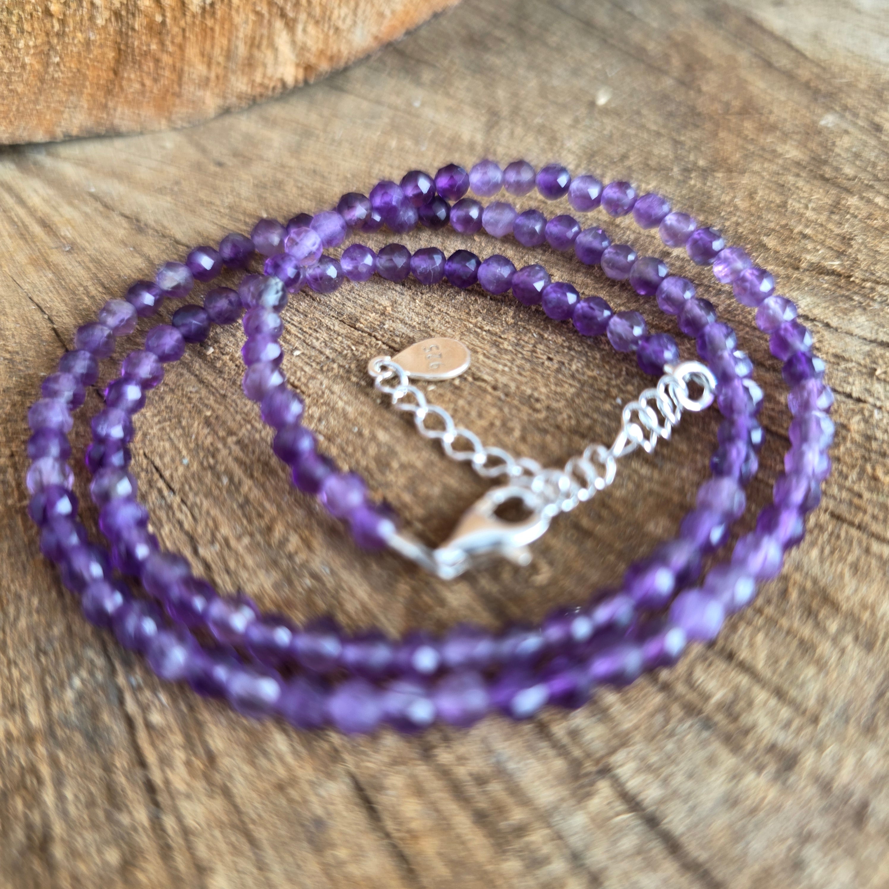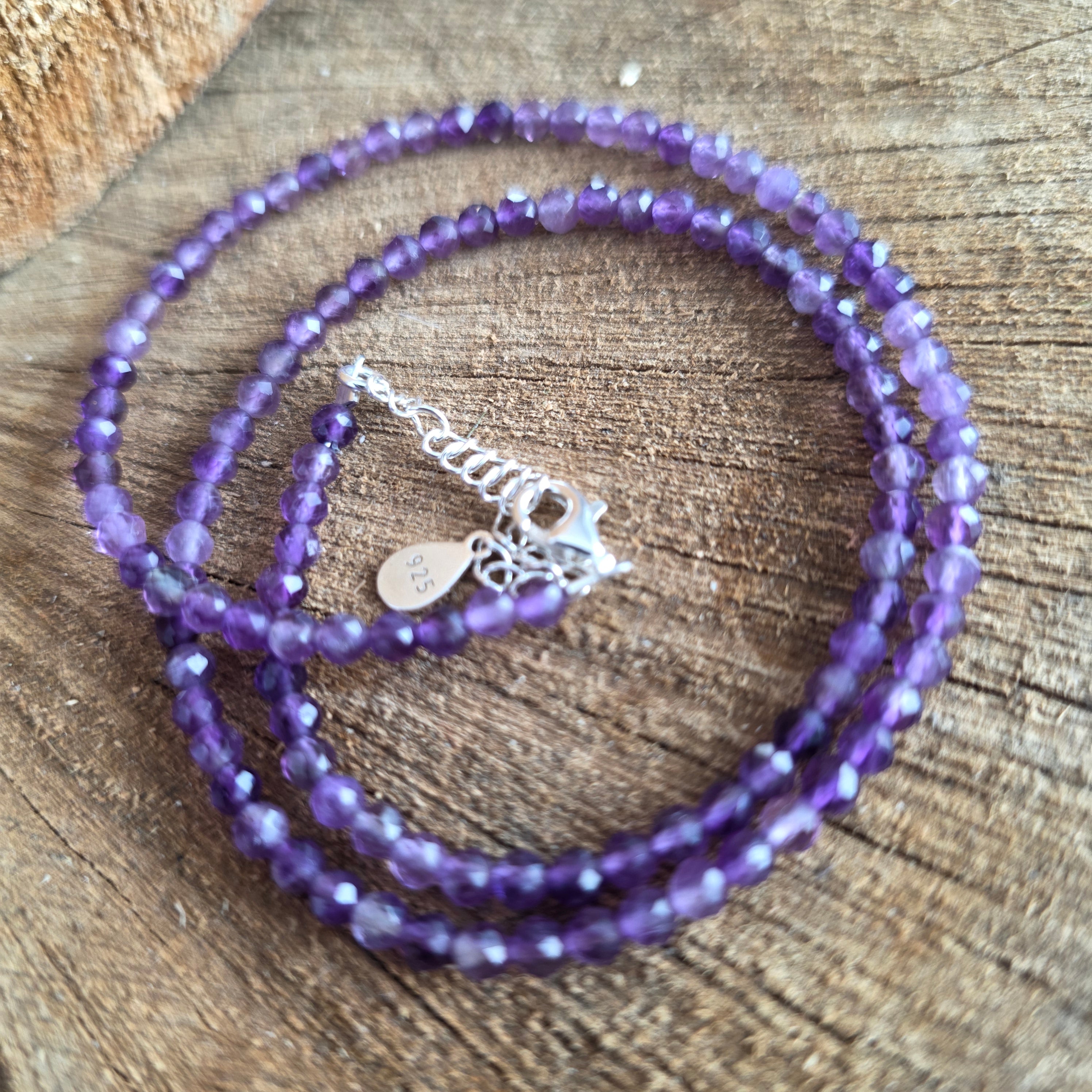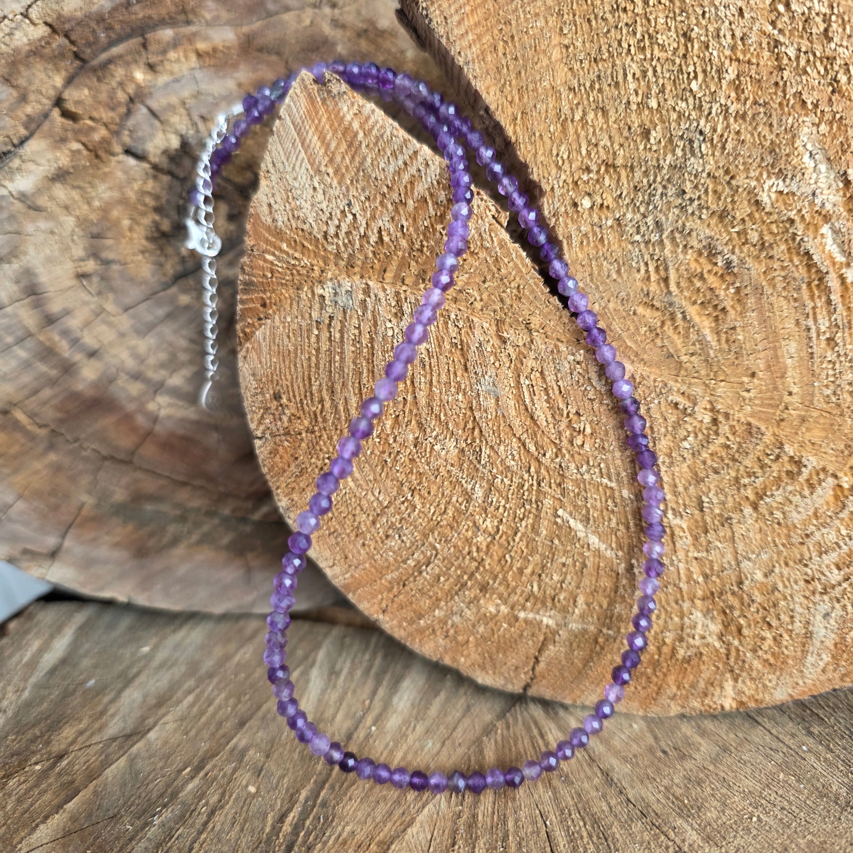 Ένα κολιέ που φέρνει μαζί του τη λεπτότητα και τη διακριτική ευγένεια του ονείρου, σαν μια ψίθυρο μωβ που κρατιέται πάνω στο δέρμα. Οι χάντρες φυσικού αμέθυστου 6 χλστ., προσεκτικά κομμένες, λάμπουν διακριτικά, αντανακλώντας το φως με απαλό και χαριτωμένο ρυθμό.