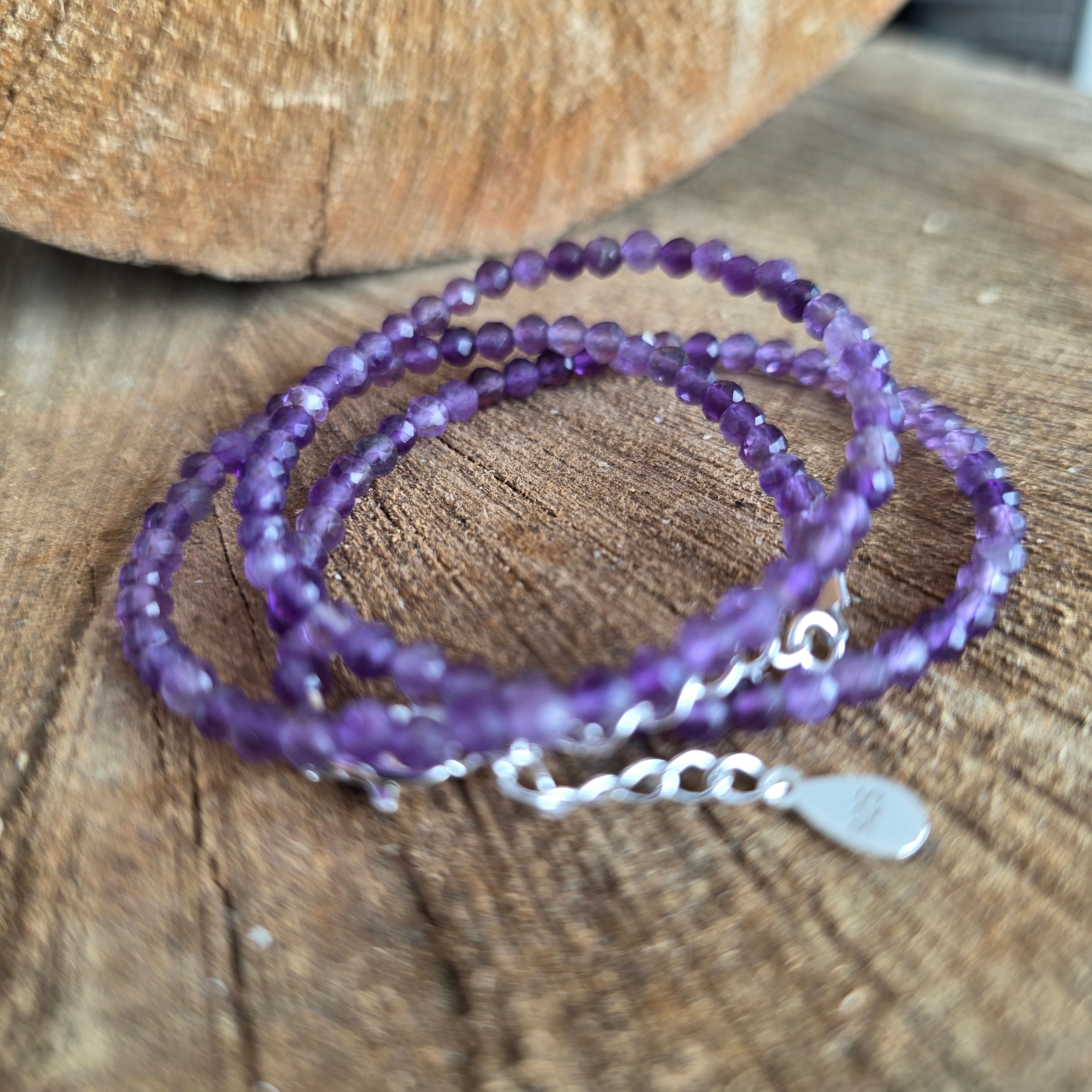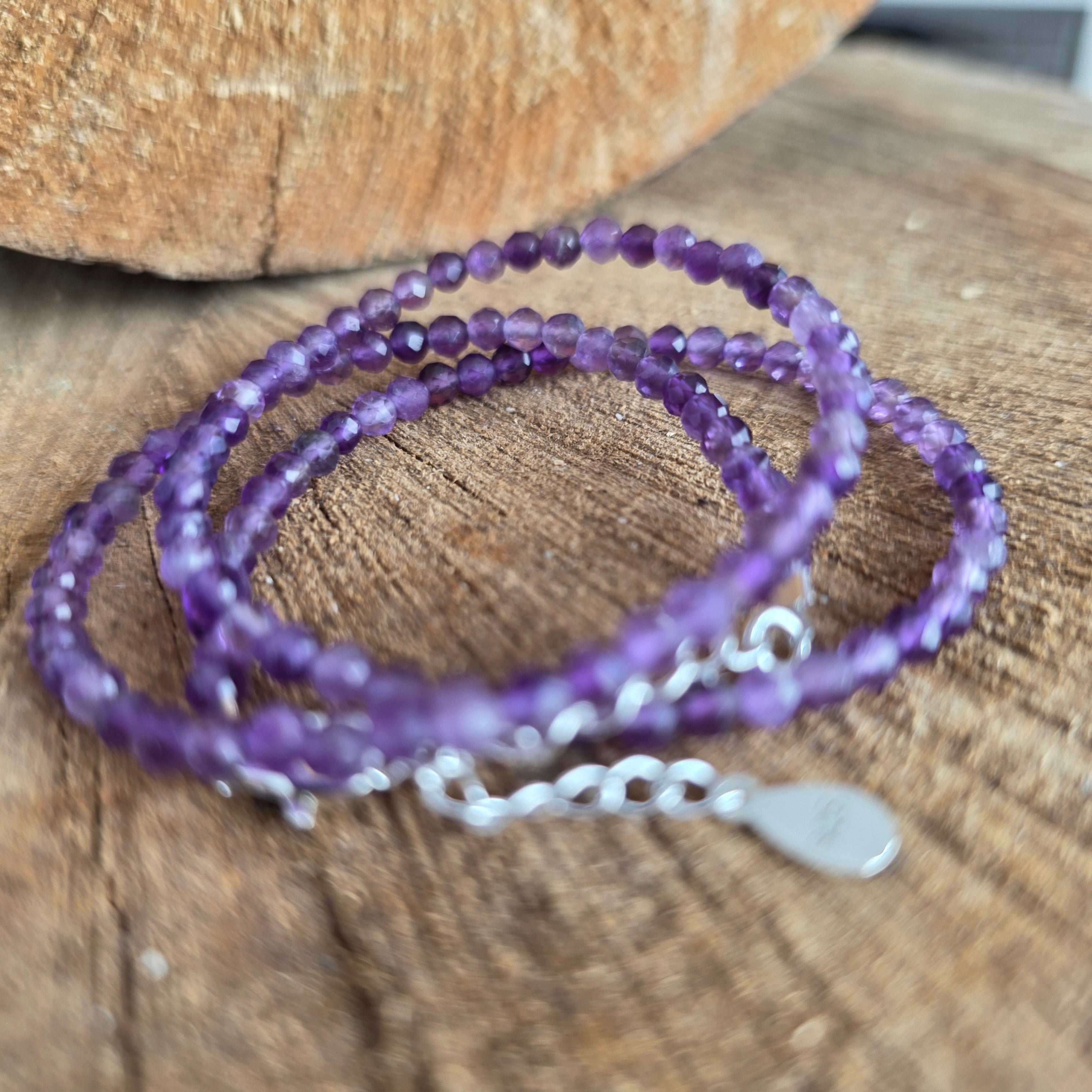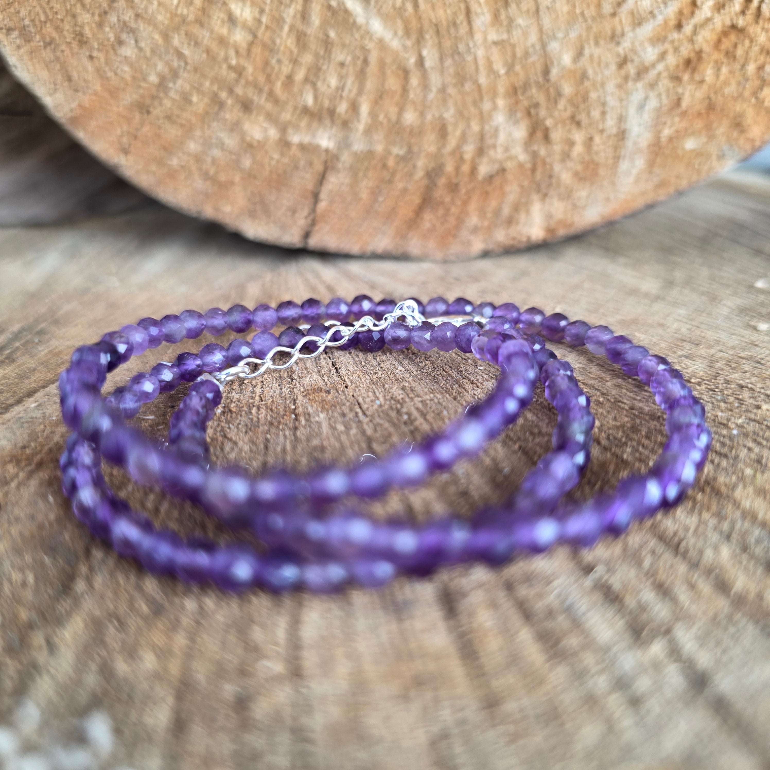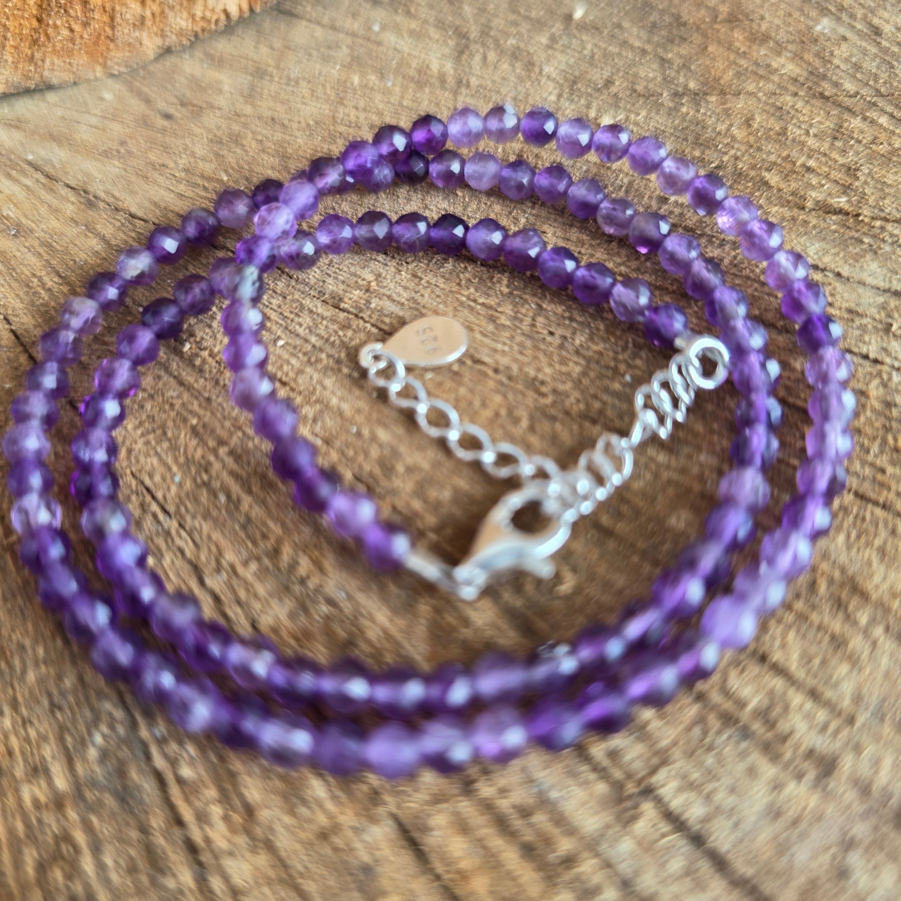 Ένα κολιέ που φέρνει μαζί του τη λεπτότητα και τη διακριτική ευγένεια του ονείρου, σαν μια ψίθυρο μωβ που κρατιέται πάνω στο δέρμα. Οι χάντρες φυσικού αμέθυστου 6 χλστ., προσεκτικά κομμένες, λάμπουν διακριτικά, αντανακλώντας το φως με απαλό και χαριτωμένο ρυθμό.