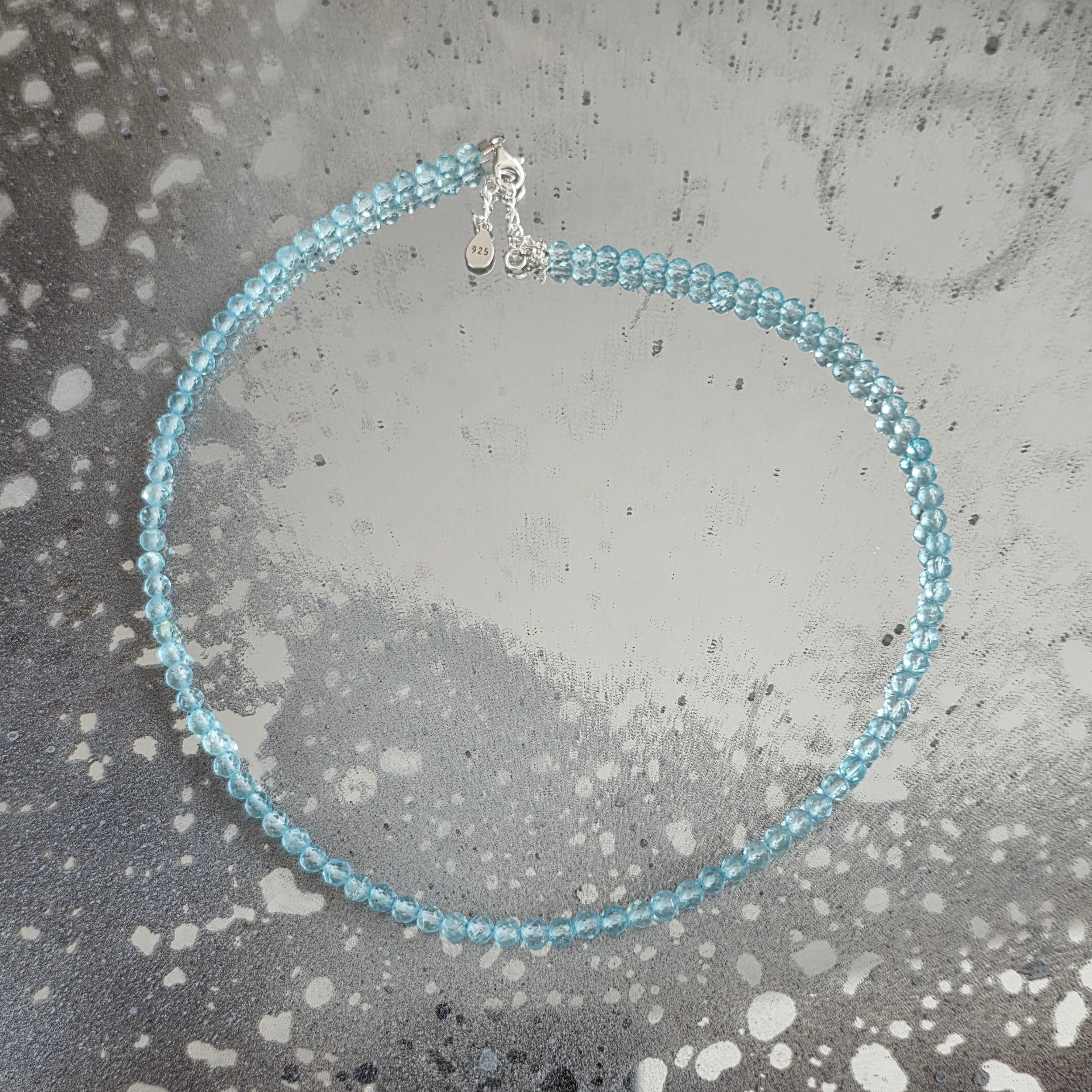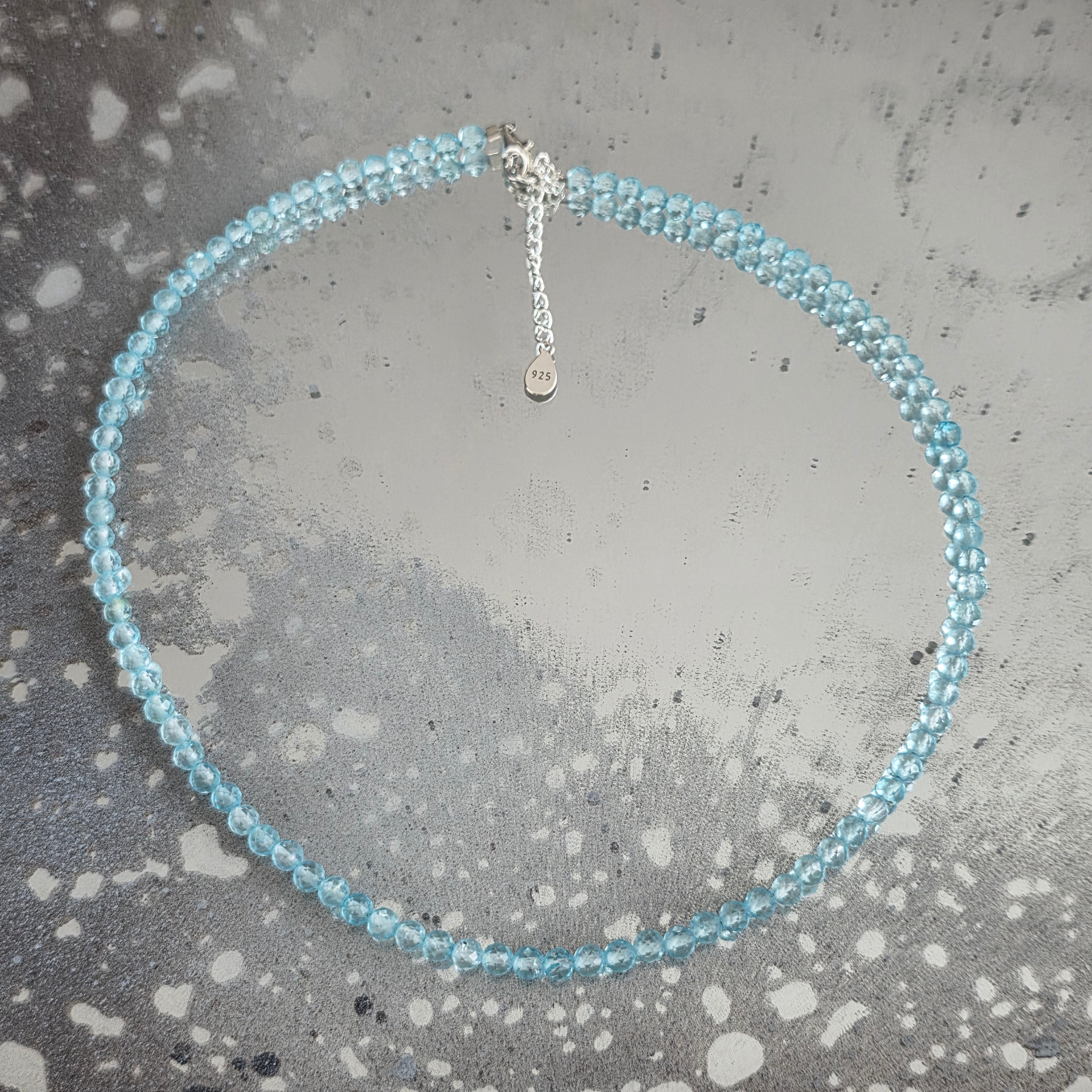 Ένα λεπτό και λαμπερό κολιέ, στο οποίο η σκαλιστή μπλε τοπάζι 4 mm αιχμαλωτίζει το φως σε διακριτικές ανακλάσεις, όπως η επιφάνεια του νερού μια ηλιόλουστη μέρα. Οι δροσερές και καθαρές αποχρώσεις του δημιουργούν μια κομψή παρουσία, εύκολη στη χρήση οποιαδήποτε στιγμή της ημέρας.