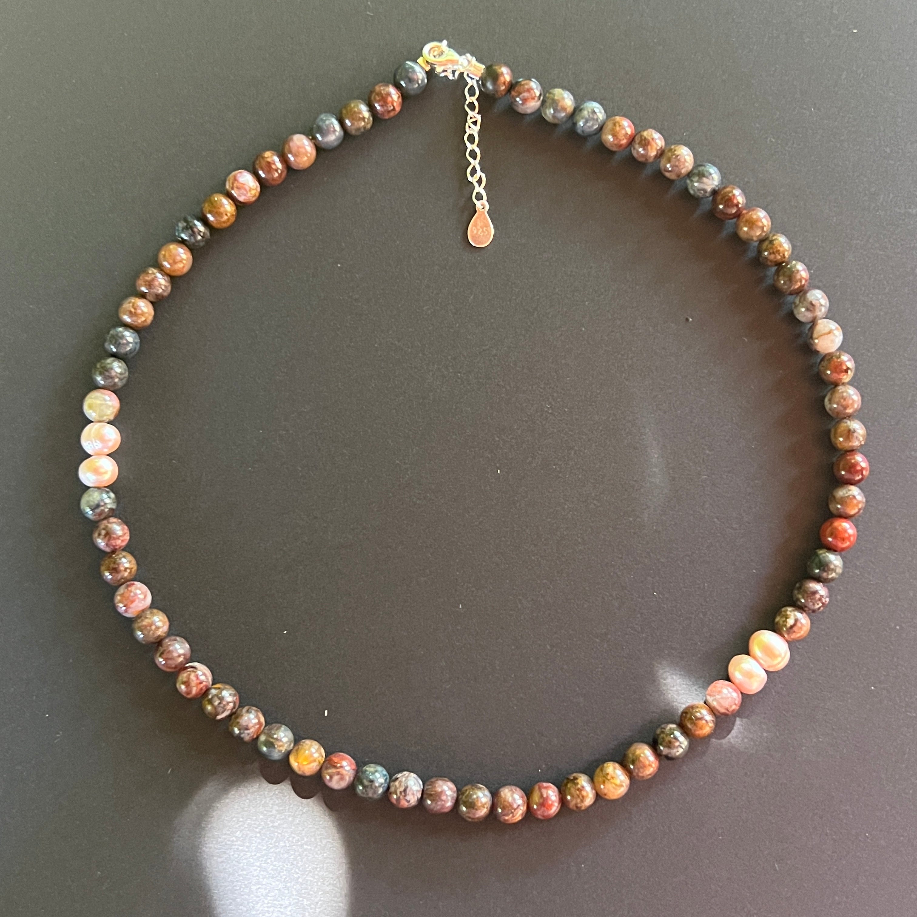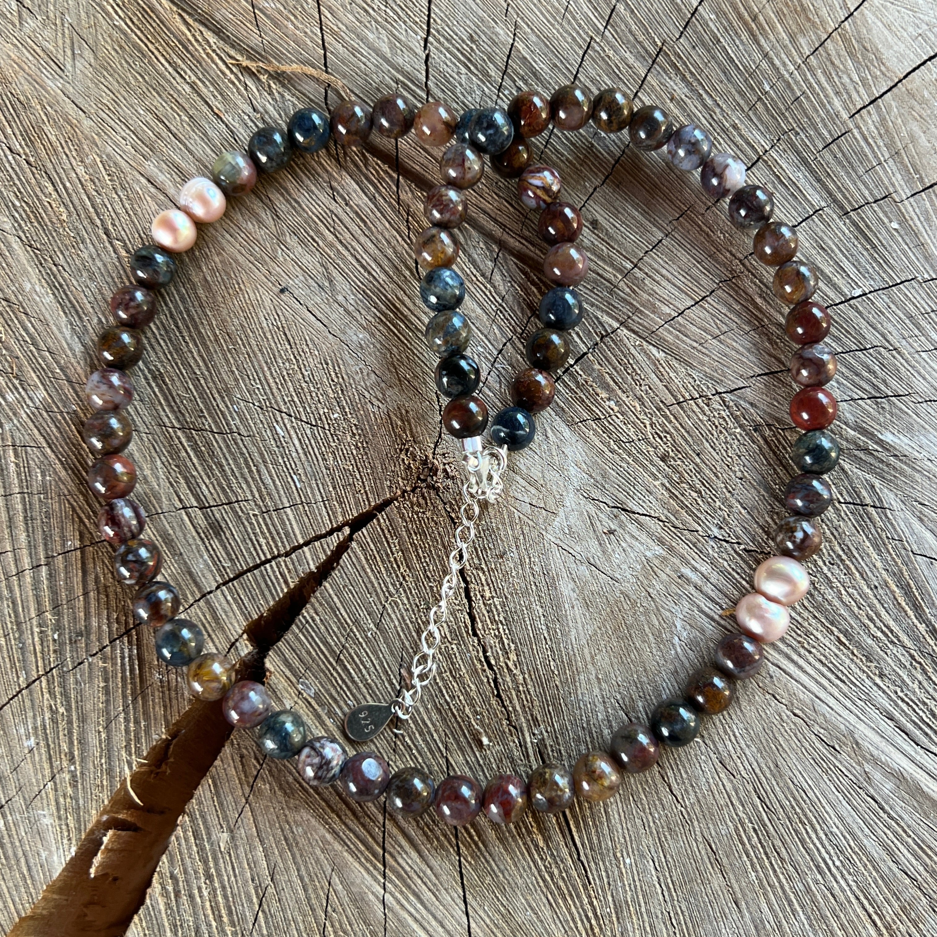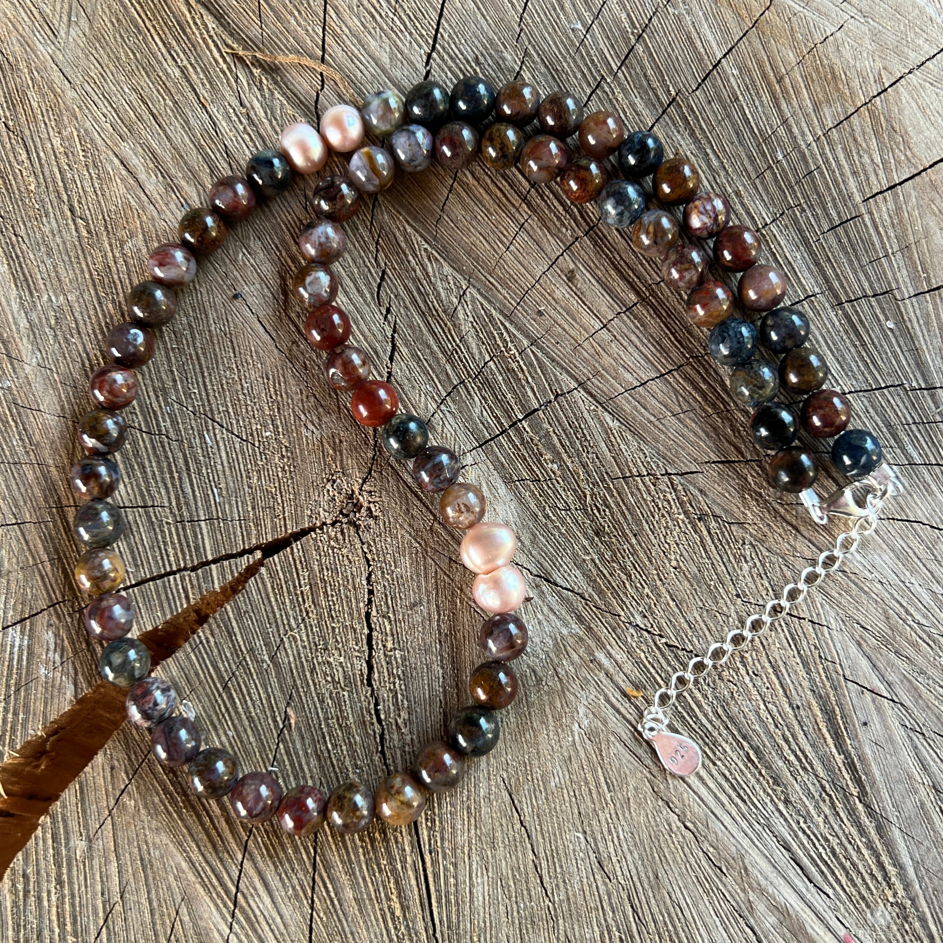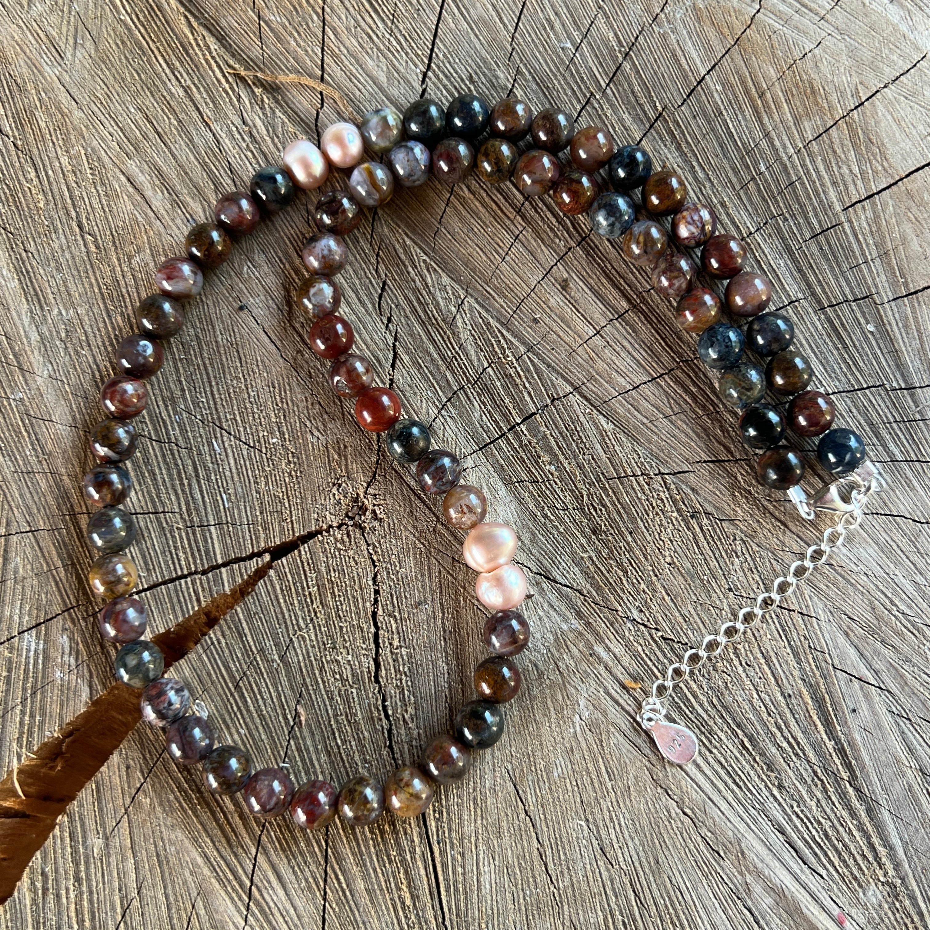 Ένα κολιέ σαν μια αστρική καταιγίδα που συνδέεται μεταξύ των νημάτων - έντονης, υπνωτικής και βαθιάς προστατευτικής. Οι αγορές 6 mm δονείται με σκούρο μπλε, χάλκινο, χρυσό και γκρι αποχρώσεις, δημιουργώντας ένα κινούμενο φως χορό, σαν ένα σιωπηλό ελαφρύ ουρανό.