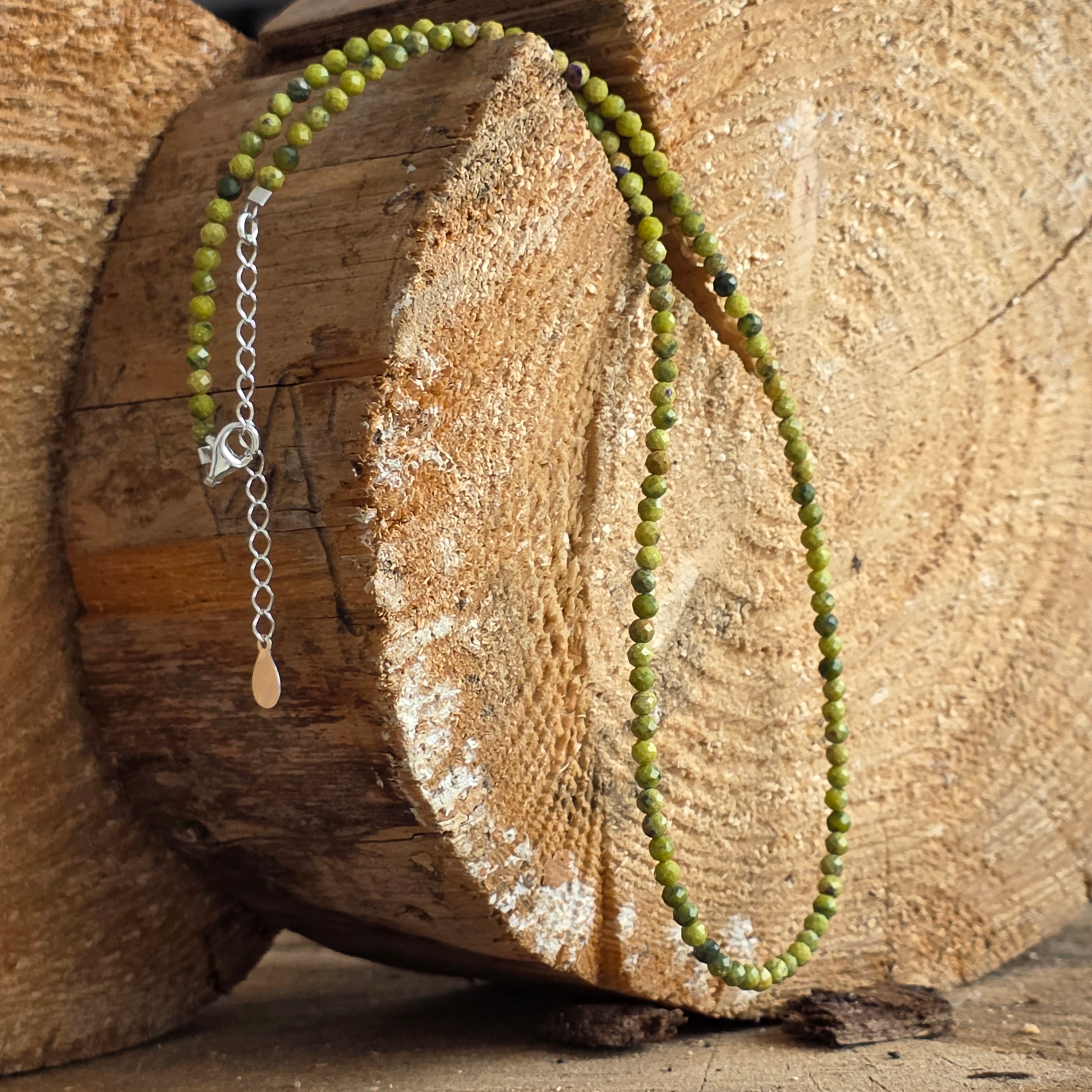 Ένα κολιέ που φέρει την ενέργεια της εσωτερικής αφύπνισης και της δύναμης της γης. Ο σερπεντίνης, με τις πράσινο-χρυσές αποχρώσεις του, θυμίζει την ηρεμία των δασών και την σιωπηλή δύναμη της φύσης που αναγεννάται συνεχώς. Οι φασέτες 3 χλστ συλλαμβάνουν λεπτά το φως, σαν τα λέπια ενός μυθικού όντος — εξ ου και το όνομά του, εμπνευσμένο από τα παλιά σύμβολα του ιερού φιδιού.