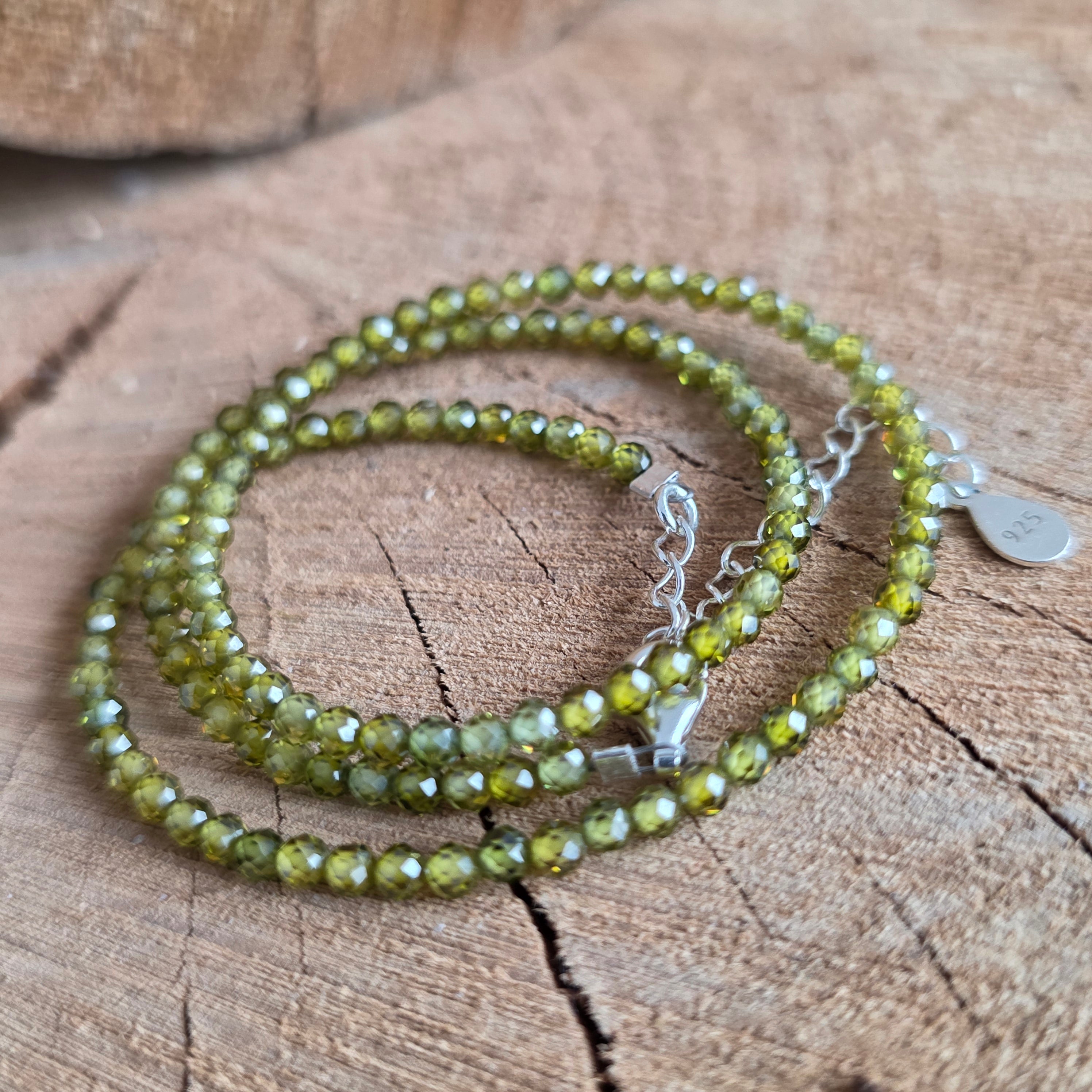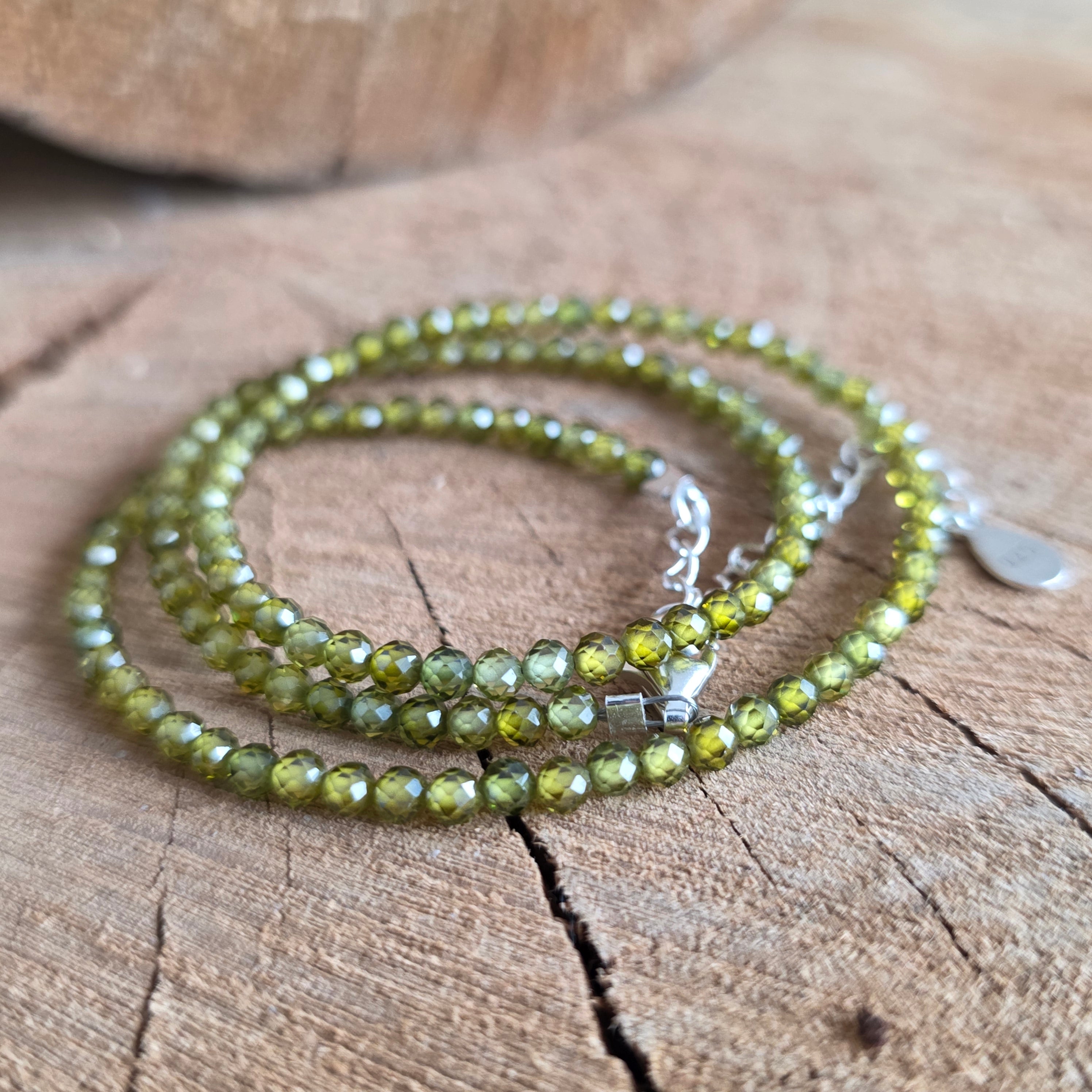 Αυτό το κολιέ είναι φτιαγμένο από φυσικό πράσινο ζιρκόνιο, επιλεγμένο για τις φρέσκες αποχρώσεις του και τη λεπτή, κομψή λάμψη του. Οι φασεταρισμένες χάντρες 2,5 mm αντανακλούν απαλά το φως, δημιουργώντας ένα διακριτικό παιχνίδι σπινθηρισμάτων που προσδίδει στο κόσμημα μια εκλεπτυσμένη και φωτεινή αίσθηση.