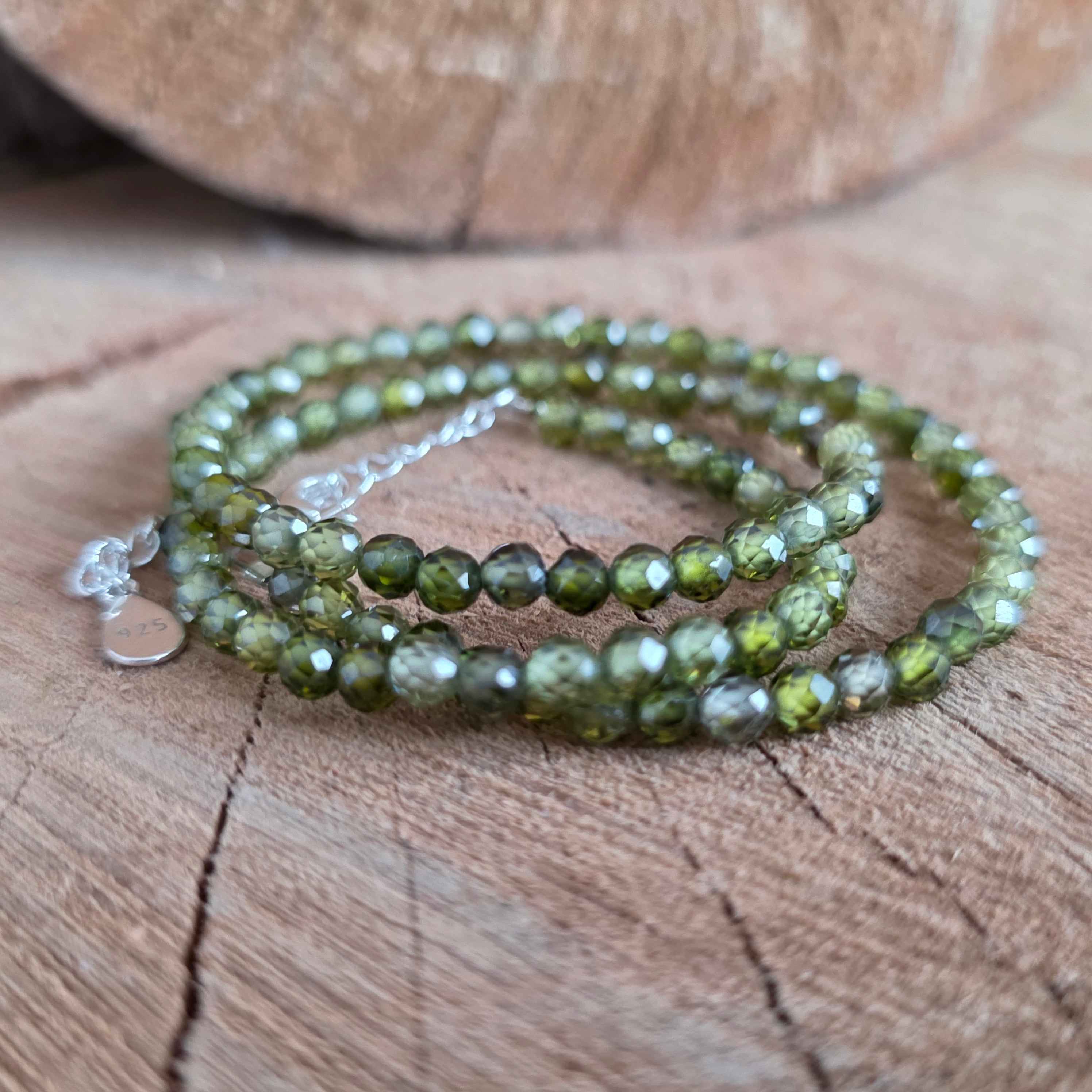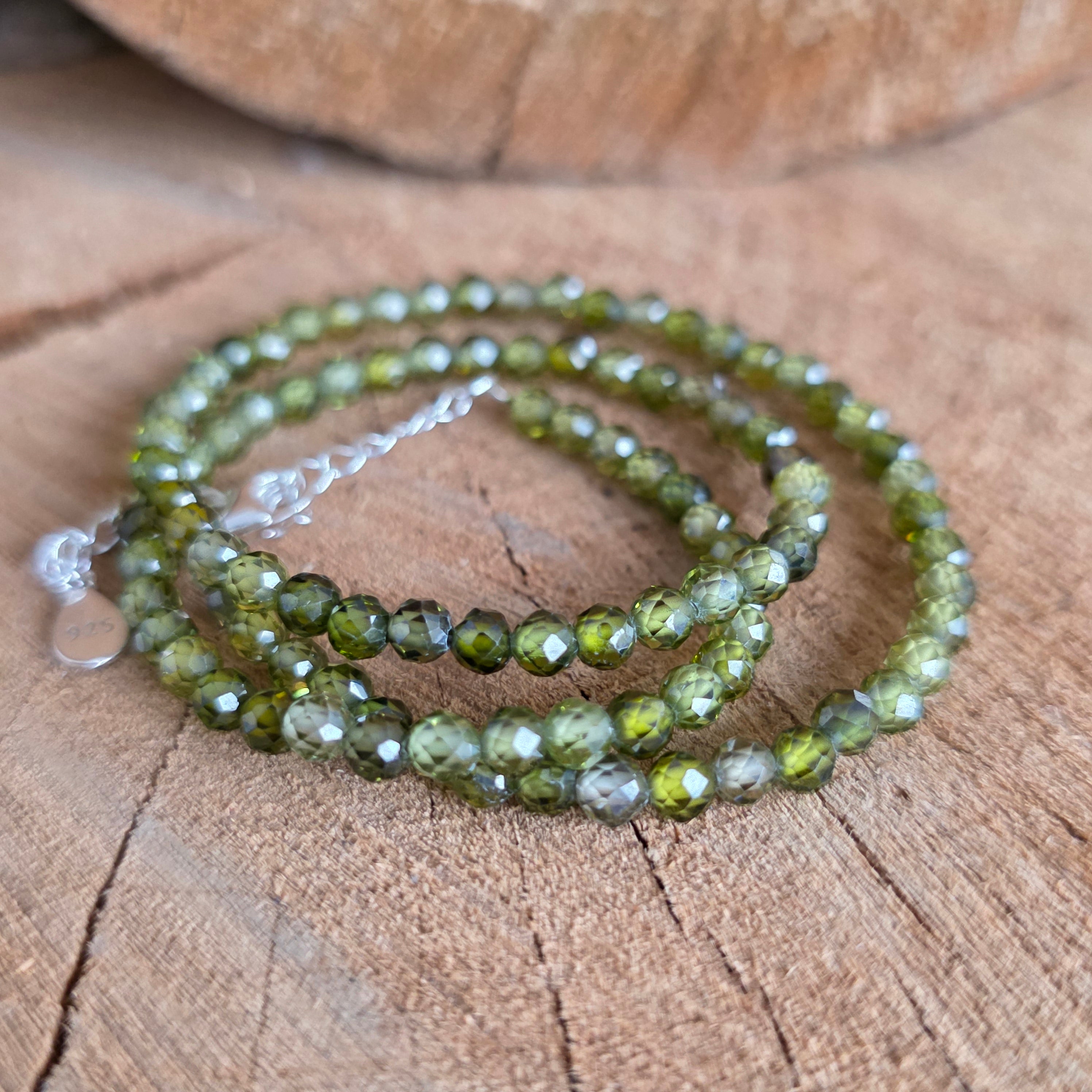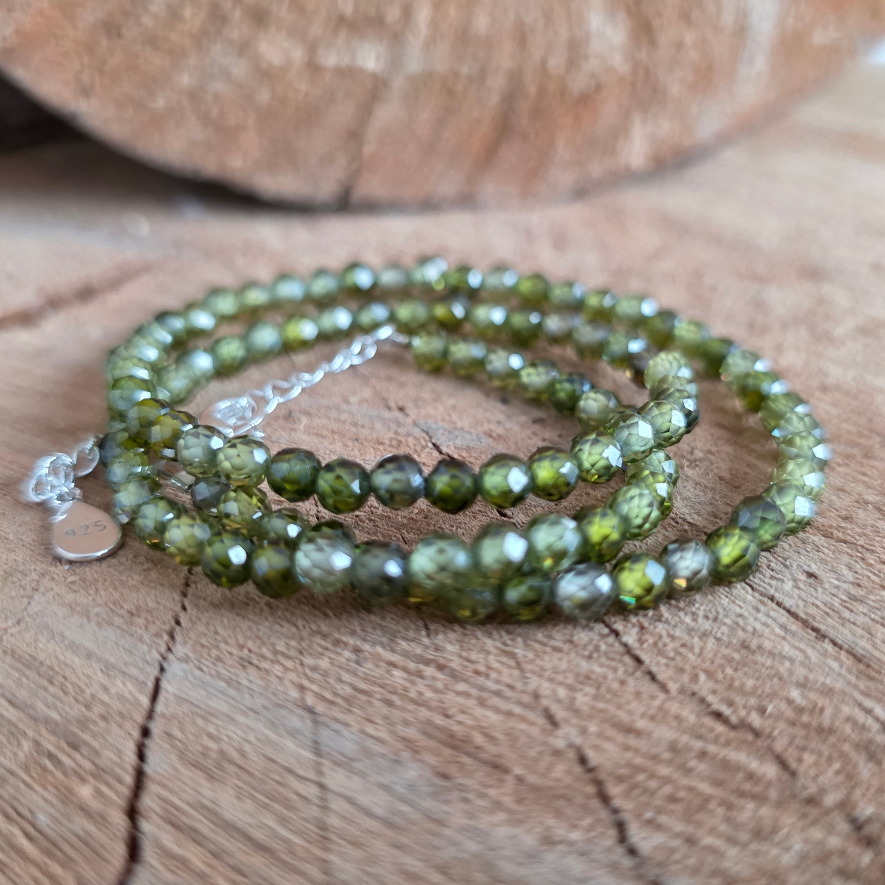 Αυτό το κολιέ είναι κατασκευασμένο από φυσικό πράσινο ζιρκόνιο, επιλεγμένο για τις φρέσκες αποχρώσεις του και για τη λεπτή, κομψή λάμψη του. Τα σφαιρίδια των 3 χλστ. αντανακλούν απαλά το φως, δημιουργώντας ένα λεπτό παιχνίδι σπινθηρισμών που προσδίδει στο κόσμημα έναν εκλεπτυσμένο και φωτεινό χαρακτήρα.