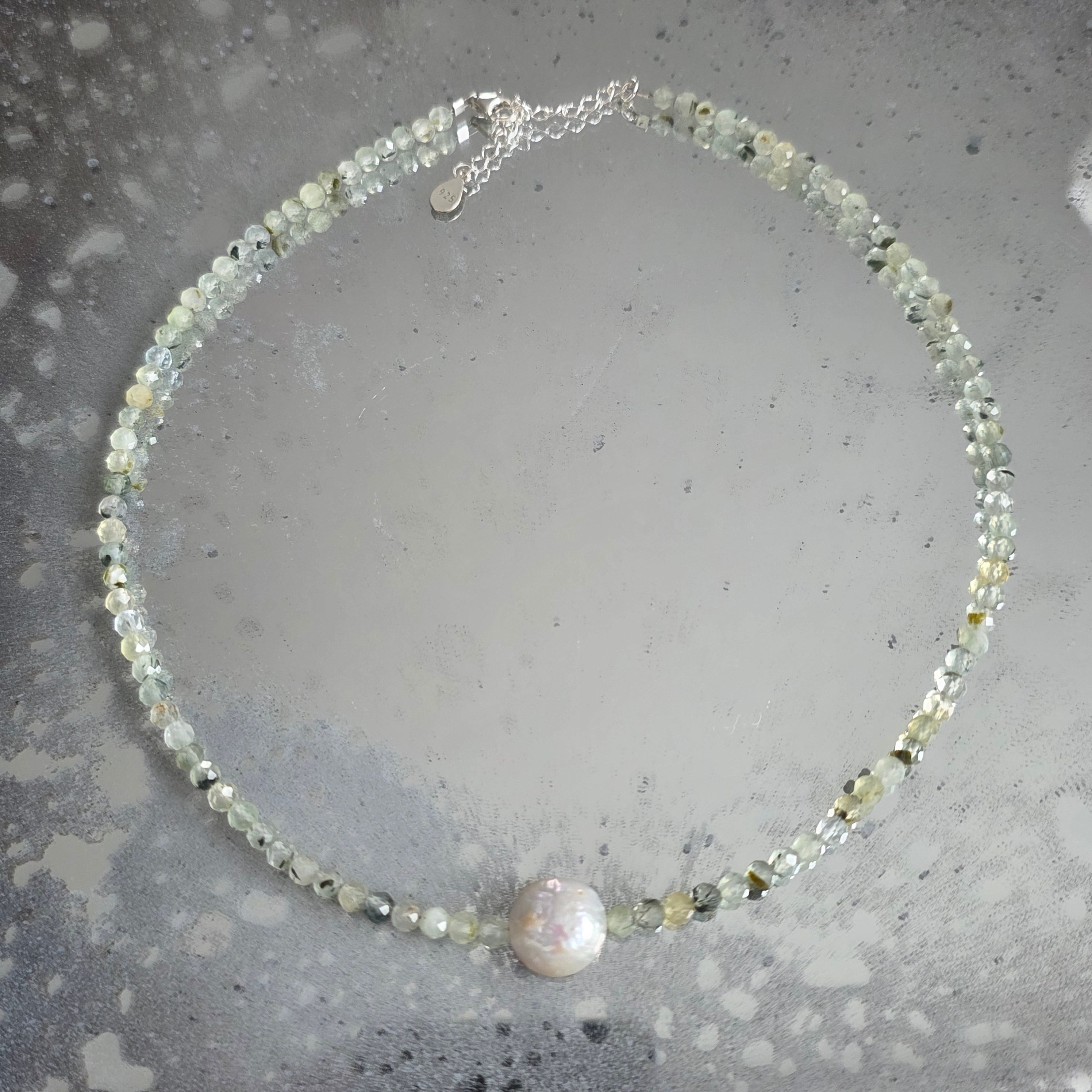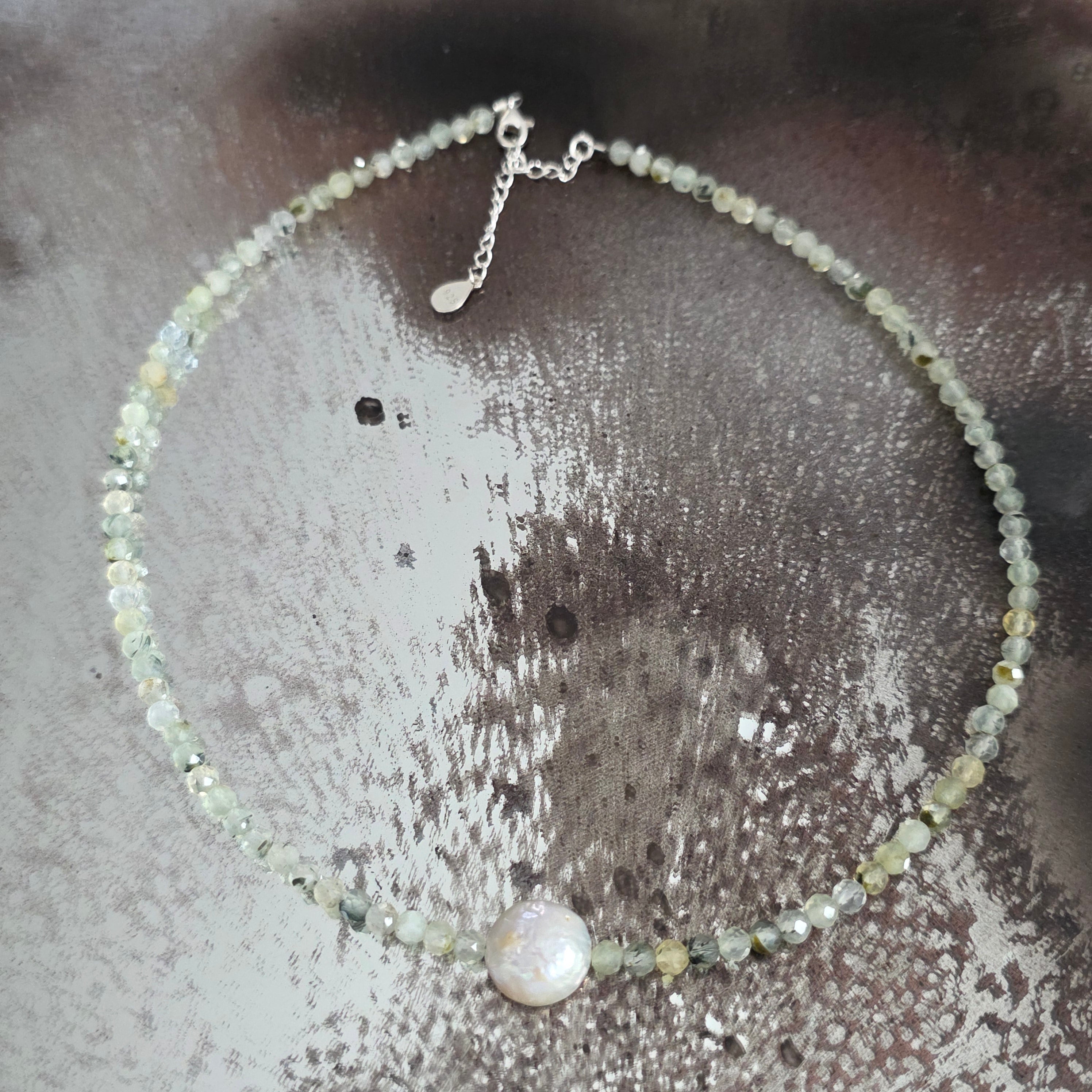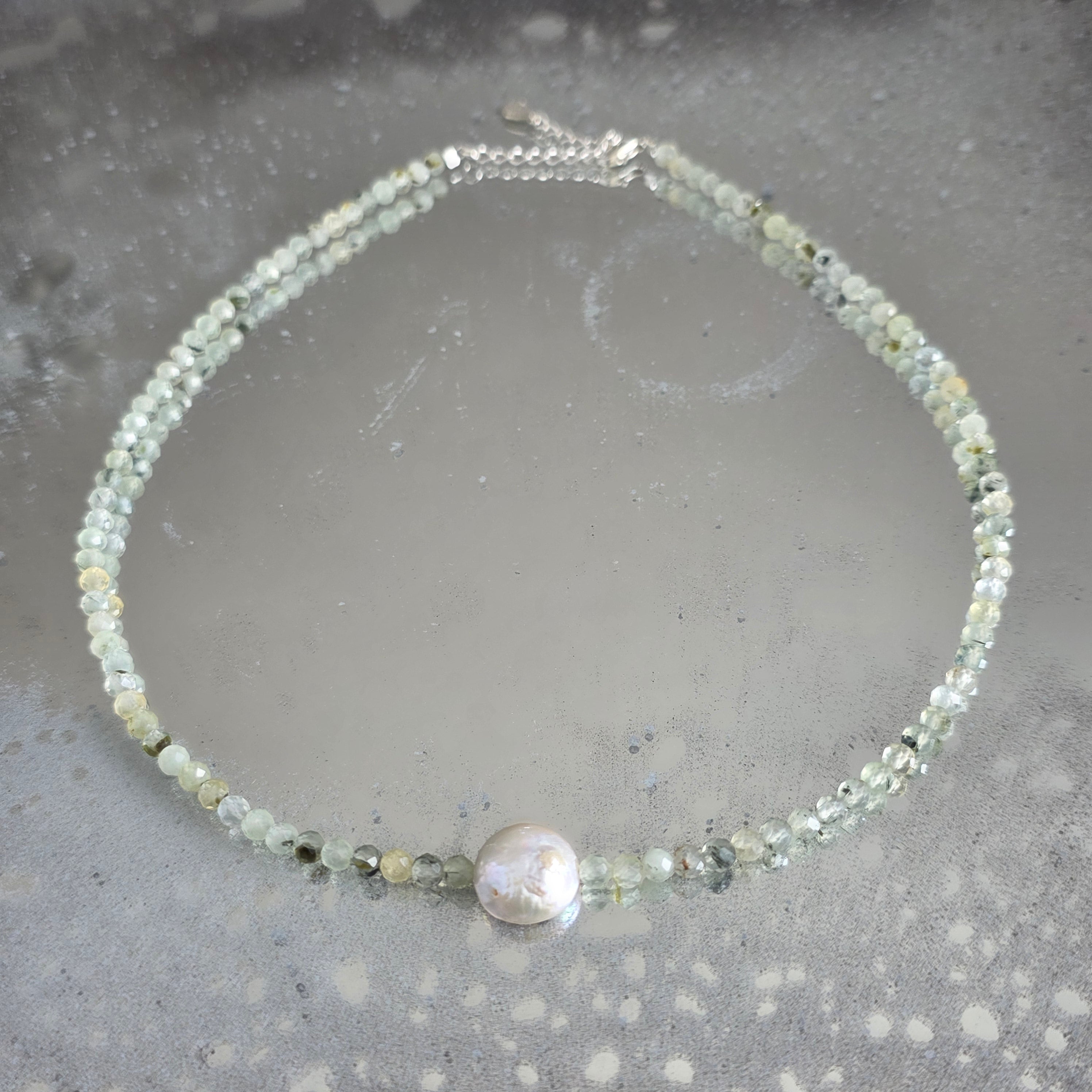Ένα λεπτεπίλεπτο και φωτεινό κολιέ, φτιαγμένο από φαγέτες σφαίρες πρενίτη 4 mm, τοποθετημένες με λεπτότητα σε ήρεμο και ισορροπημένο ρυθμό. Στο κέντρο της σύνθεσης, ένα φυσικό μαργαριτάρι περίπου 1 cm γίνεται το σημείο ηρεμίας και κομψότητας, προσθέτοντας στο κόσμημα μια νότα διαχρονικής κομψότητας.