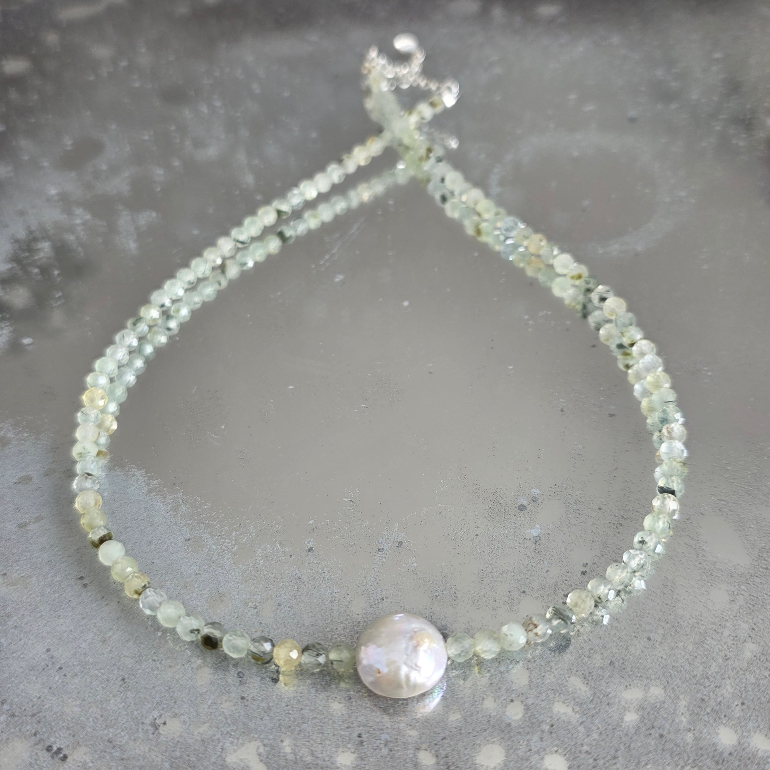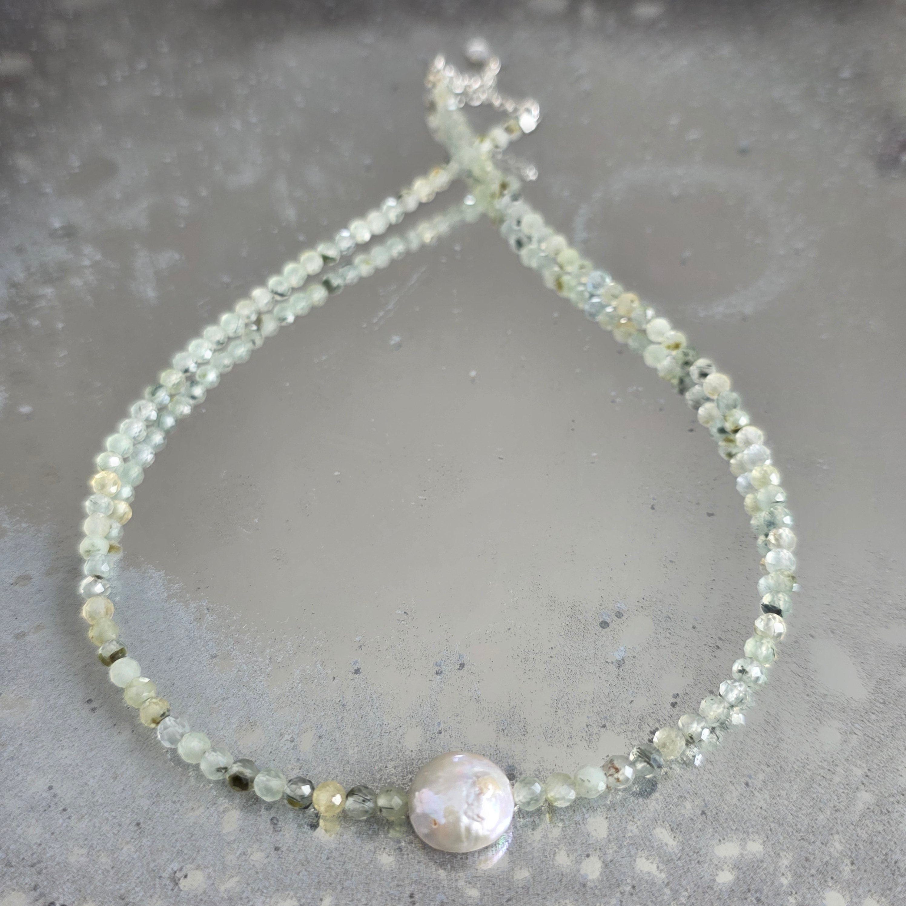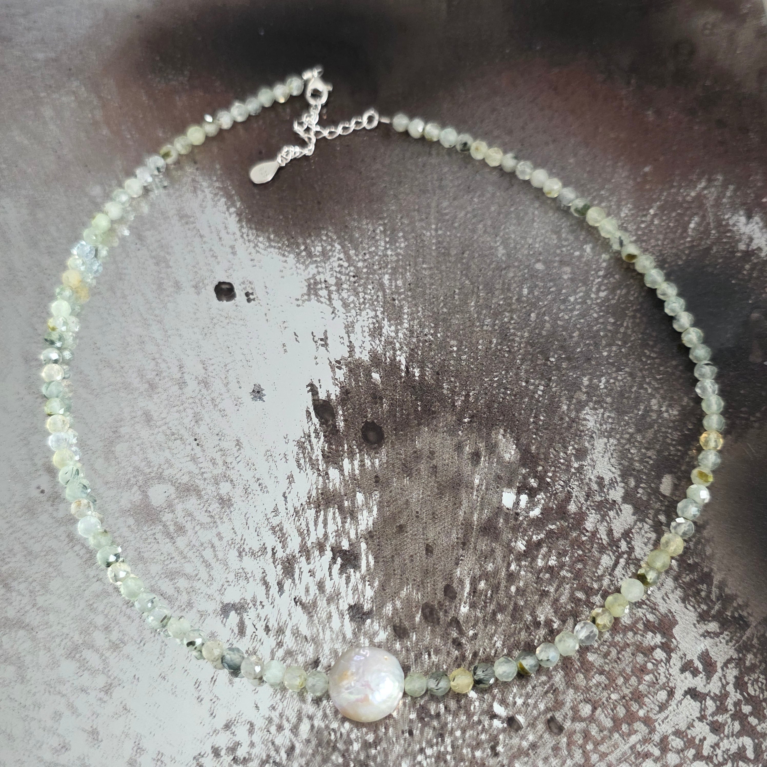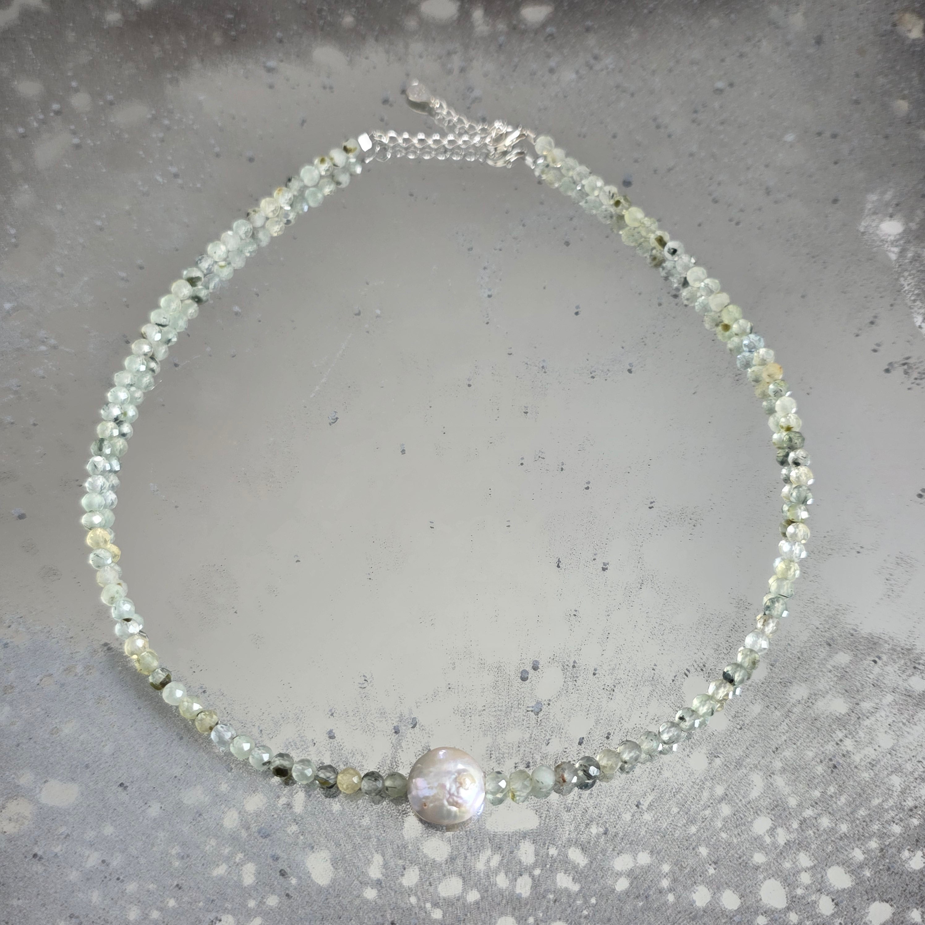 Ένα λεπτεπίλεπτο και φωτεινό κολιέ, φτιαγμένο από φαγέτες σφαίρες πρενίτη 4 mm, τοποθετημένες με λεπτότητα σε ήρεμο και ισορροπημένο ρυθμό. Στο κέντρο της σύνθεσης, ένα φυσικό μαργαριτάρι περίπου 1 cm γίνεται το σημείο ηρεμίας και κομψότητας, προσθέτοντας στο κόσμημα μια νότα διαχρονικής κομψότητας.