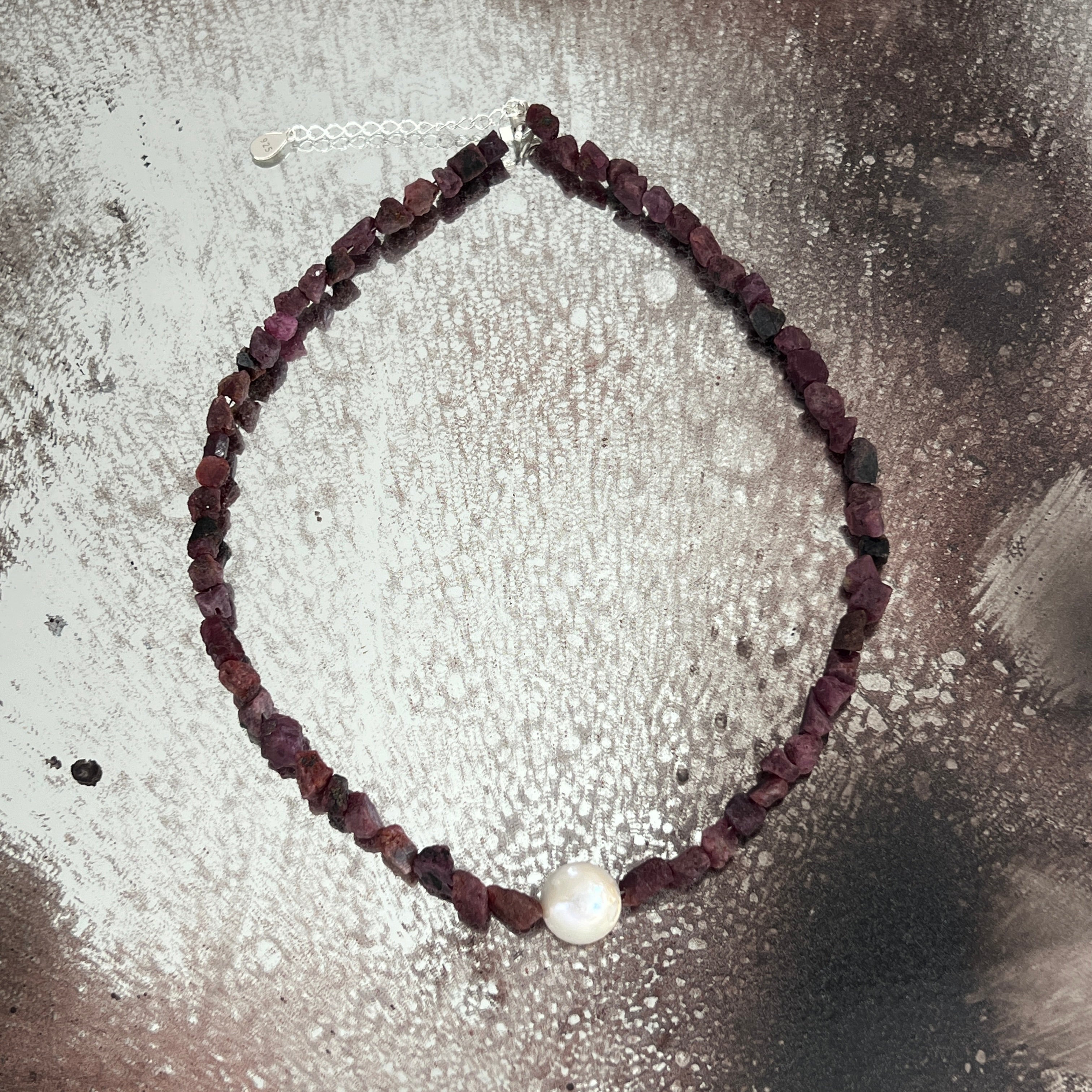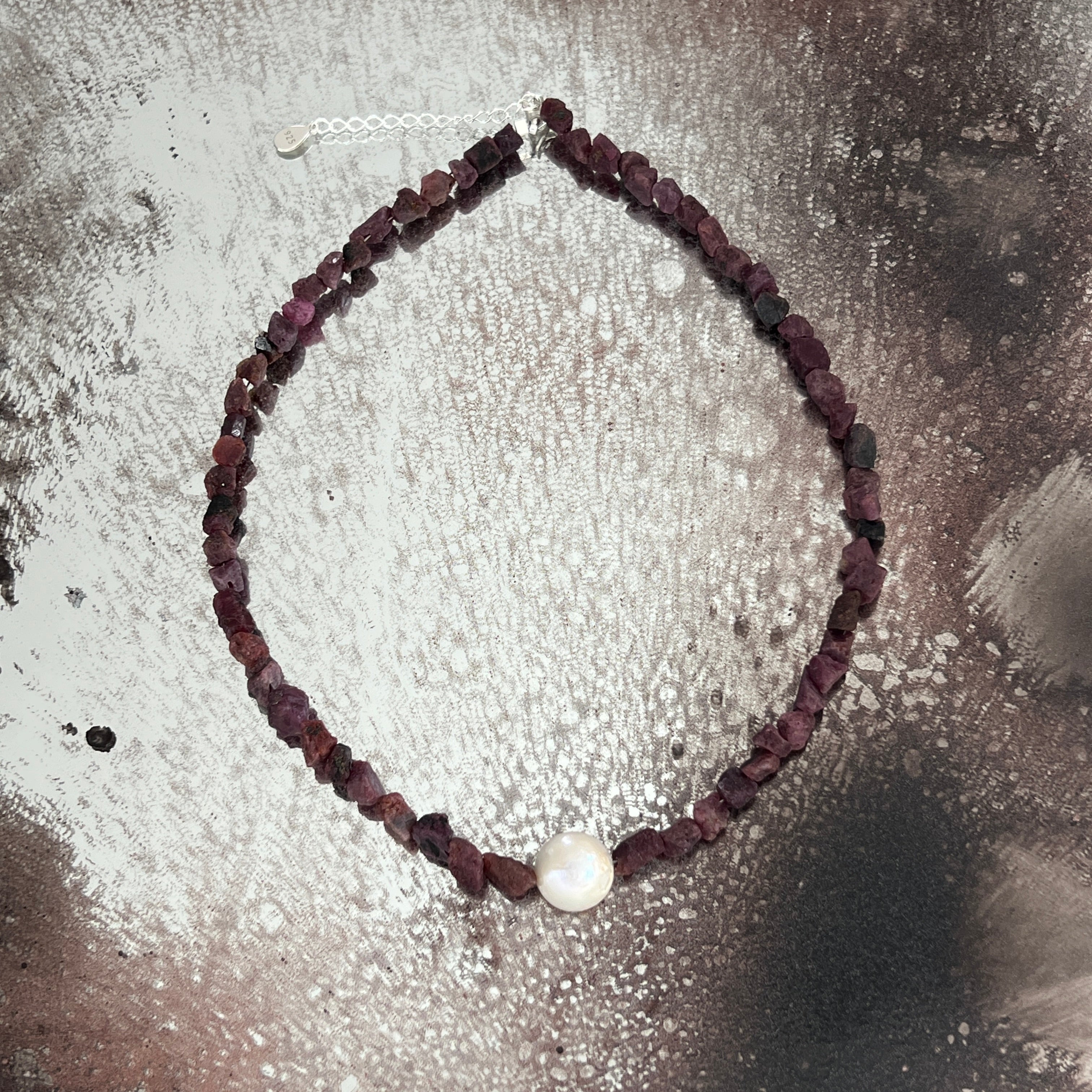 Υλικά: φυσικό ρουμπίνι, ακατέργαστοι λίθοι 6 x 3 mm, μαργαριτάρι 10 mm, ασήμι 925