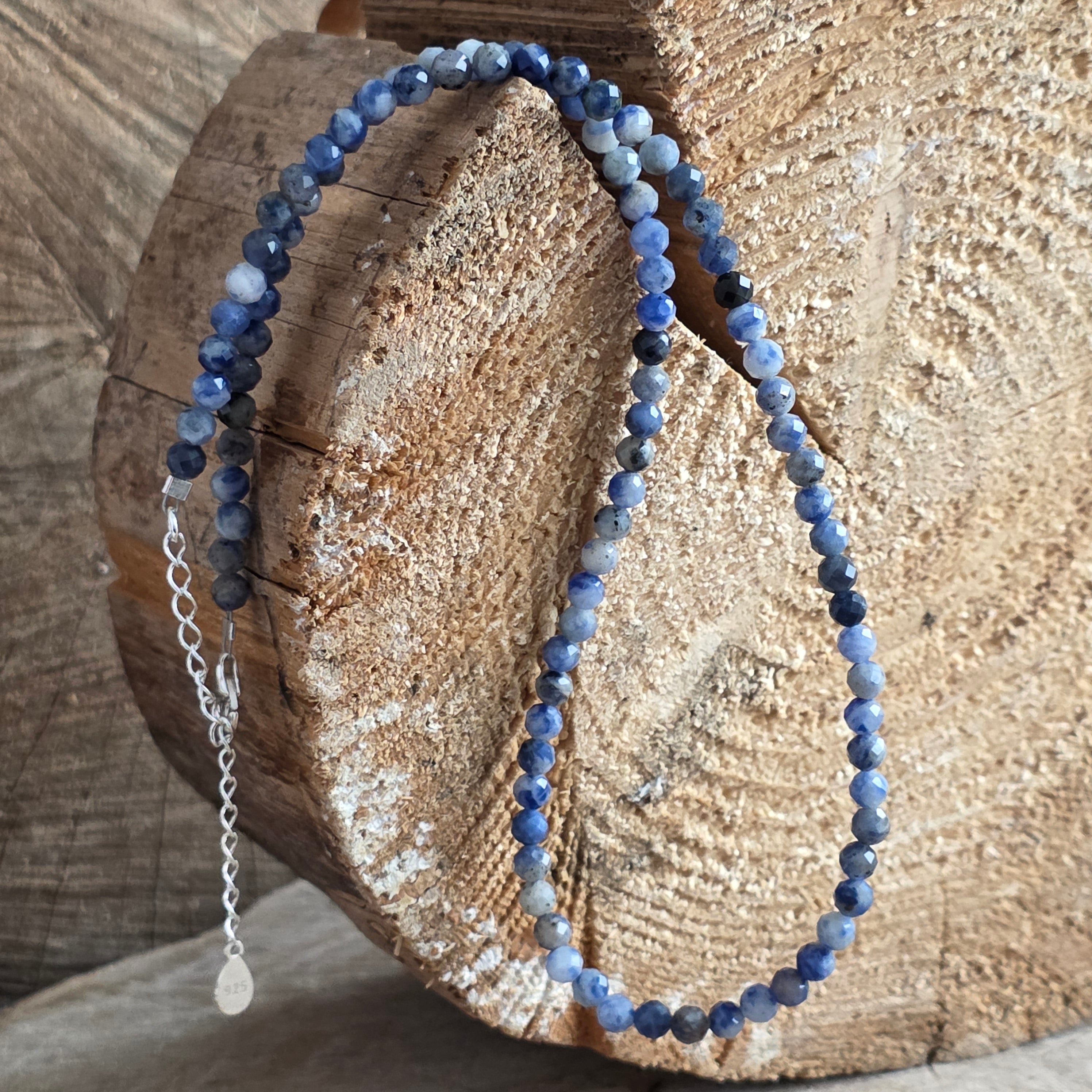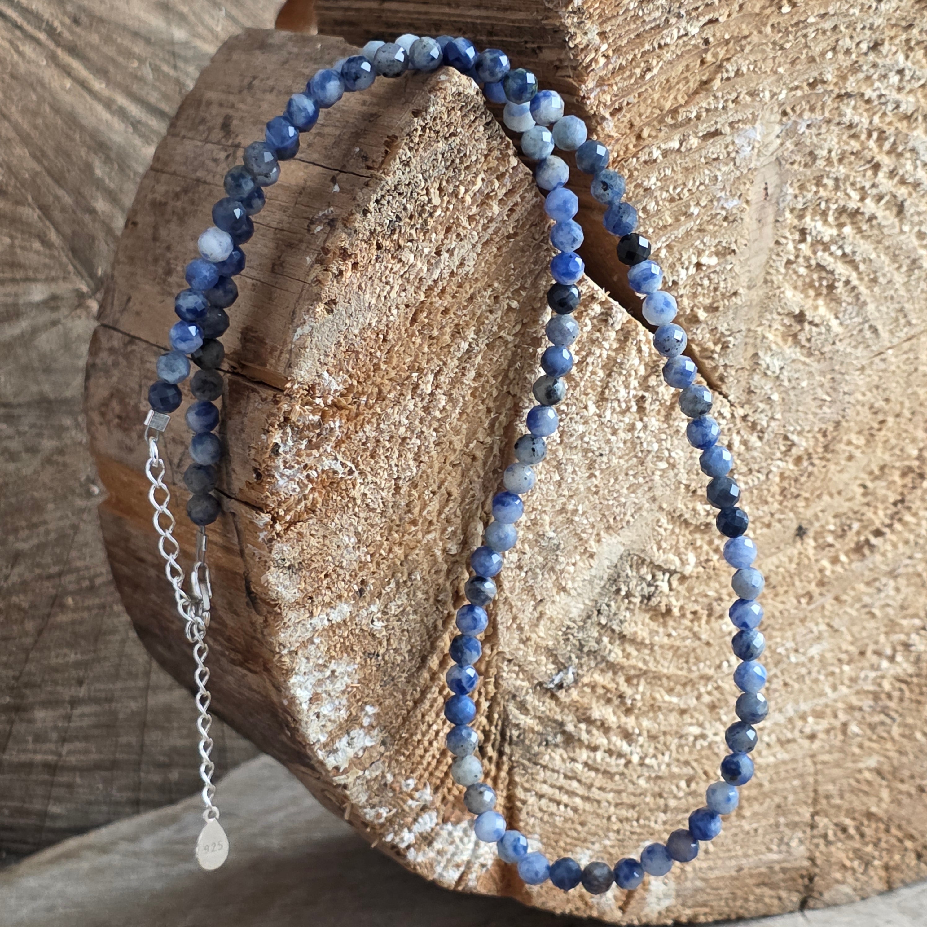 Ένα κολιέ που φέρνει τη γαλήνη του ουρανού και το βάθος της καθαρής σκέψης. Ο φυσικός σοδαλίτης κοπής 4 mm συνδυάζει βαθιές μπλε αποχρώσεις με λεπτές λευκές και γκρι νευρώσεις, δημιουργώντας ένα κομψό και χαλαρωτικό οπτικό παιχνίδι. Οι λεπτές κοπές αντανακλούν διακριτικά το φως, προσδίδοντας στο κόσμημα μια διακριτική λάμψη, τέλεια ισορροπημένη μεταξύ φινέτσας και φυσικότητας.