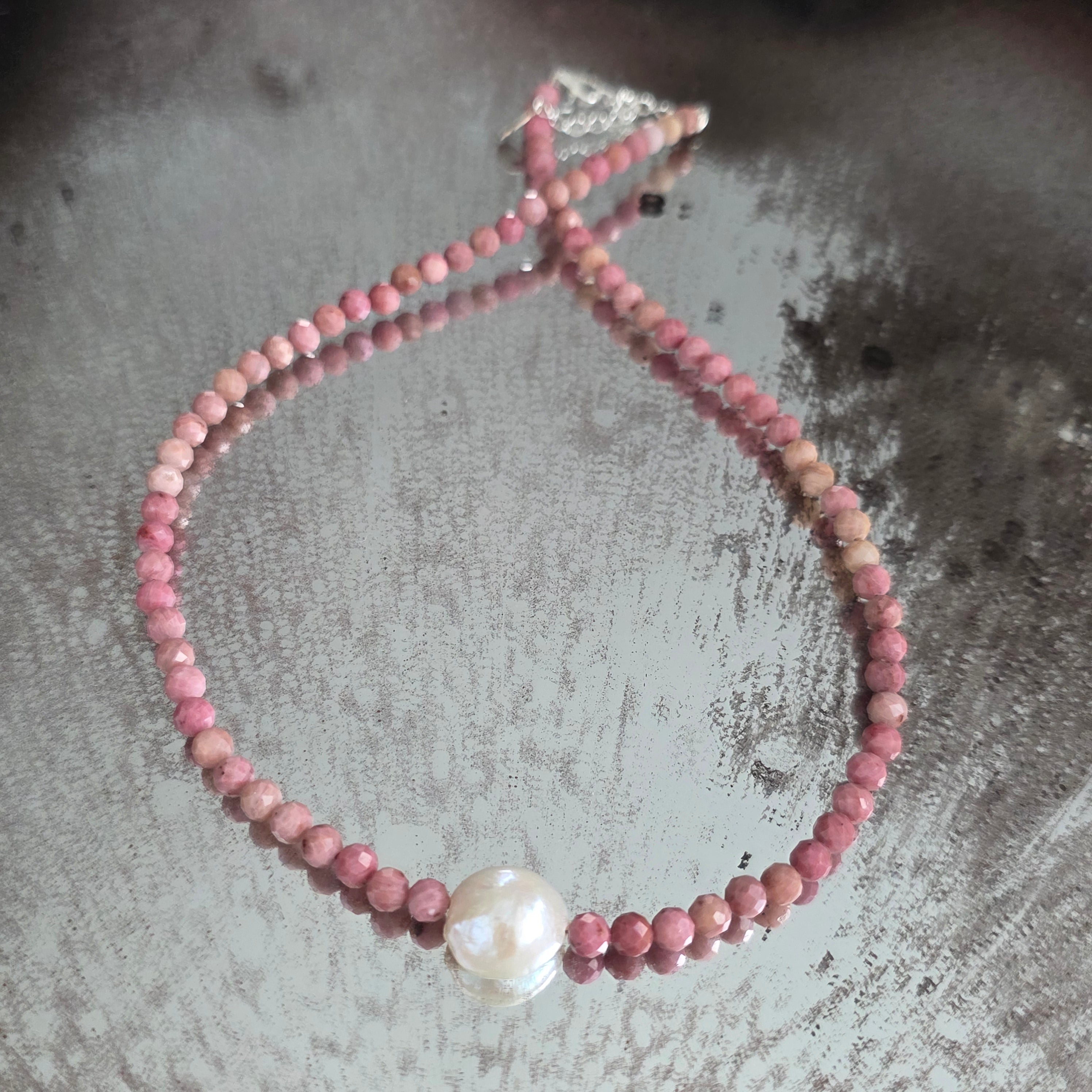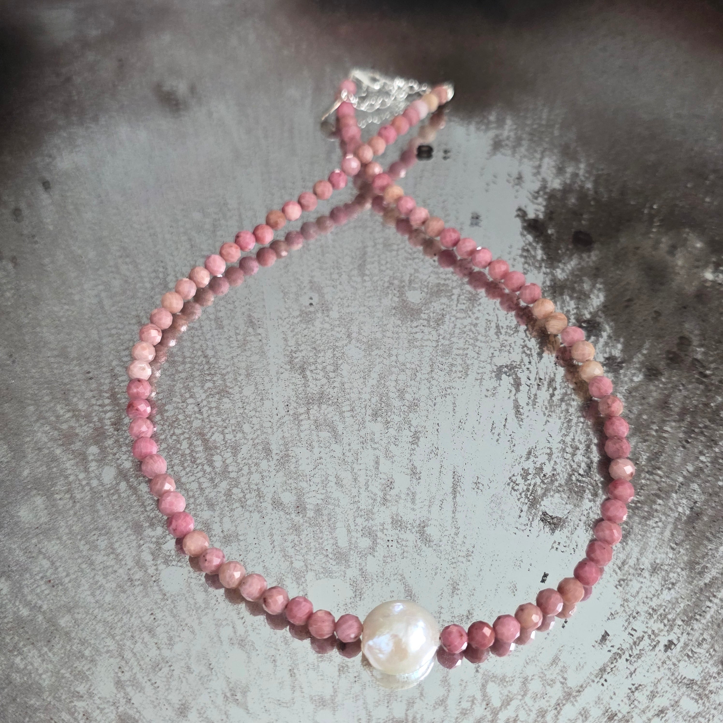 Ένα λεπτό και εκφραστικό κολιέ, φτιαγμένο από σφαίρες κομμένου τουλίτη 5 χλστ., αναδεικνυόμενες από ένα κεντρικό φυσικό μαργαριτάρι 1 εκ., που προσθέτει ισορροπία και κομψότητα στη σύνθεση. Η αντίθεση μεταξύ του ζεστού ροζ του τουλίτη και του ήρεμου φωτός του μαργαριταριού δημιουργεί ένα κόσμημα με βαθιά θηλυκή και αρμονική ενέργεια.