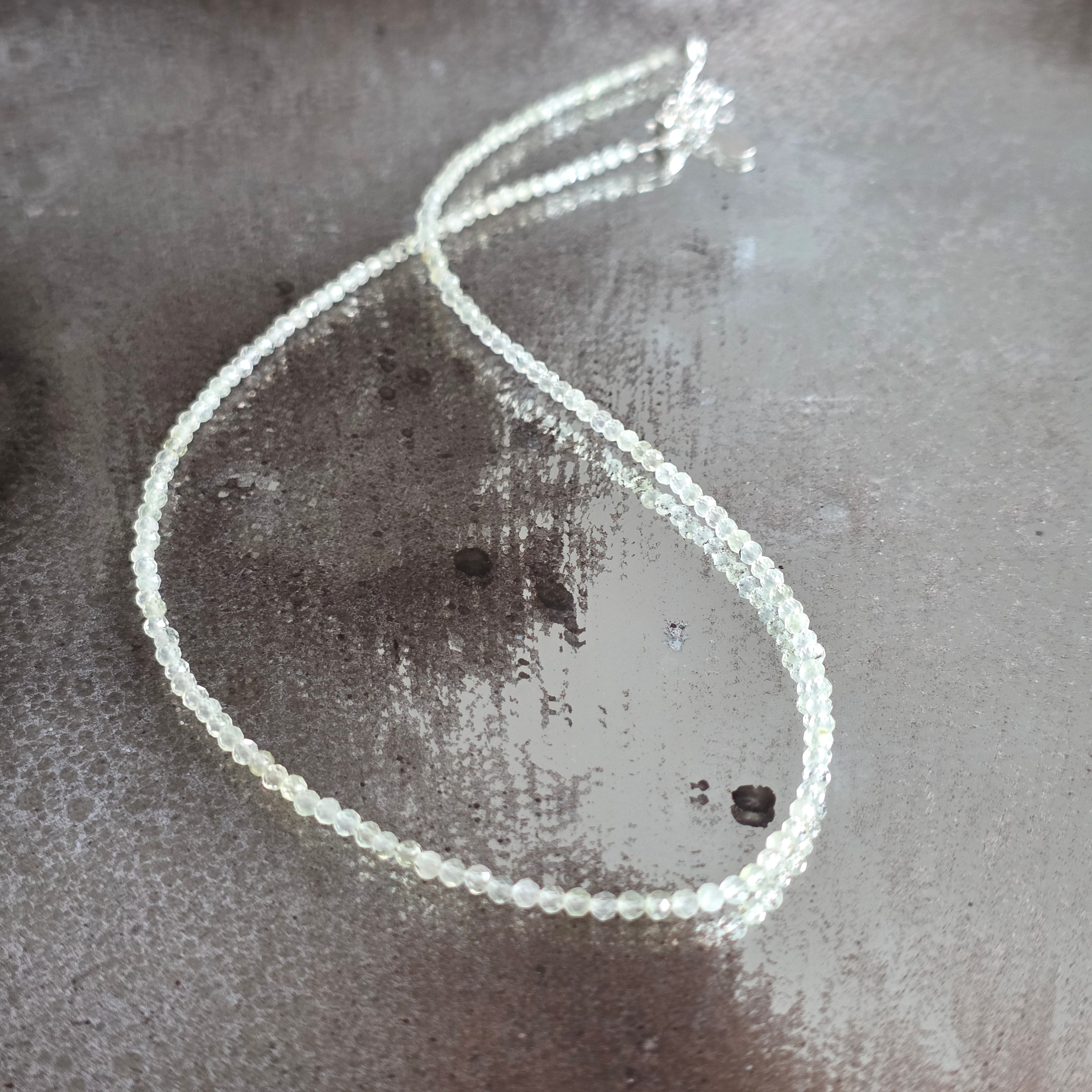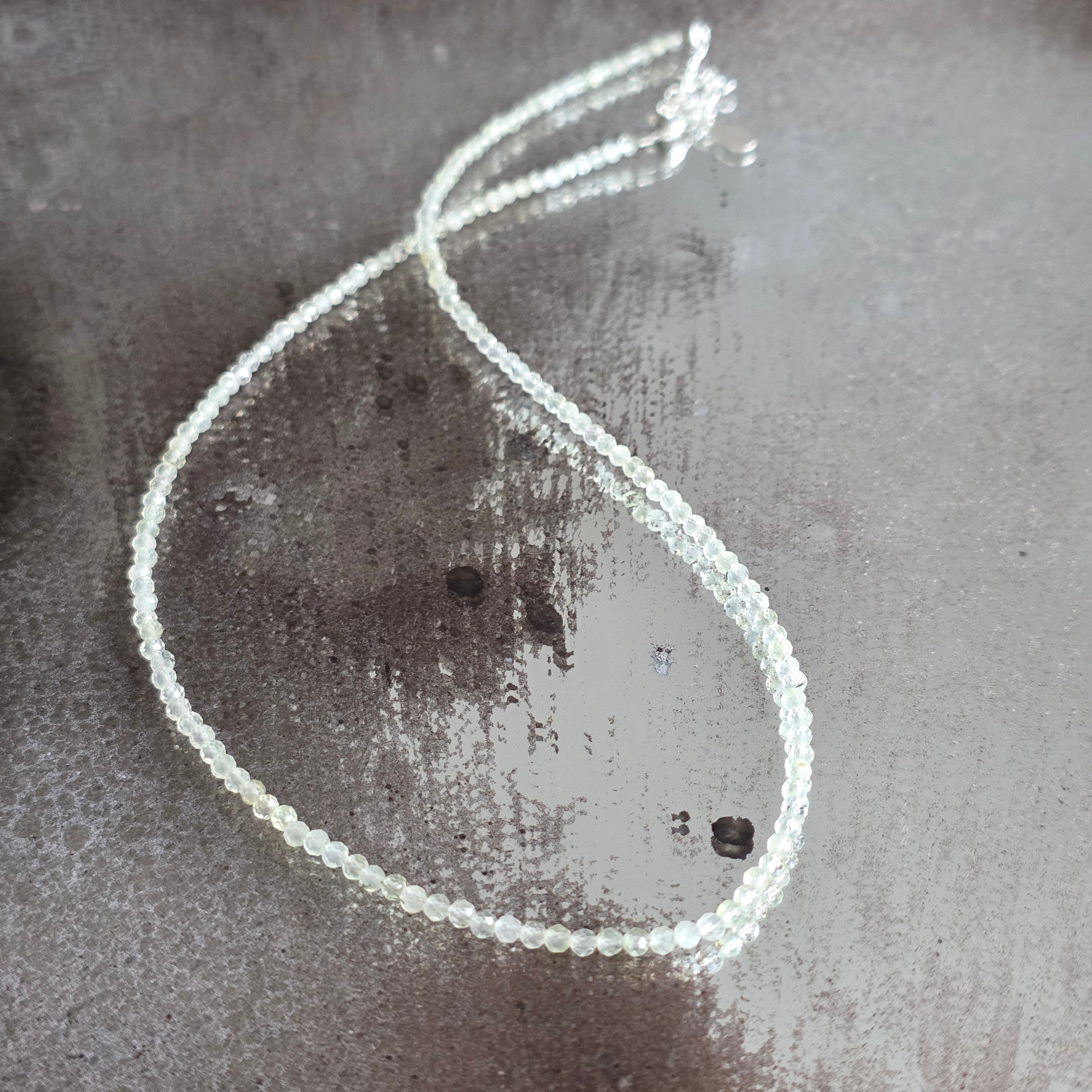 Ένα κολιέ σαν παράθυρο ανοιχτό στο φως – ζωντανό, καθαρό, παιχνιδιάρικο και βαθύ ταυτόχρονα. Οι χαραγμένες χάντρες από πράσινο φθορίτη 3 χλστ. λάμπουν σε αποχρώσεις του πράσινου, όπως μια γέφυρα ανάμεσα στο συναίσθημα και τη λογική, ανάμεσα στο όνειρο και τη διαύγεια.