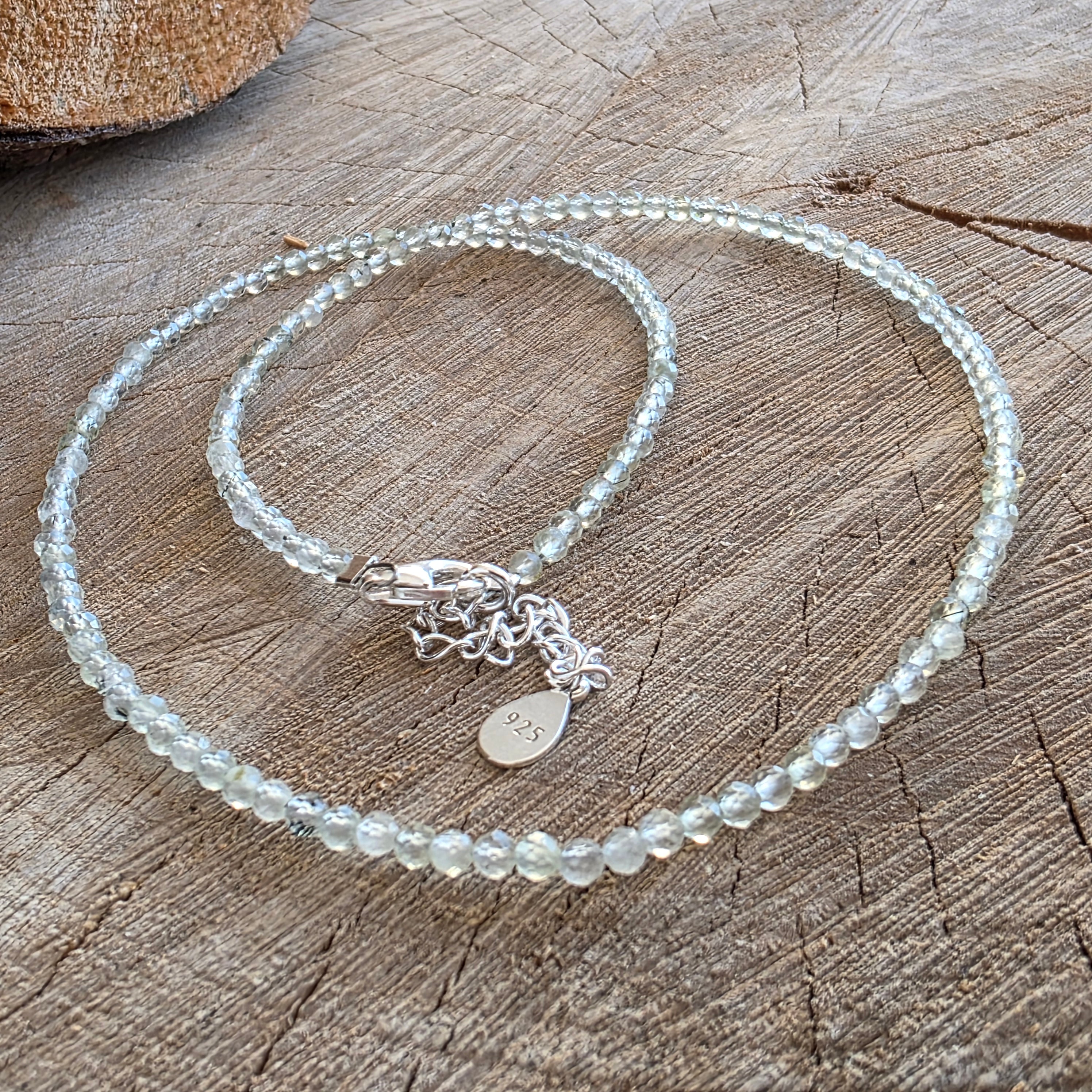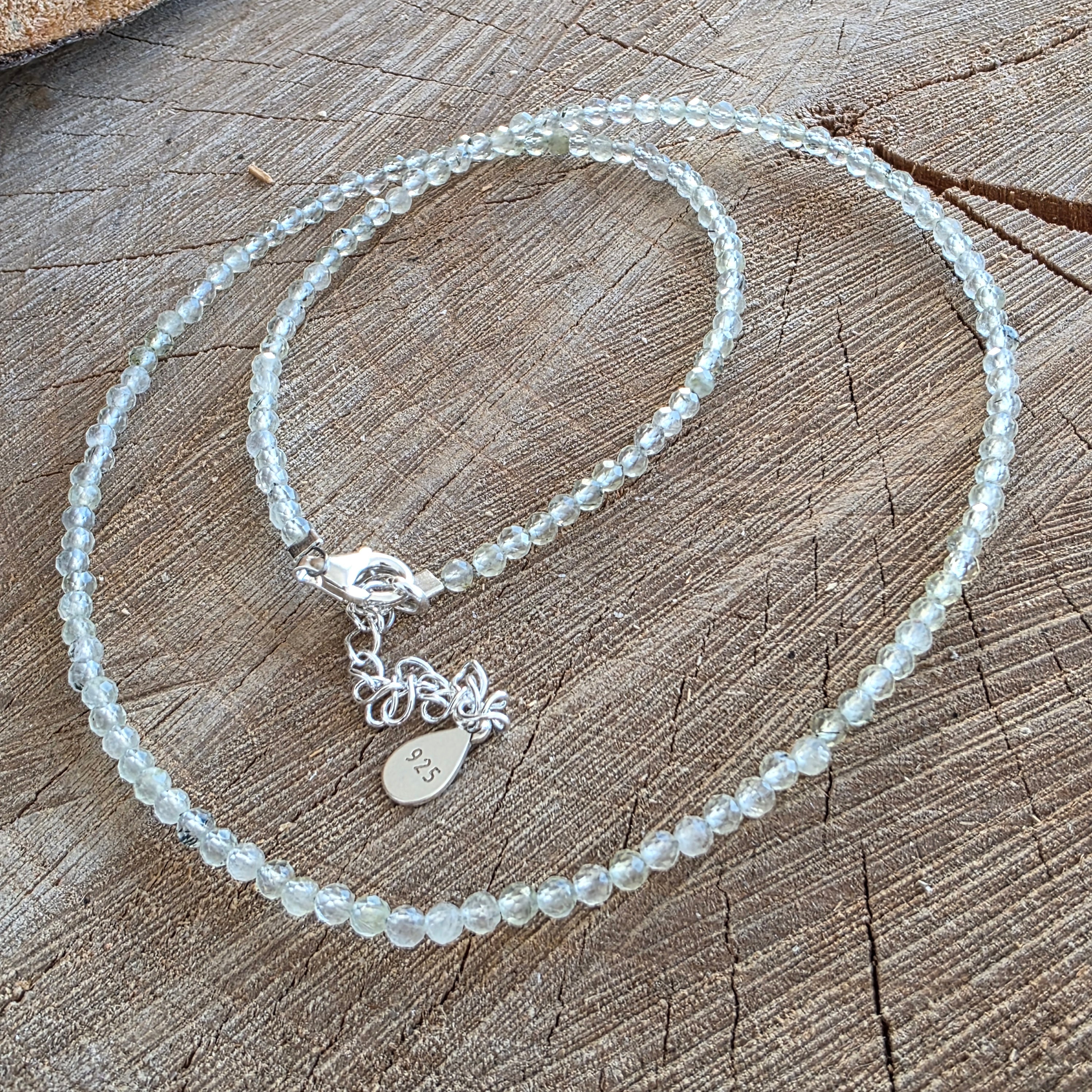 Ένα κολιέ σαν ένα άνοιχτο παράθυρο στο φως – ζωντανό, καθαρό, παιχνιδιάρικο και βαθύ ταυτόχρονα. Οι πολύγωνες χάντρες φθορίτη ουράνιου τόξου 6 χιλιοστών αστράφτουν σε αποχρώσεις που χορεύουν ανάμεσα στο μοβ, πράσινο, μπλε και ροζ, σαν μια γέφυρα ανάμεσα στο συναίσθημα και τη λογική, ανάμεσα στο όνειρο και την επικρατούσα συνείδηση.