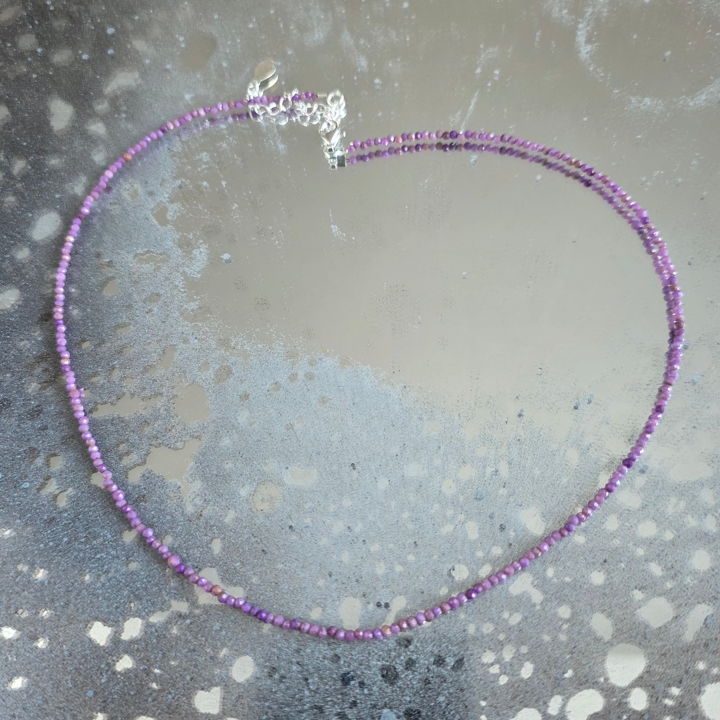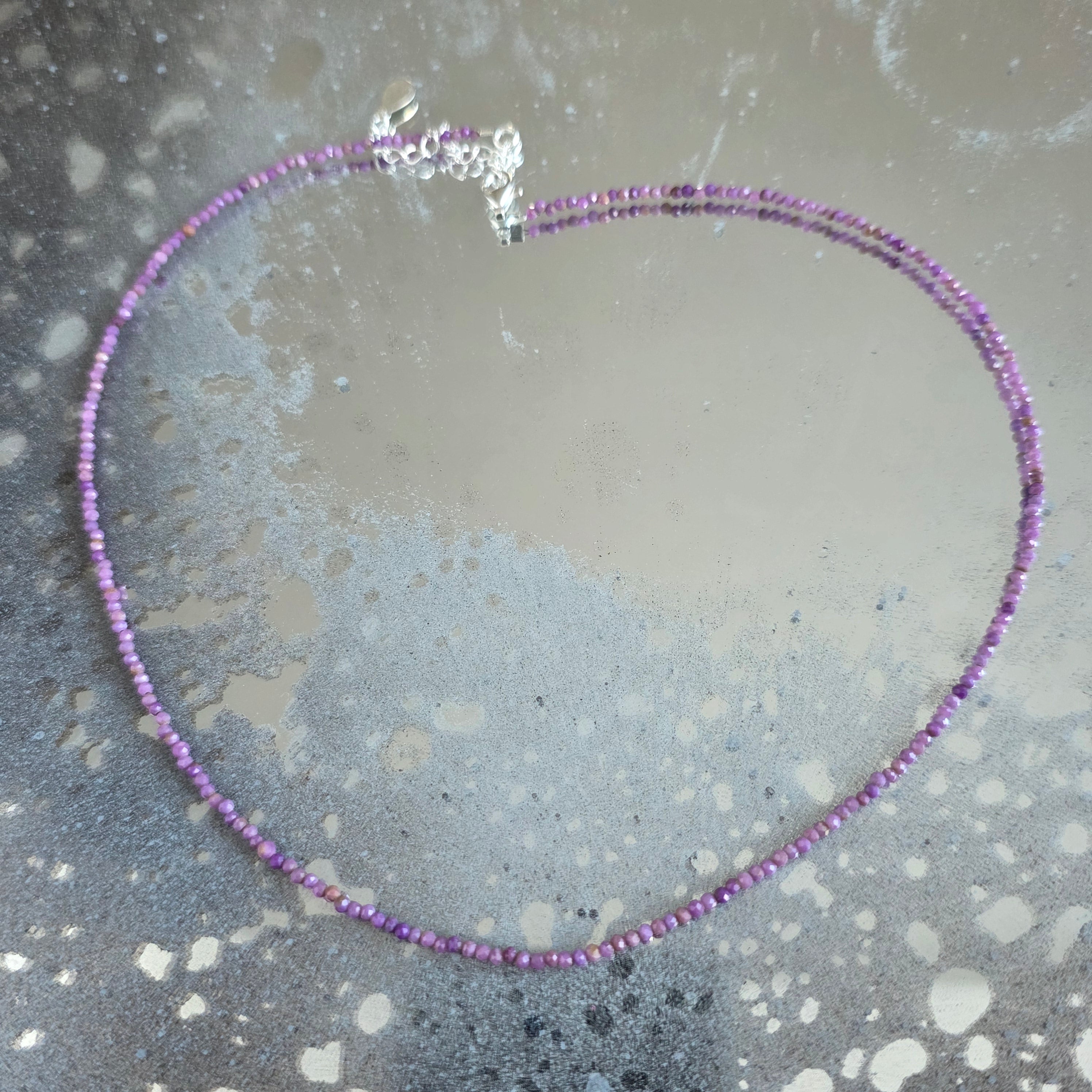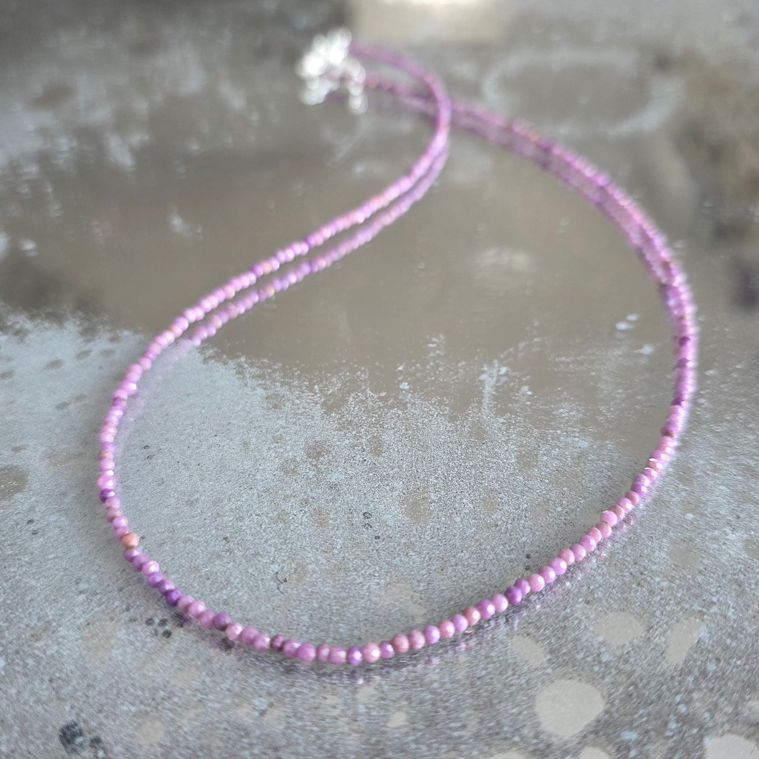 Ένα λεπτό και ισορροπημένο κολιέ, φτιαγμένο από στρογγυλά σφαιρίδια φωσφοσίδηρου 2 mm, τοποθετημένα σε μια λεπτή διαδοχή που δημιουργεί μια συνεχόμενη, διακριτικά λαμπερή γραμμή. Οι αποχρώσεις του απαλού μωβ, μερικές φορές με λιλά ή ροζ σκόνης λεπτομέρειες, προσδίδουν στο κόσμημα μια απαλότητα και εκλεπτυσμένη παρουσία, εύκολη να ενταχθεί τόσο σε καθημερινά σύνολα όσο και σε πιο κομψούς συνδυασμούς. Η λεπτή κοπή αιχμαλωτίζει το φως χωρίς να το κυριαρχεί, διατηρώντας μια ήρεμη και τακτοποιημένη αίσθηση.