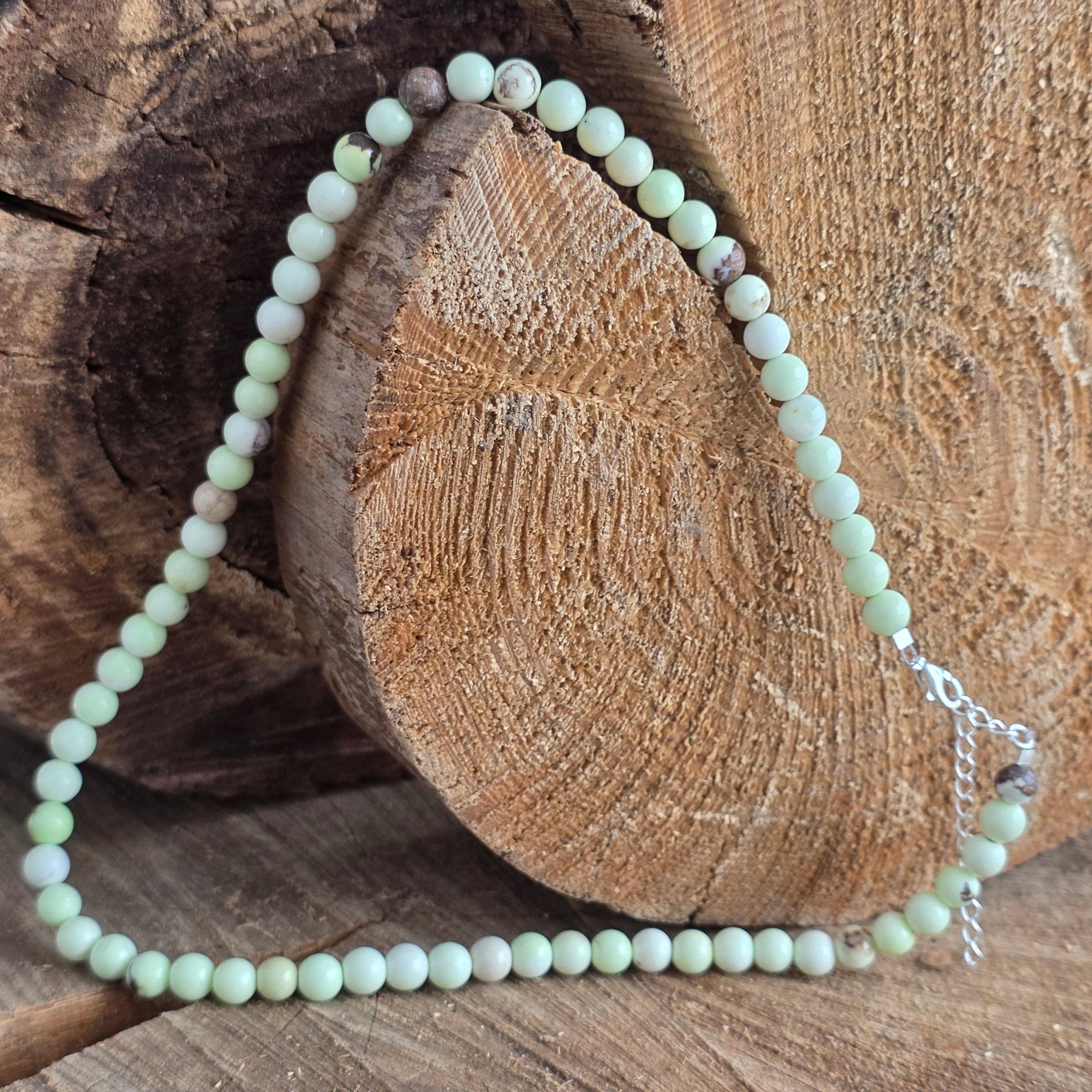 Ένα κολιέ που φέρει το φως του καλοκαιριού και την τρυφερότητα μιας νέας αρχής. Ο χρυσοπράζιος, με το φωτεινό και διάφανο πράσινό του, είναι μια πέτρα της ανοιχτής καρδιάς — σύμβολο της αγνής αγάπης, της συμπόνιας και της ανανέωσης της ψυχής. Οι κεραμικές φασέτες των 3 mm αιχμαλωτίζουν κάθε ακτίνα φωτός, μετατρέποντας το κολιέ σε ένα ζωντανό, φωτεινό και λεπτεπίλεπτο κόσμημα.