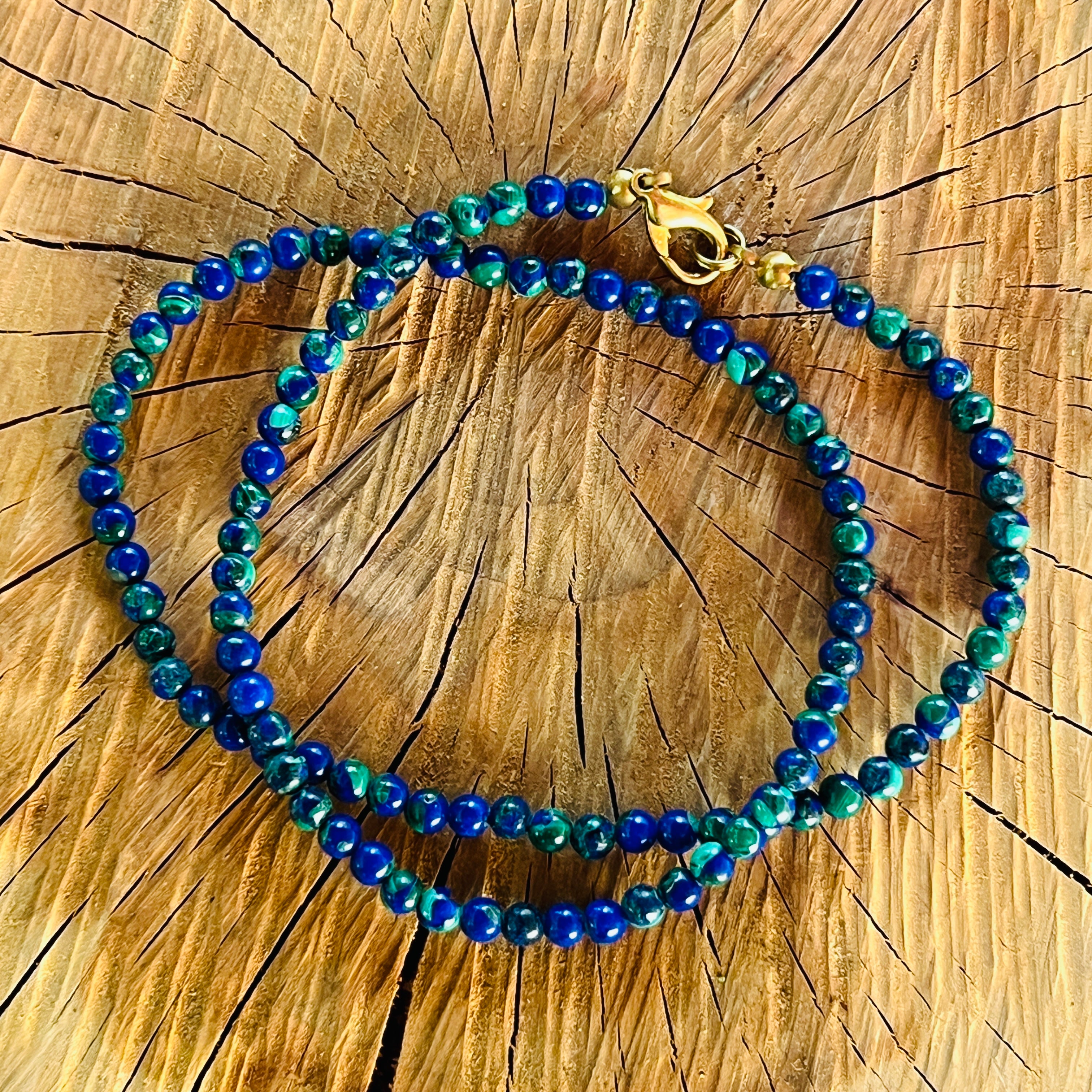 Αυτό το κολιέ συγκεντρώνει δύο από τις πιο συναρπαστικές ημιπολιτερικές πέτρες: Μαλαχίτης, με το έντονο πράσινο σταυρωμένο από υπνωτικά δαχτυλίδια, και Αζουριτούλ, με το βαθύ μπλε του, ως κομμάτι του νυχτερινού ουρανού. Μαζί, δημιουργούν ένα κόσμημα σπάνιων ομορφιάς και μοναδικής δόνησης.
