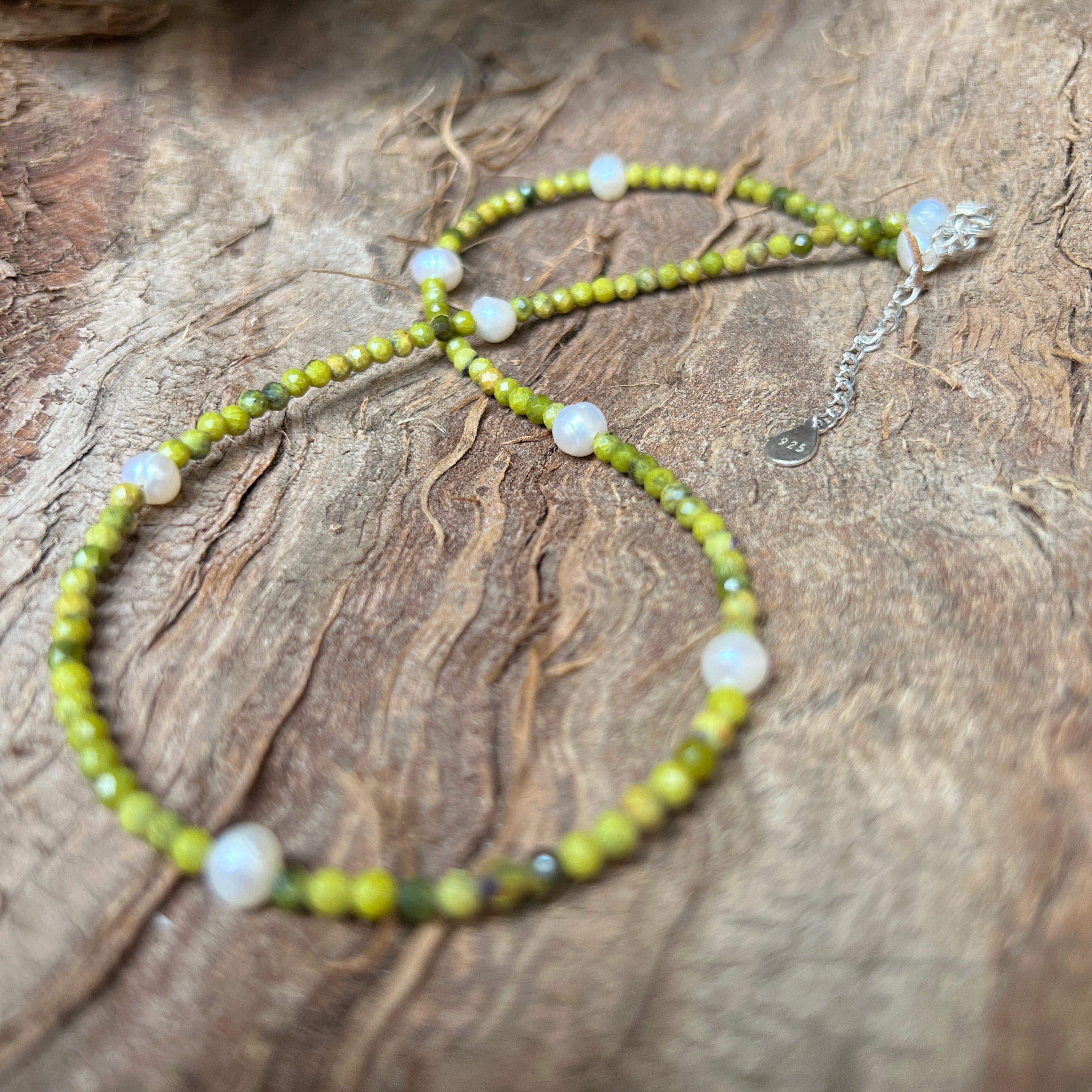 Ο πράσινος νεφρίτης είναι η πέτρα της εσωτερικής ειρήνης, της ισορροπημένης ζωτικότητας και της τύχης που προέρχεται από τη γαλήνια ψυχή. Λέγεται ότι προστατεύει την καρδιά, διεγείρει την απαλή σοφία και υποστηρίζει τη συναισθηματική αναγέννηση. Με κάθε μαργαριτάρι, το κολιέ αποκτά μια ήρεμη αλλά ζωντανή δόνηση σταθερότητας.