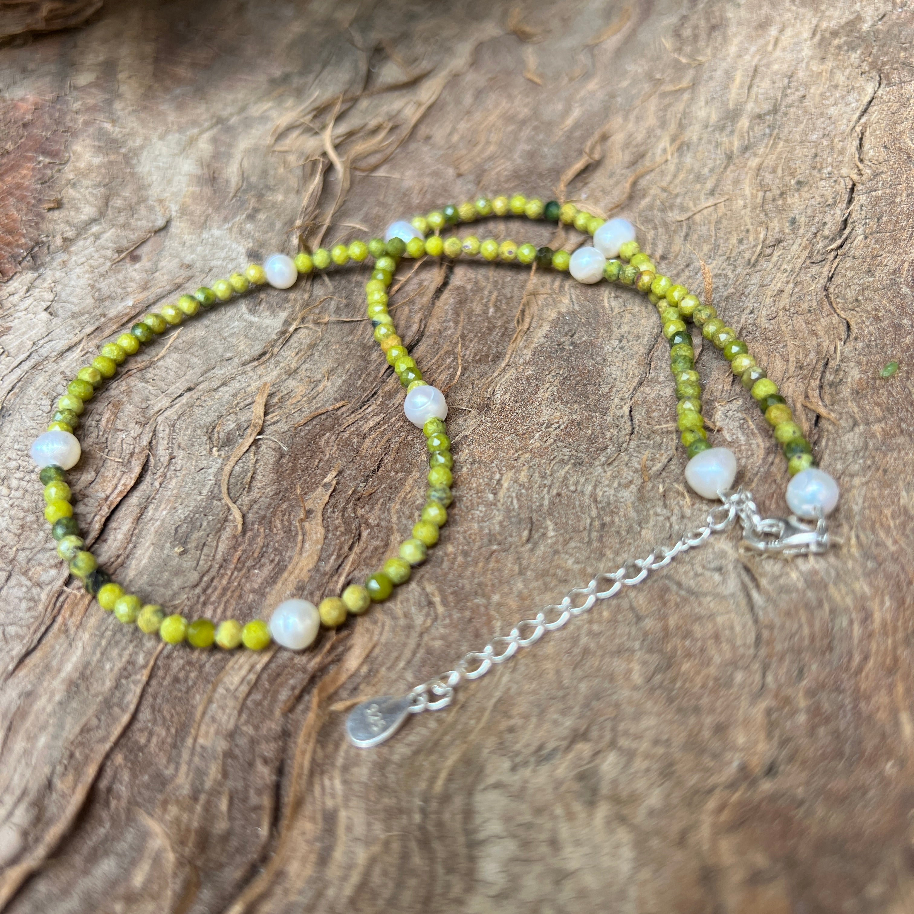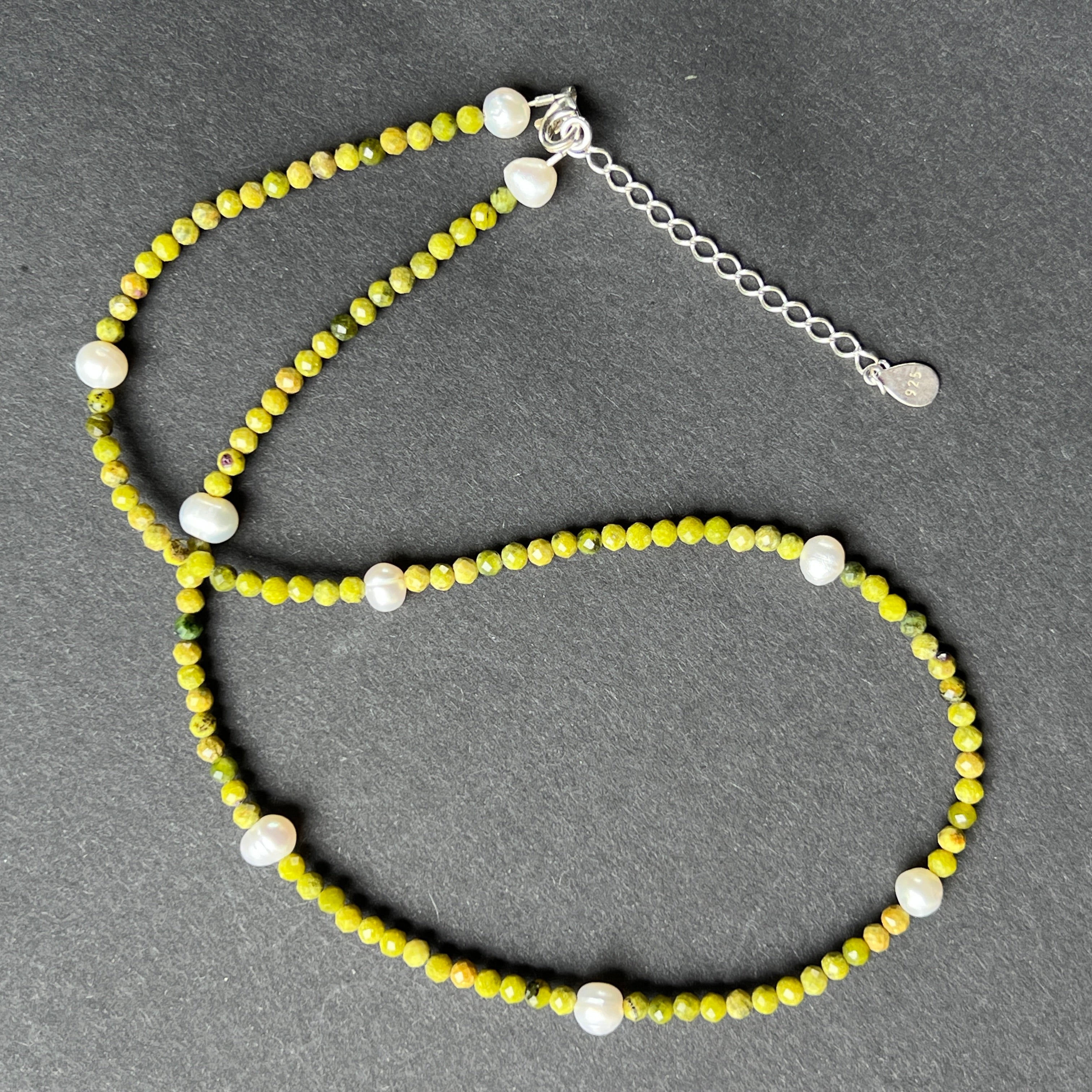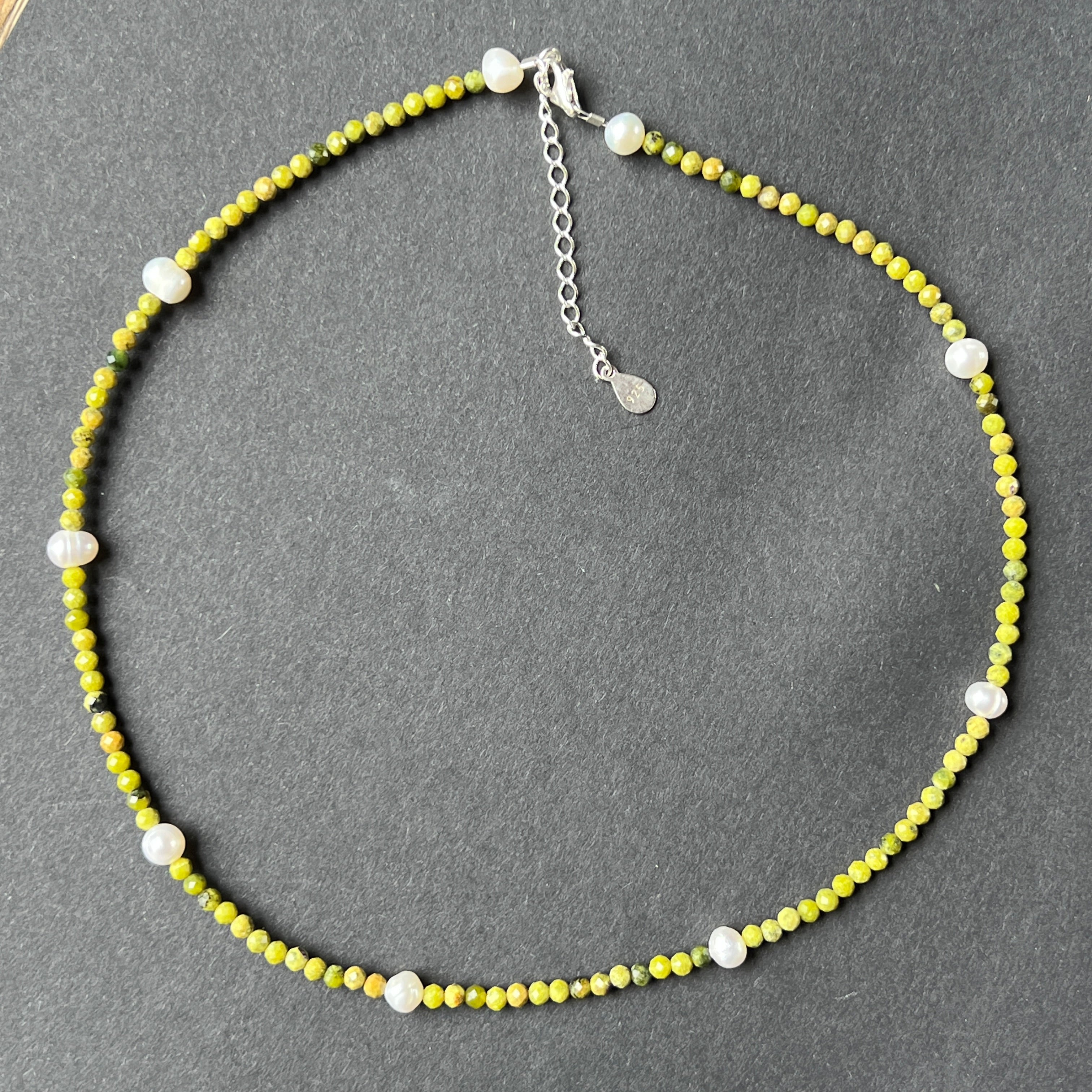 Ένα κολιέ που αποπνέει παράδοση, φρεσκάδα και ισορροπία – σαν ένας σιωπηλός κήπος την αυγή, γεμάτος δροσιά και υπόσχεση. Οι πολύπλευρες χάντρες από πράσινο νεφρίτη 3 mm, που ζωντανεύουν από τις στρογγυλές πινελιές των 4 mm, σχεδιάζουν έναν λεπτό και ζωντανό οπτικό ρυθμό, σαν διαλογισμό εν κινήσει.