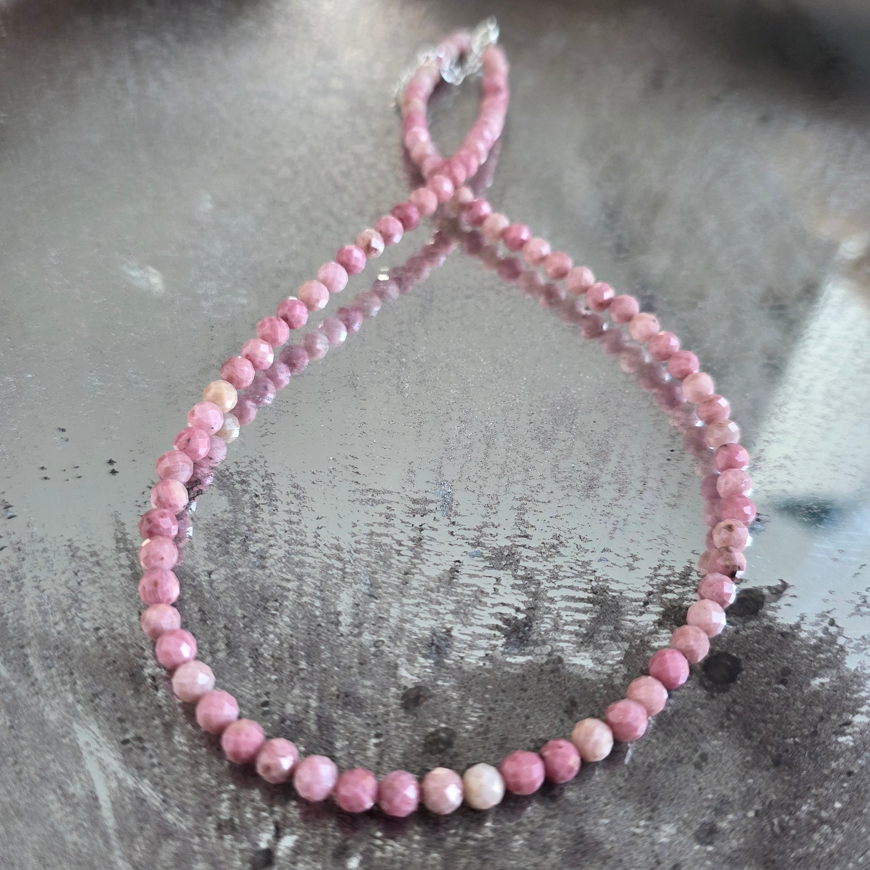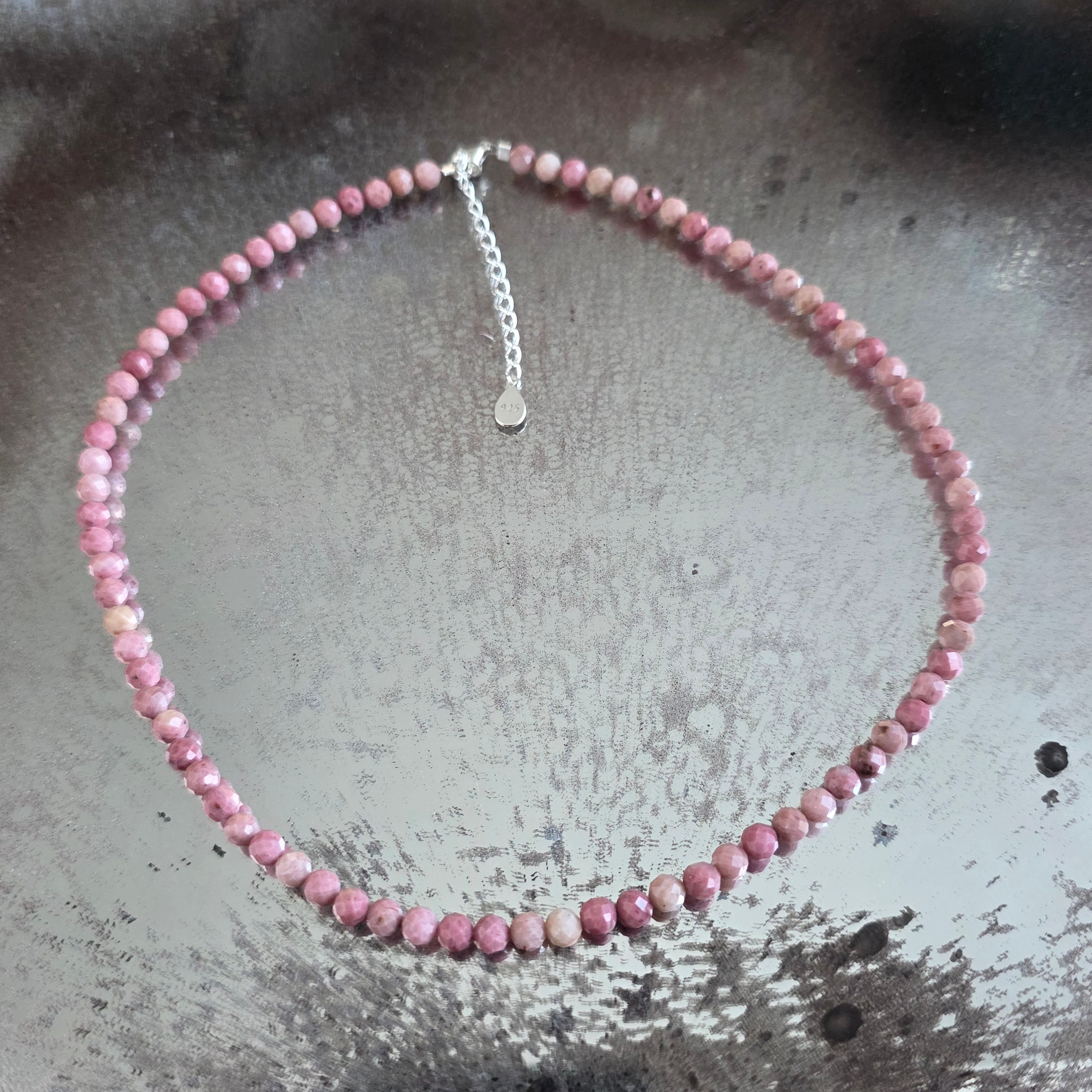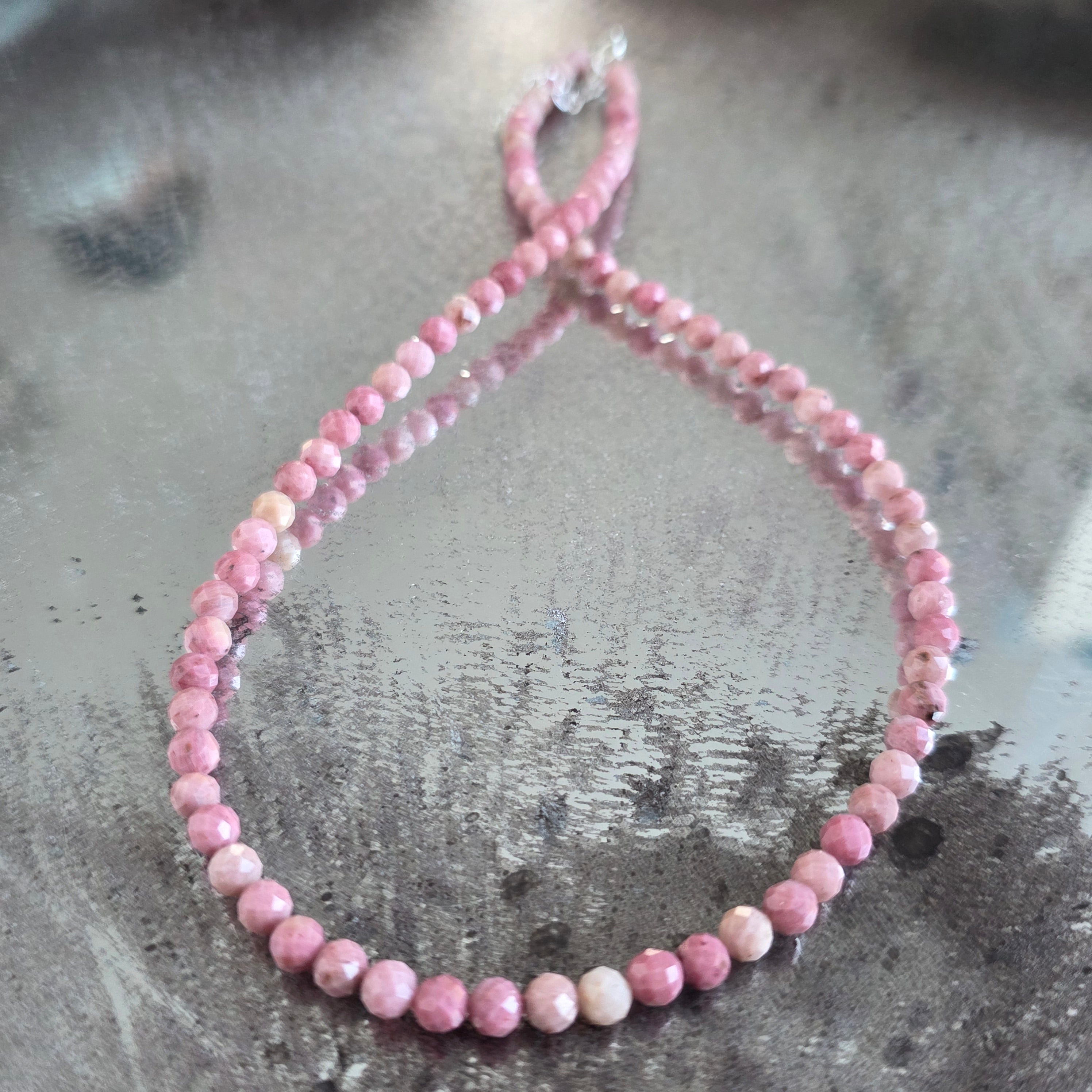 Ένα κολιέ με ζεστή και εκφραστική παρουσία, φτιαγμένο από φιοριτισμένες χάντρες τουλίτη 4 mm, που σχηματίζουν μια ισορροπημένη και γεμάτη ζωντάνια γραμμή γύρω από το λαιμό. Οι έντονες ροζ αποχρώσεις, με ελαφρώς ακανόνιστα φυσικά μοτίβα, δίνουν στο κόσμημα έναν αυθεντικό χαρακτήρα, ενώ το φιοριτισμένο φινίρισμα προσθέτει διακριτικές αντανακλάσεις, αναδεικνύοντας την ζωντανή υφή της πέτρας. Ο σχεδιασμός παραμένει καθαρός και καλά αναλογικός, αναδεικνύοντας το χρώμα και τη φυσική δομή του τουλίτη.